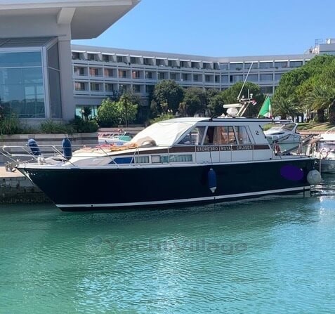 ..a piece by the Storebro Royal Cruiser 40 HT designer, 370 hp Volvo engines with 5-blade propellers, heating, radar, autopilot, GPS, 2 depth sounders, electric WC, year 1987, impeccable, very low fuel consumption, excellent seakeeping. New batteries, recently refitted Rina, all new bilge pumps.