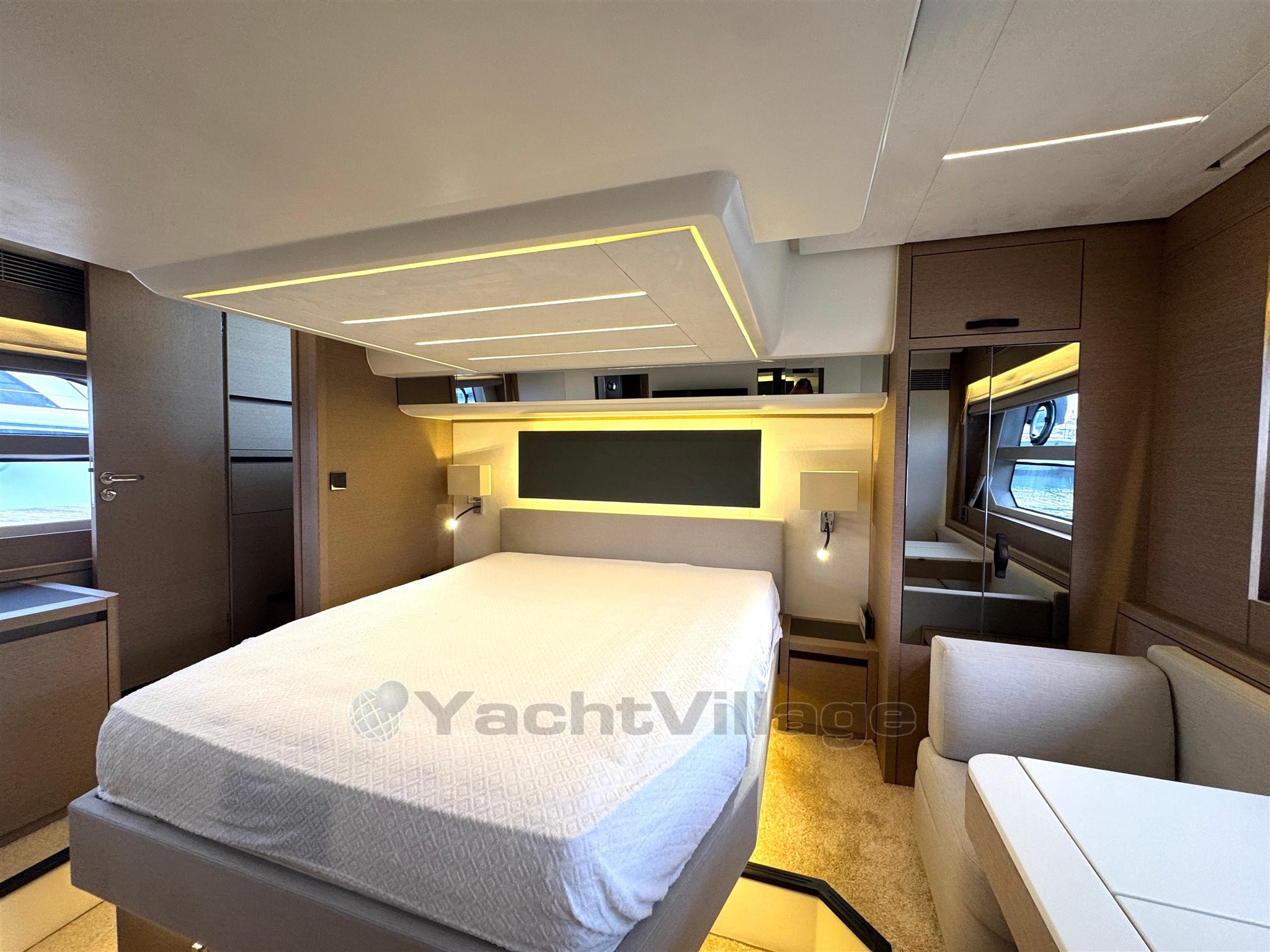 Cabine du propriétaire avec entrée privée, lit king size, armoires et commodes, canapé intérieur avec console maquillage, dressing communiquant avec la salle de bain privée avec lavabo, toilettes électriques et douche avec cabine séparée.