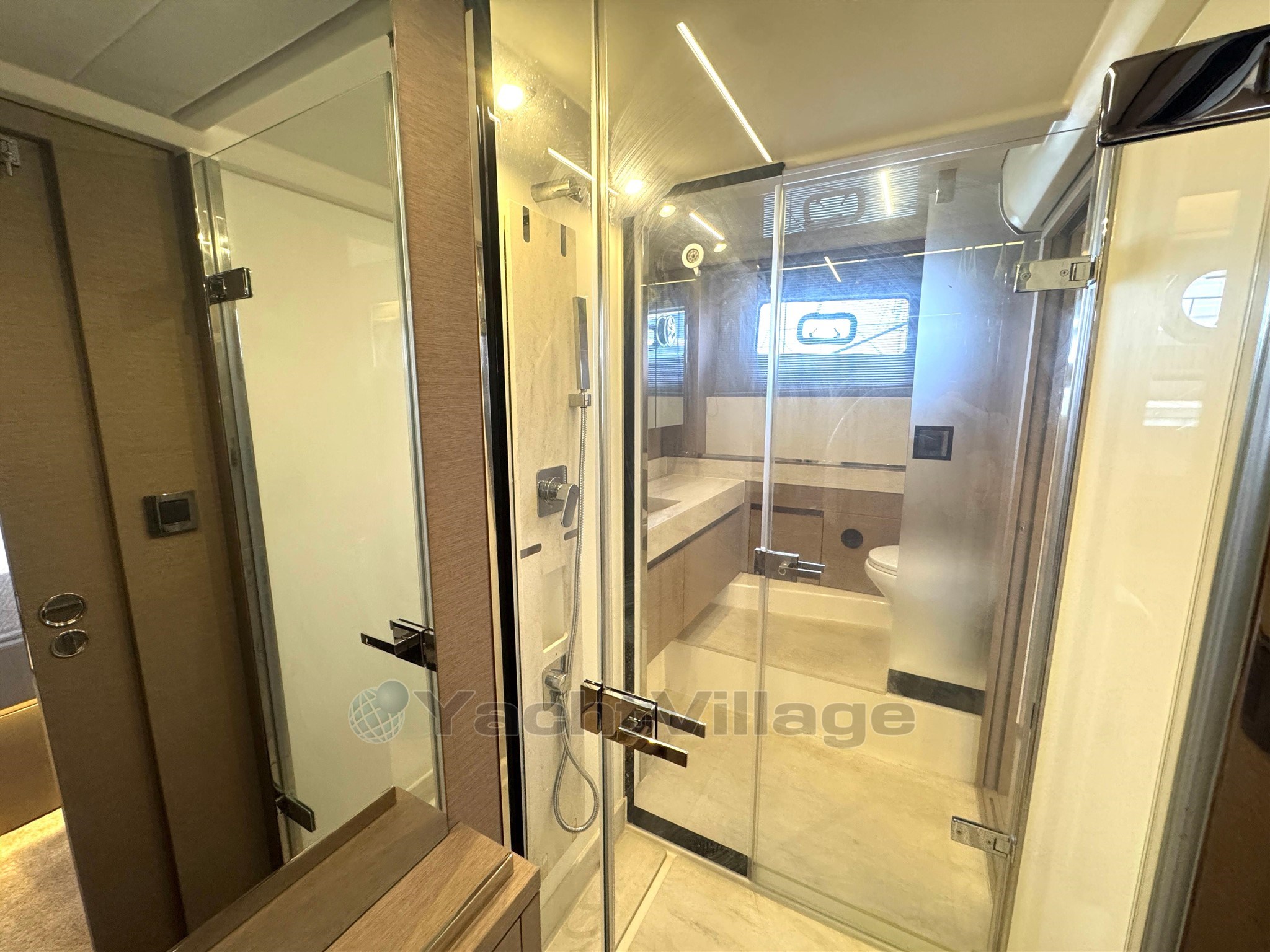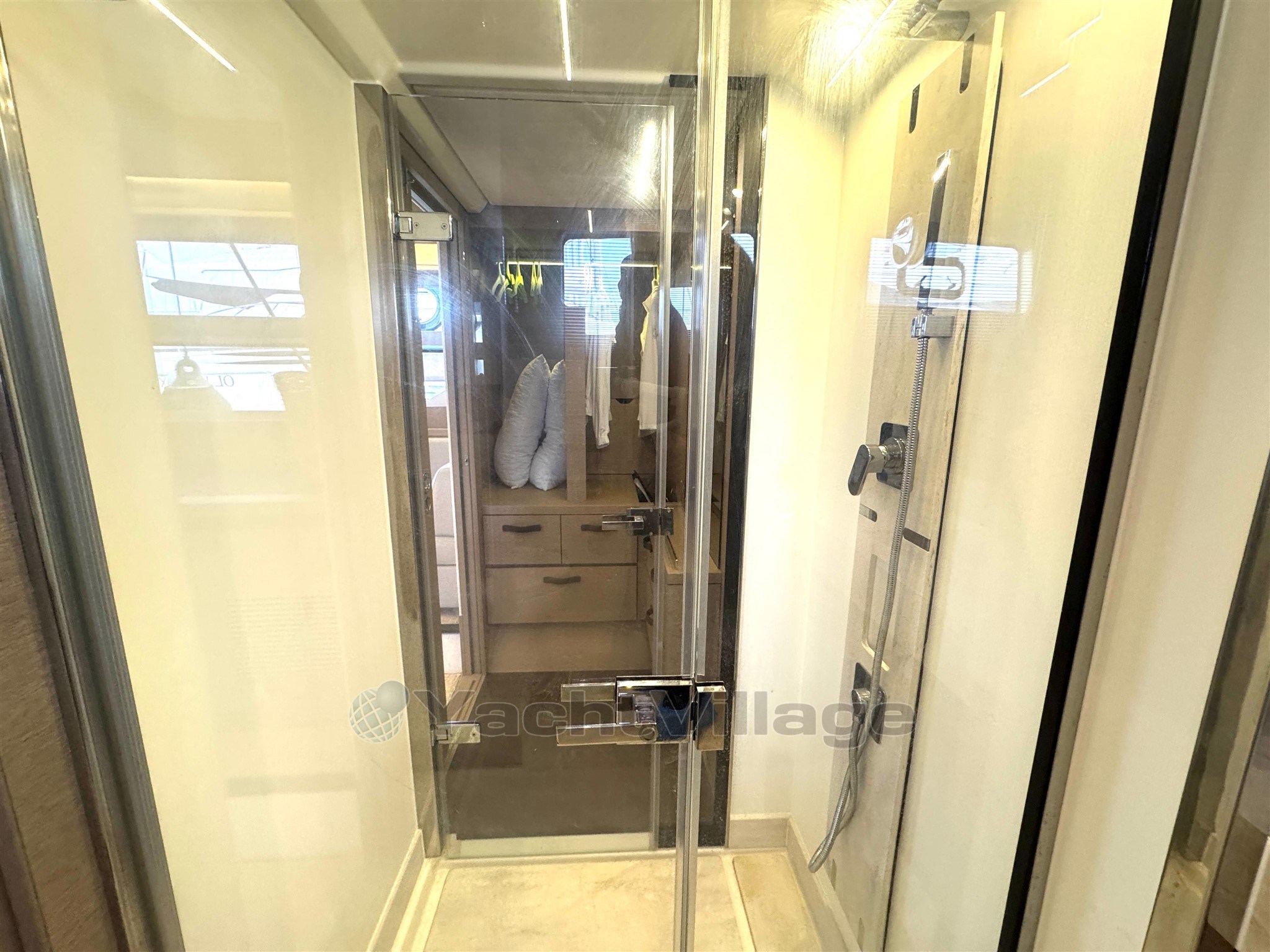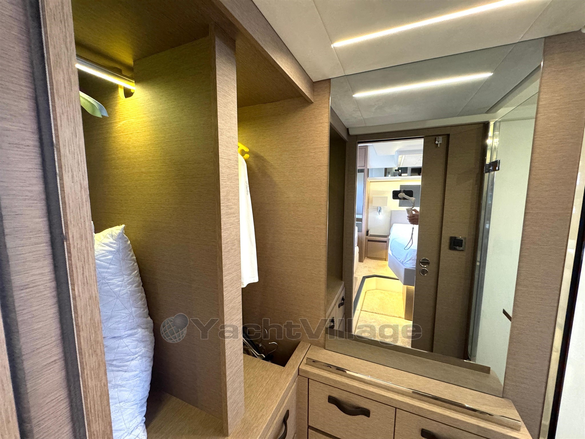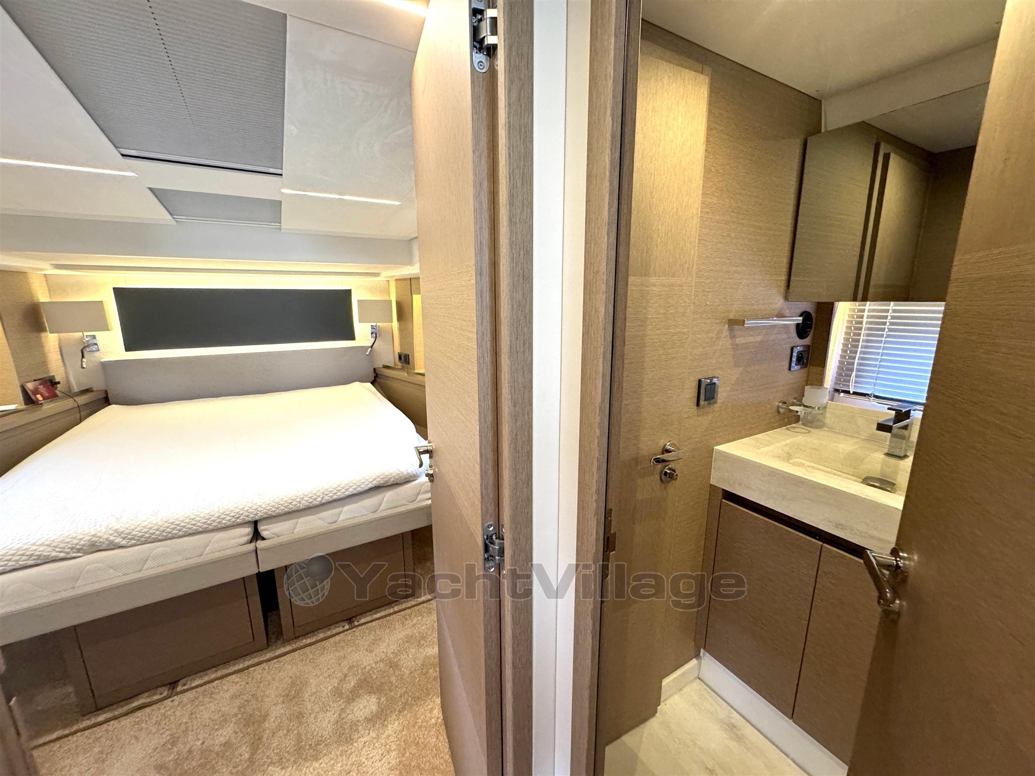 Cabine VIP à l’avant avec armes-robes, commodes et grande salle de bain privée avec lavabo, toilettes électriques et douche séparée.