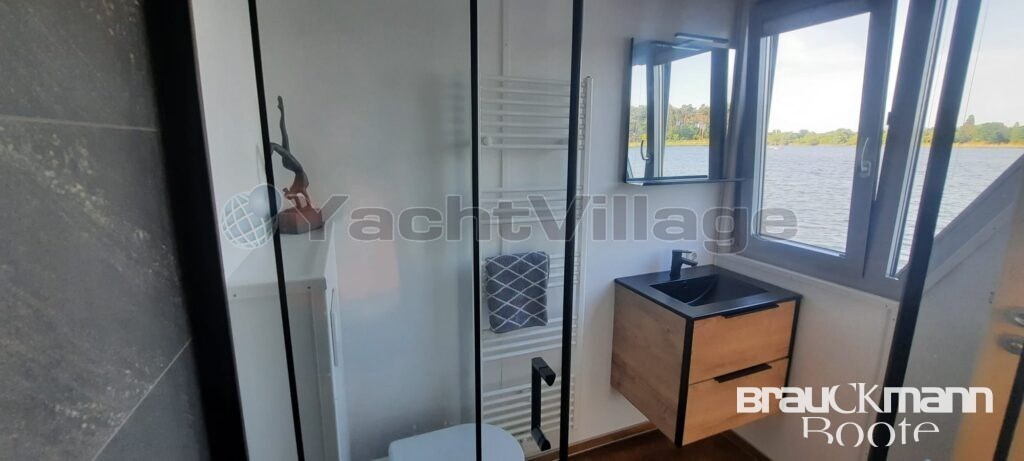 The bathroom has a toilet with a state-of-the-art organic sewage treatment plant (no chemical toilet), so that emptying the waste water tank is not necessary, a shower and a sink with mirror. The houseboat has a stern and roof terrace.