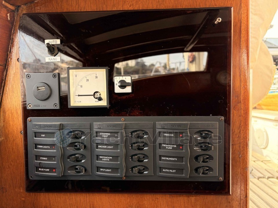 Sa coque en polyester renforcé, construite selon les normes Lloyd’s, est sublimée par un habillage en acajou et iroko. La chaleur dominante du bois à l’intérieur crée immédiatement une atmosphère accueillante et confortable.