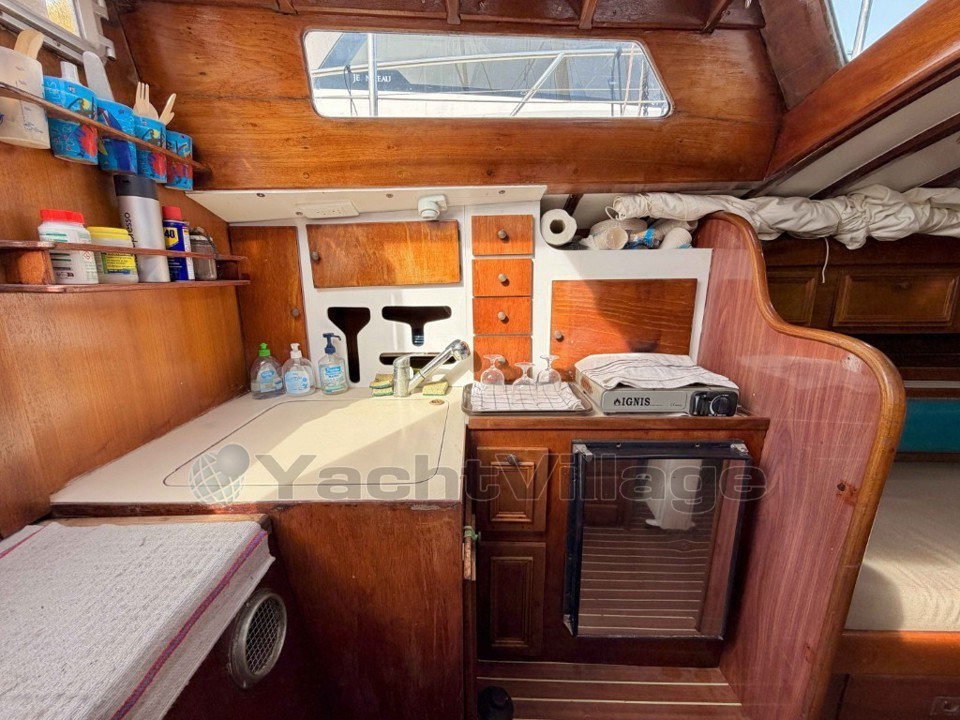Ce modèle de 1975 a reçu de nombreux travaux, principalement depuis sa reprise par son troisième propriétaire, qui l’a équipé et modernisé : propulsion remise à neuf, électricité et électronique de naviguation actualisées, ainsi que plusieurs améliorations sur l’étanchéité et les voiles.