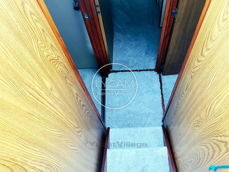 Sous le pont, un petit couloir mène au port vers une cabine avec des lits superposés ; à droite des toilettes et vers la proue vers la cabine du propriétaire avec des lits en V