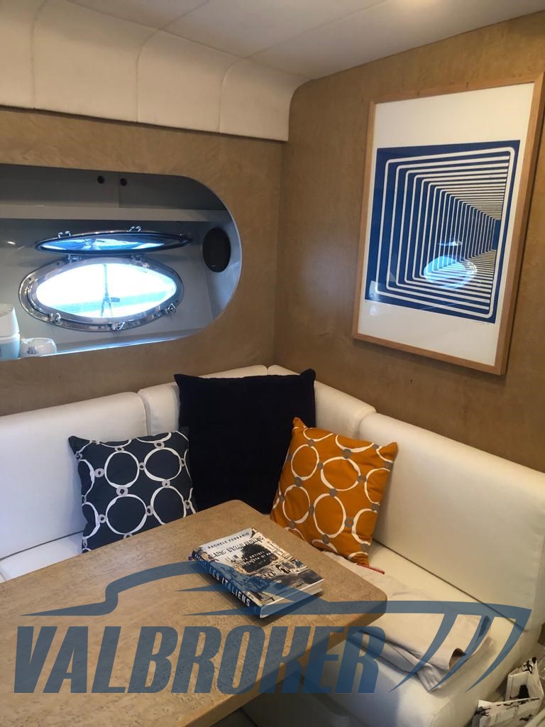 Coque puissante et solide avec de hautes remparts pour protéger le cockpit. Cabine avant et salle de bain séparée, salle à manger décapotable. De nombreuses options sont installées : climatisation, générateur, propulseur d’étrave, radar. Bateau sur la terre ferme pour le stockage hivernal.