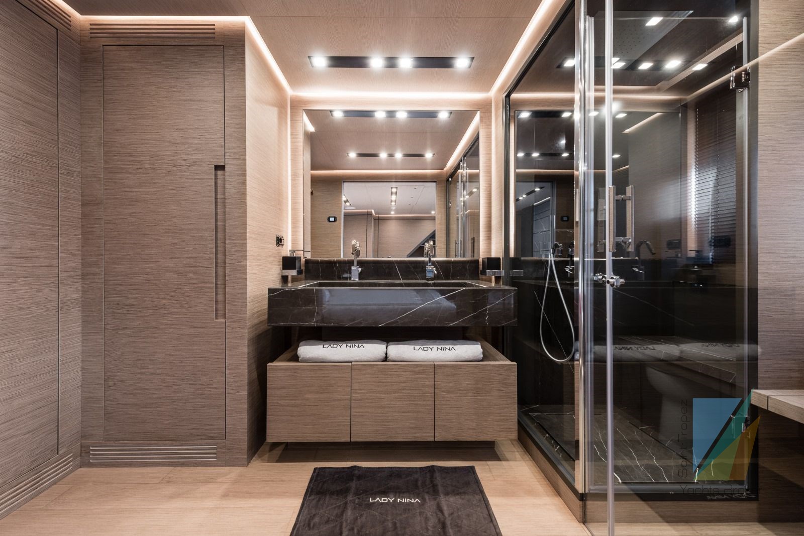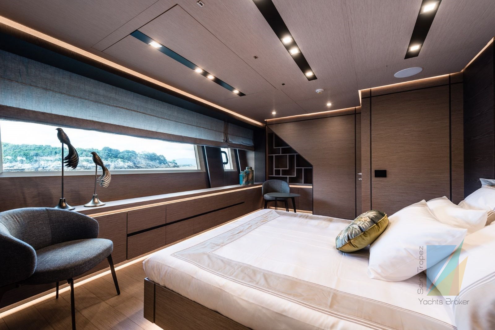 – Master Suite on the main deck, full beam and super beamy (and several options for expansion/reconfiguring, like a private gym or studio or massage room or playroom or library or…….);