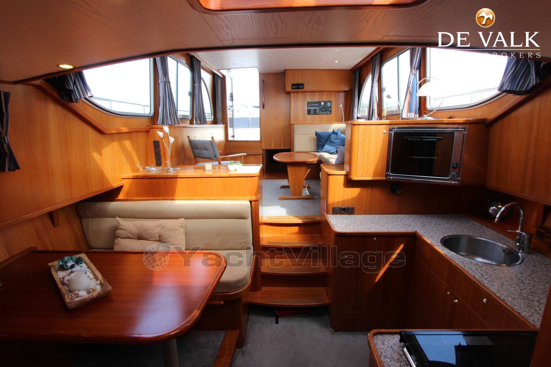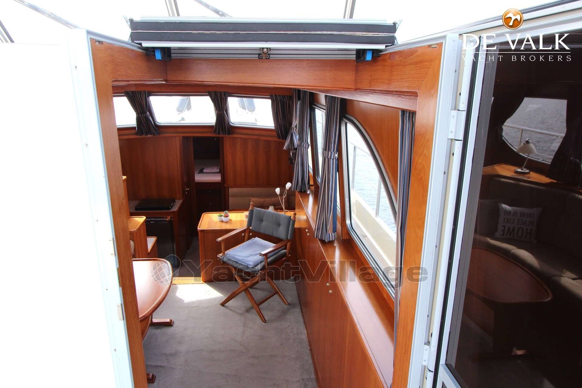 The Vri-Jon 46 Supreme ''La Linea'' is a very nice ground floor boat, so no steps in de gangways.This boat has 2 cabins, 1 cabin with a height of 1,15 mtr and 1 cabin with a height of 2,00 mtr, has 4 + 2 sleeping places, 2 engines, bow and stern thruster, solar panels, in short a very nice ship for a long stay on board. If you are curious and want to view the Vri-Jon Cabrio, it is located in our covered sales harbor in Sneek.