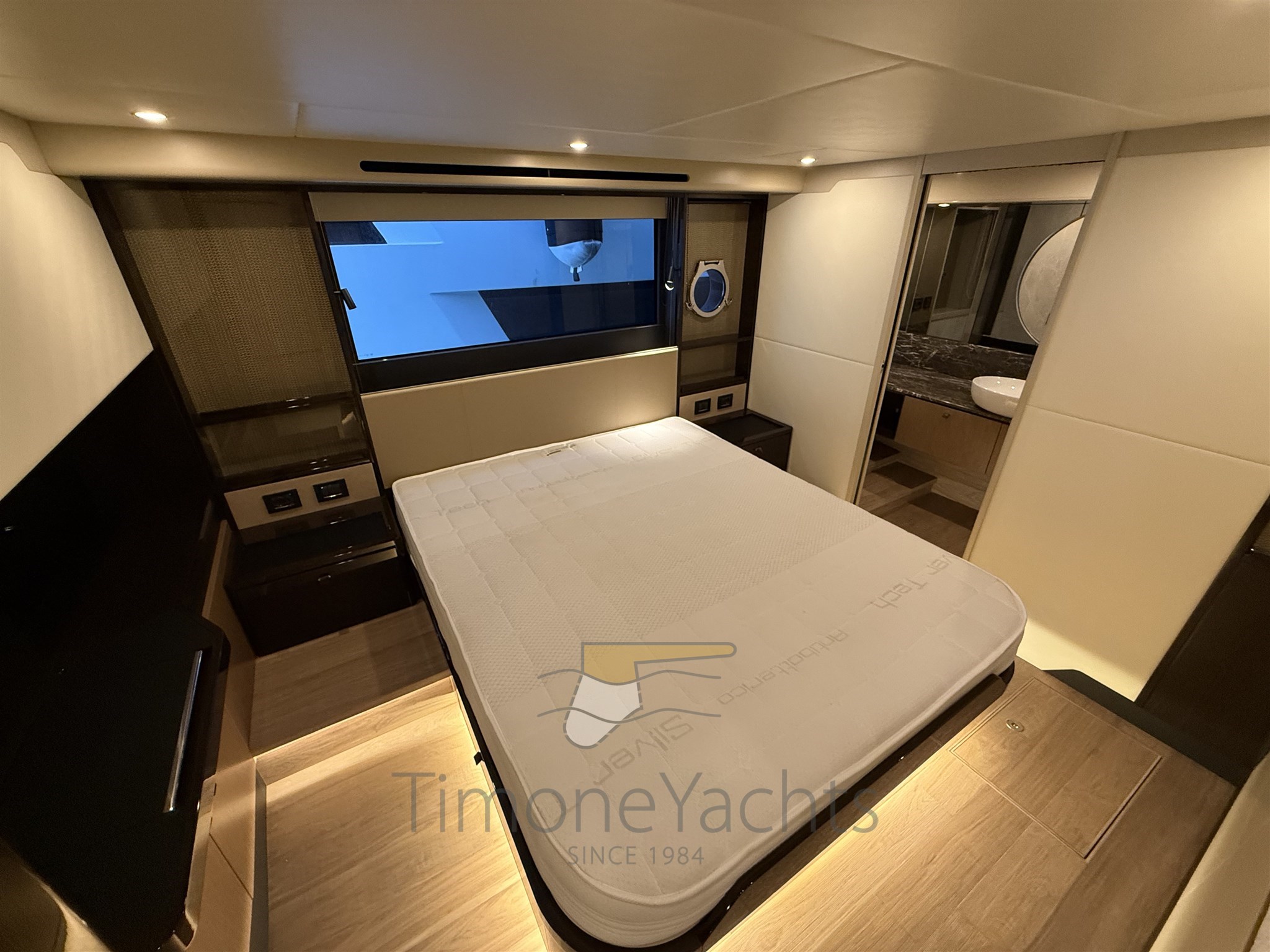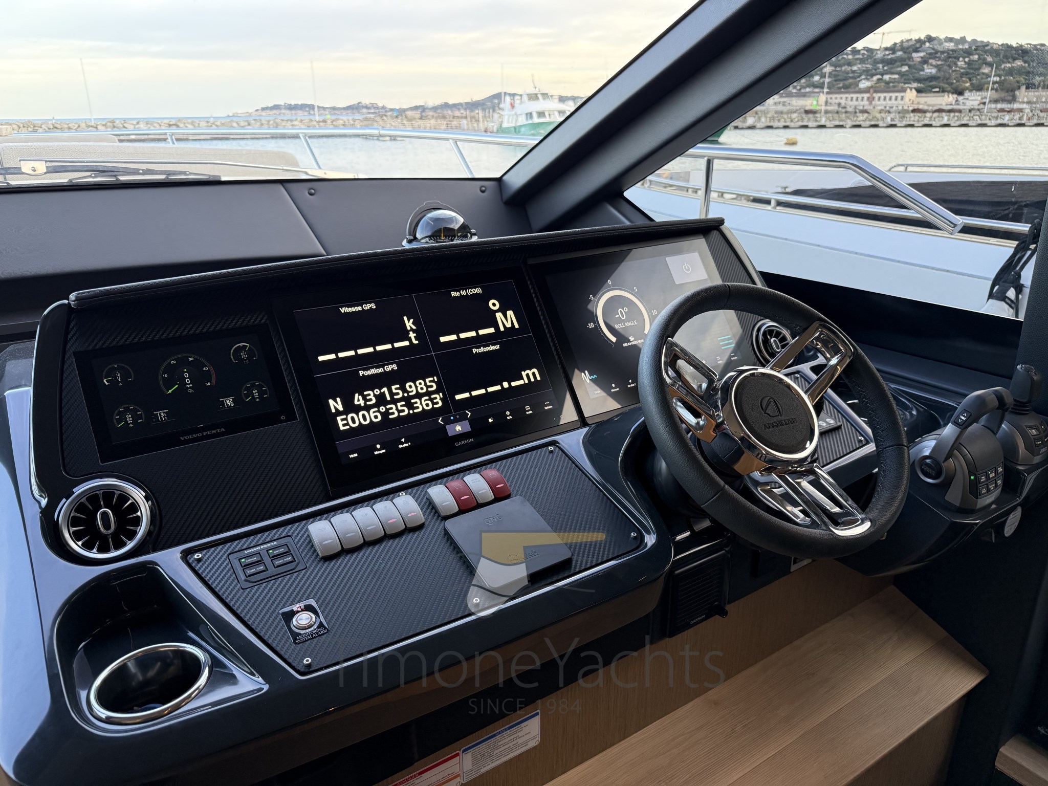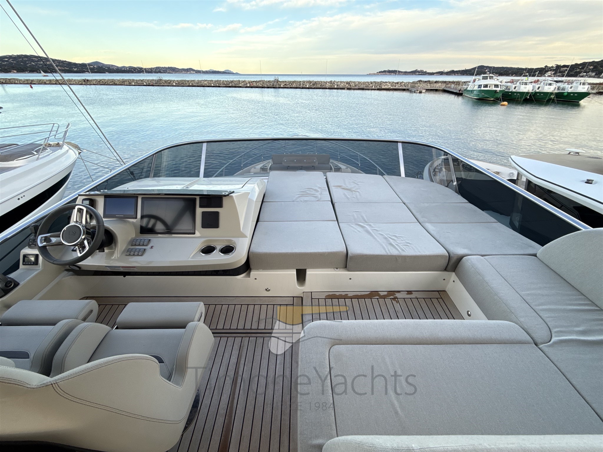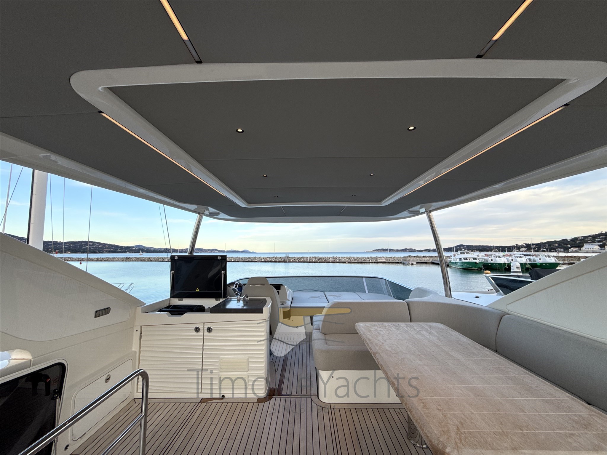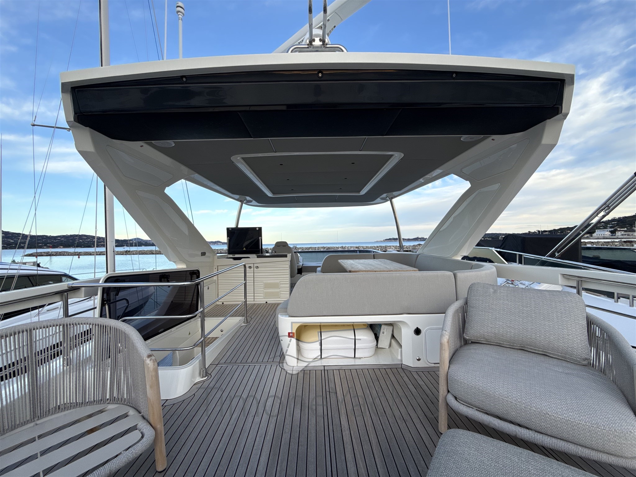 Conditions parfaites, Seakeeper stabilisé, toit dur à la mouche, grande cabine d’équipage à l’arrière.