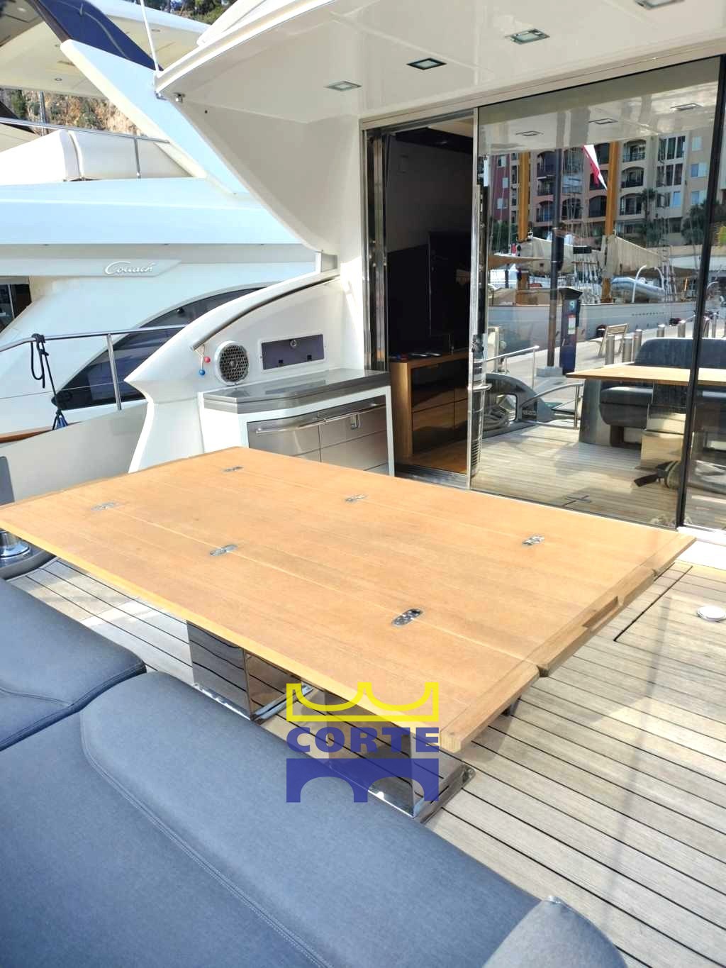 Grand cockpit en teck avec table et chaises en bois.