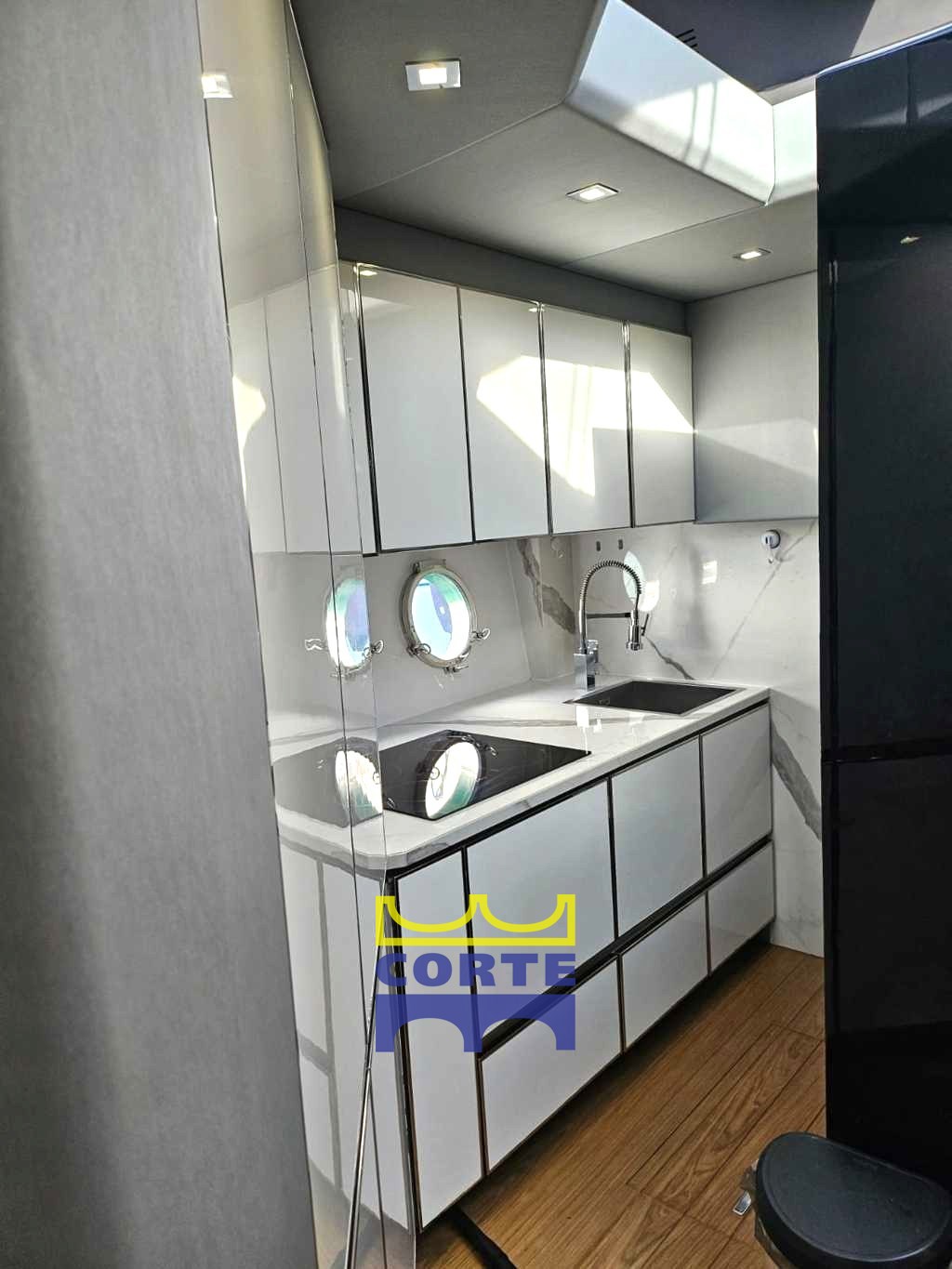 Sous le pont : cuisine à tribord, avec réfrigérateur, lave-vaisselle, cave à vin et assiettes.