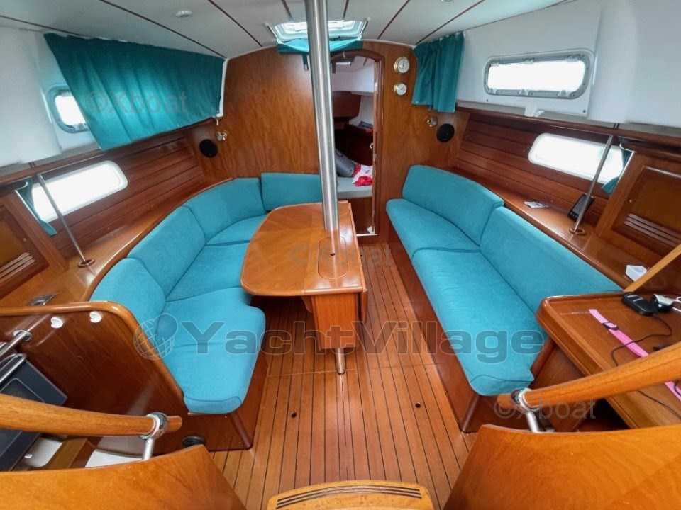 XBOAT ref :6235.Sitôt à bord, vous vous rendez compte que cet Océanis 36 CC a été véritablement conçu pour la vie en mer ; la pente de marches de la descente incurvées est douce, et les mains courantes sont à portée immédiate de la main. Le carré de type symé-