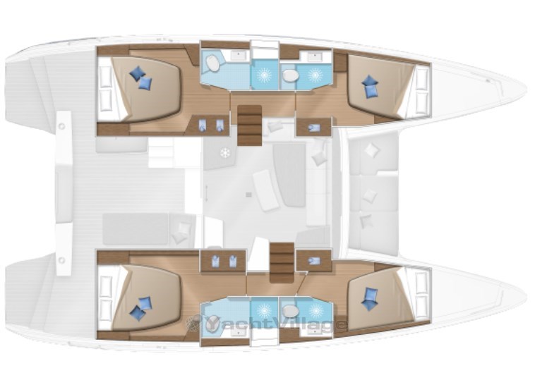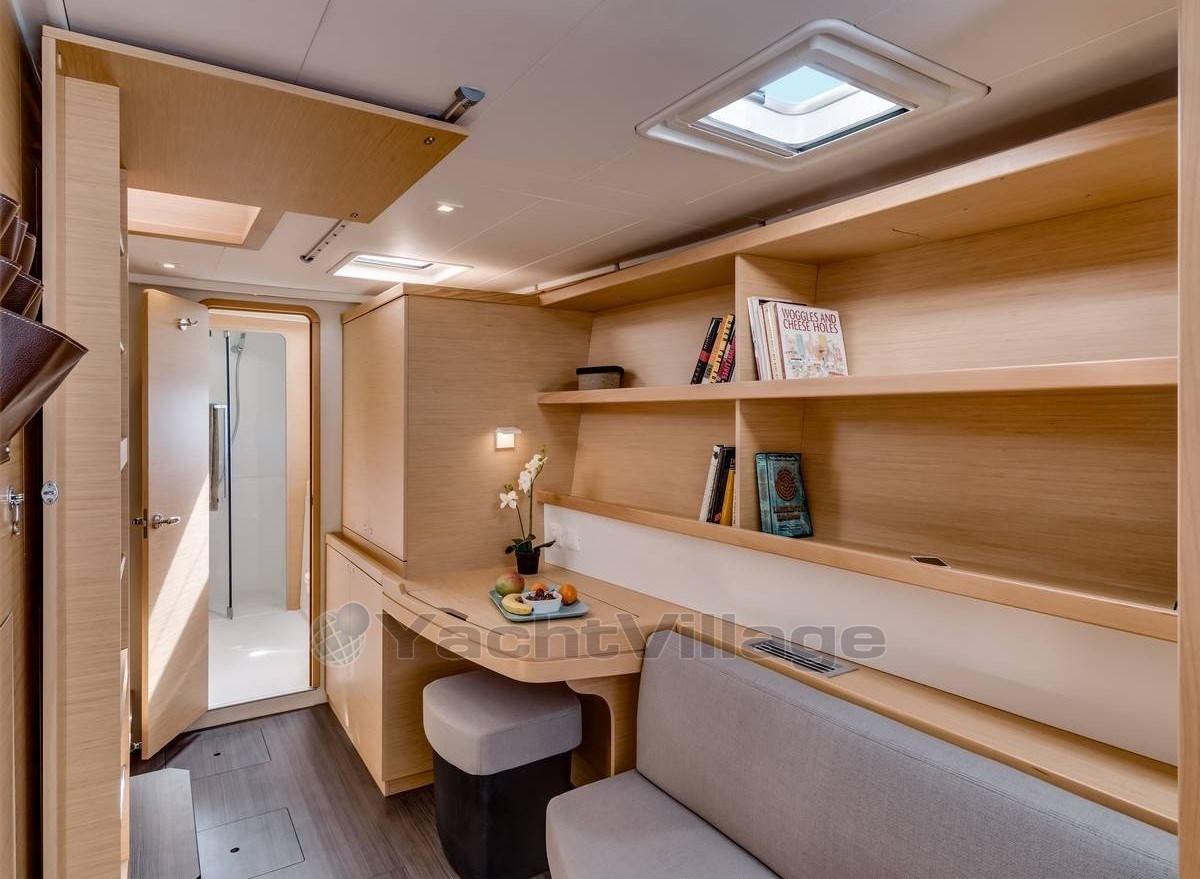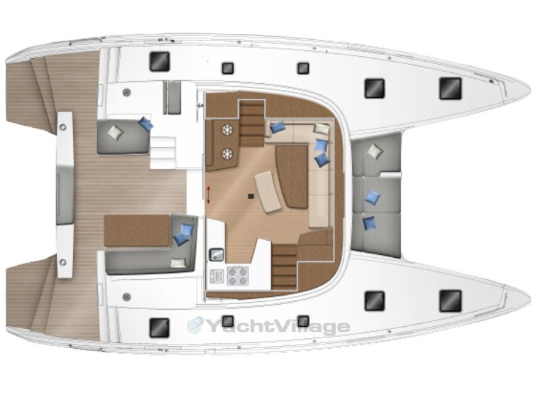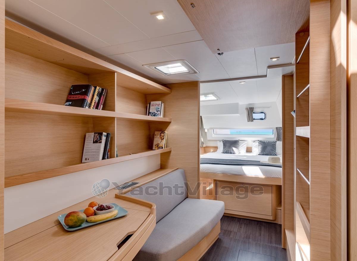 L’aménagement intérieur est en parfaite harmonie avec les lignes extérieures du catamaran. L’immense dinette répond aux standards de Lagoon : vue panoramique sur l’extérieur, lumière magnifique, circulation fluide, matériaux choisis et durables
