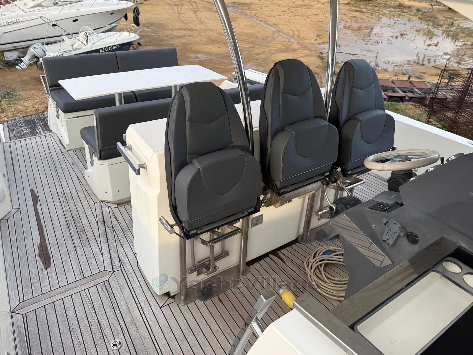 A l'extérieur, il bénéficie d'un walk around spacieux, d'un grand carré arrière amovibles de plusieurs façons, d'une kitchenette bien équipée, d'un grand bain de soleil avant, d'une grande plateforme arrière et d'un poste de pilotage qui dispose de 3 assises amovibles.