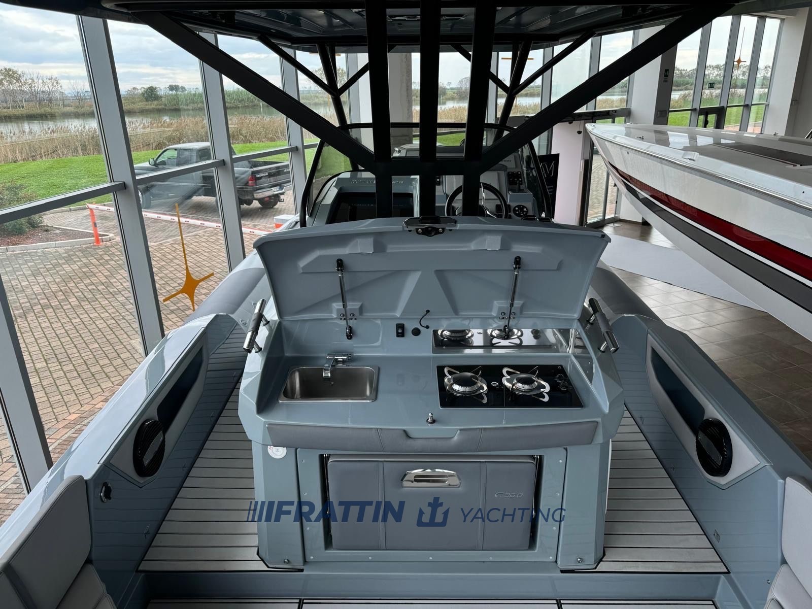 Ancre et chaîne • Projecteurs LED • Prises USB • Prise électrique 110/220V • Douche arrière • Gonfleur électrique 12V • Évier en acier inoxydable avec robinet • Feux de navigation • 2 échelles télescopiques rétractables • Porte-gobelets et rampes • Réfrigérateur cabine 50L • Table arrière électrique et kit de terrasse • Poches de rangement • Guindeau électrique • Système d’eau potable avec réservoir 150L • Système d’eau noire avec bouteille de 60L avec pompe de drainage et sortie à terre • Système stéréo HERTZ avec 2 enceintes internes + 4 enceintes externes • Appuie-pieds • Éclairage LED • Klaxon électrique • Toilettes marines électriques avec réservoir • GPS + sondeur d’écho • VHF • Propulseur d’avant • Comptoir à chaîne • Chaudière • Climatisation • Réfrigérateur externe • Kit de table électrique • Auvent.