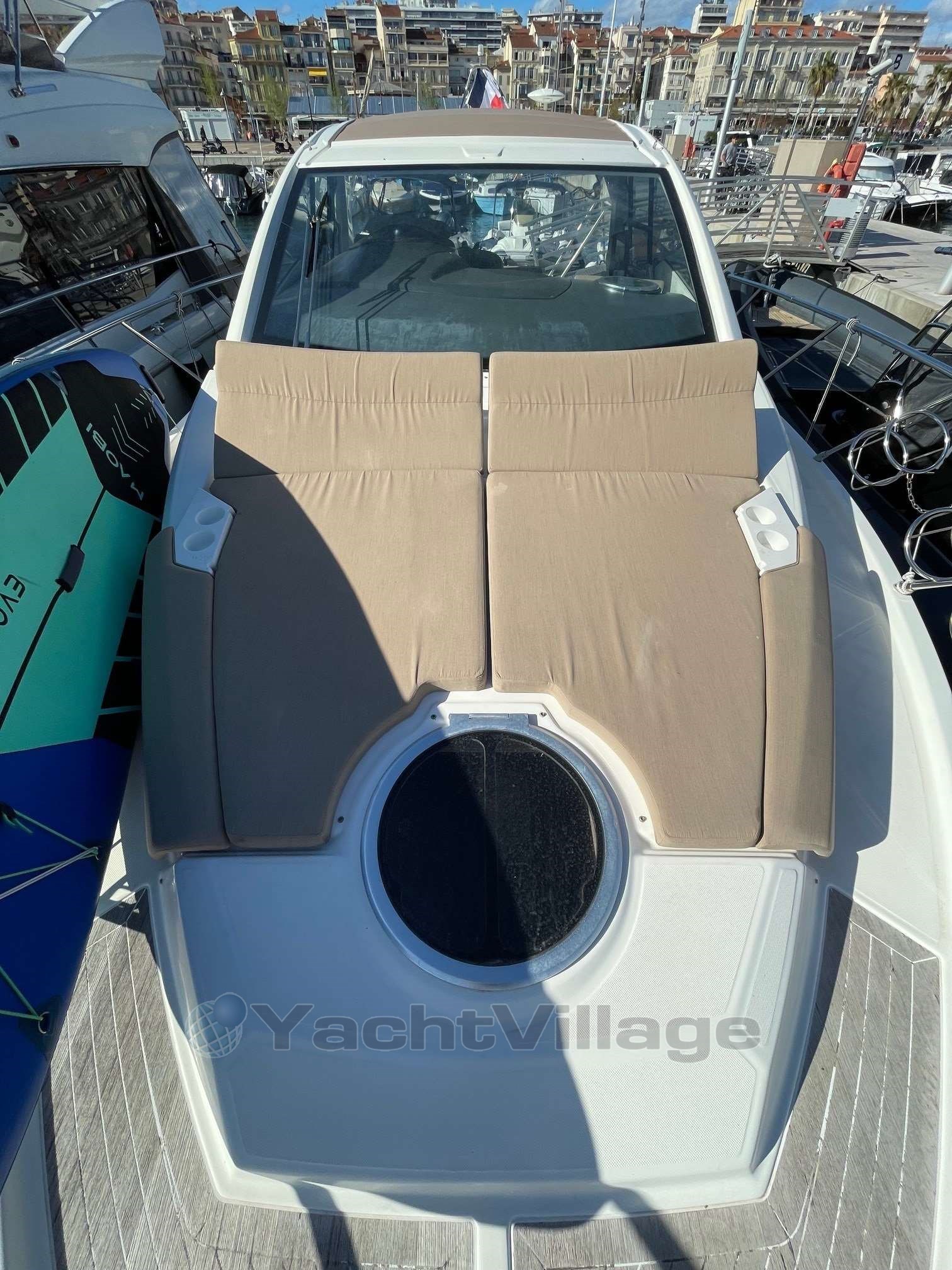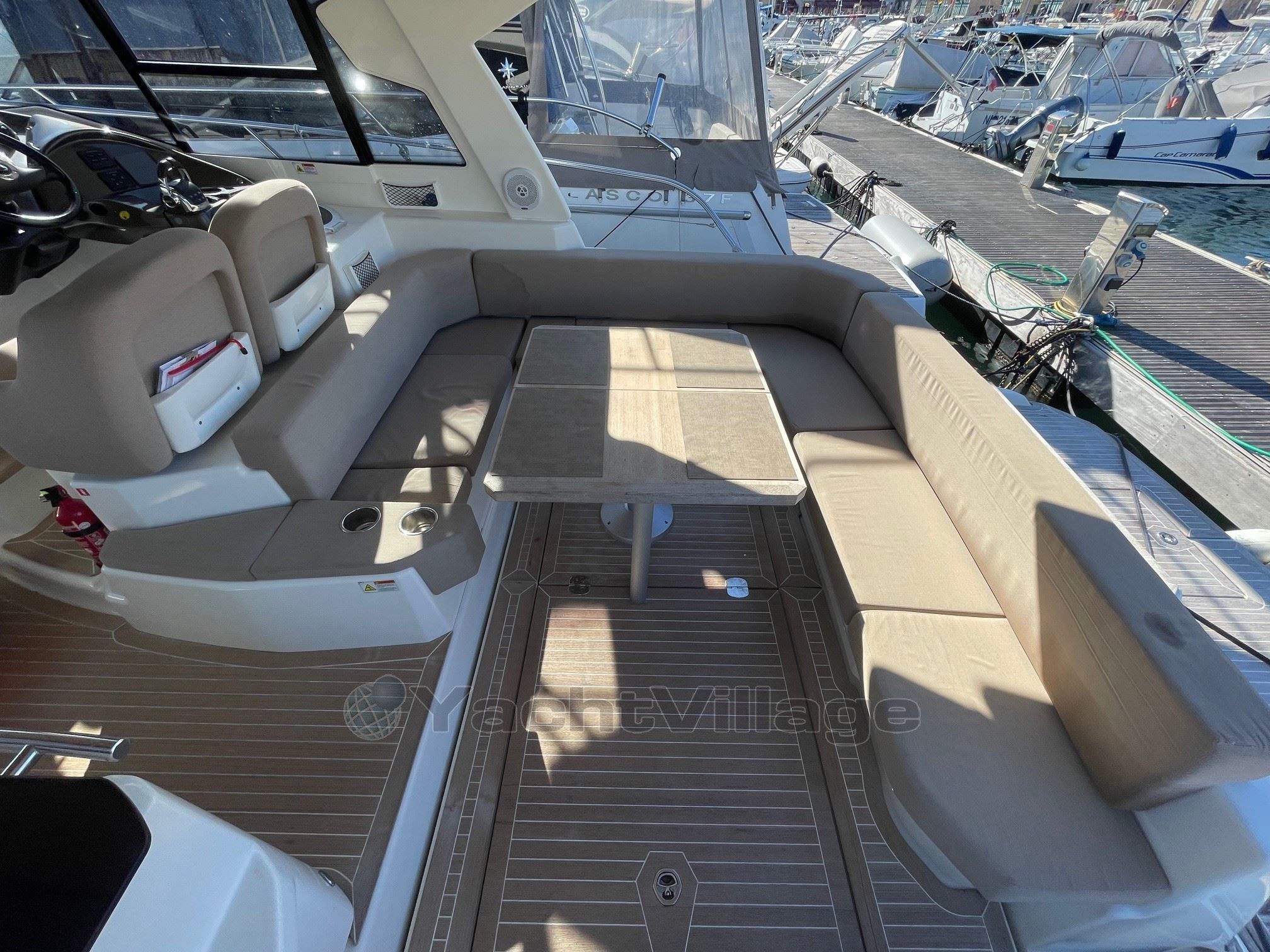 Le cockpit est vraiment spacieux pour la taille du bateau. Sur tribord, un coin repas confortable peut se transformer en bain de soleil grâce à la table abaissante. Face au coin repas se trouvent un grill et un bar avec évier, tandis qu'une méridienne est placée sous le hard top souple coulissant électriquement. Le tableau de bord est élégant et le poste de pilotage permet à deux passagers de s’y installer. Les passavants larges et sécurisants donnent accès au bain de soleil avant.