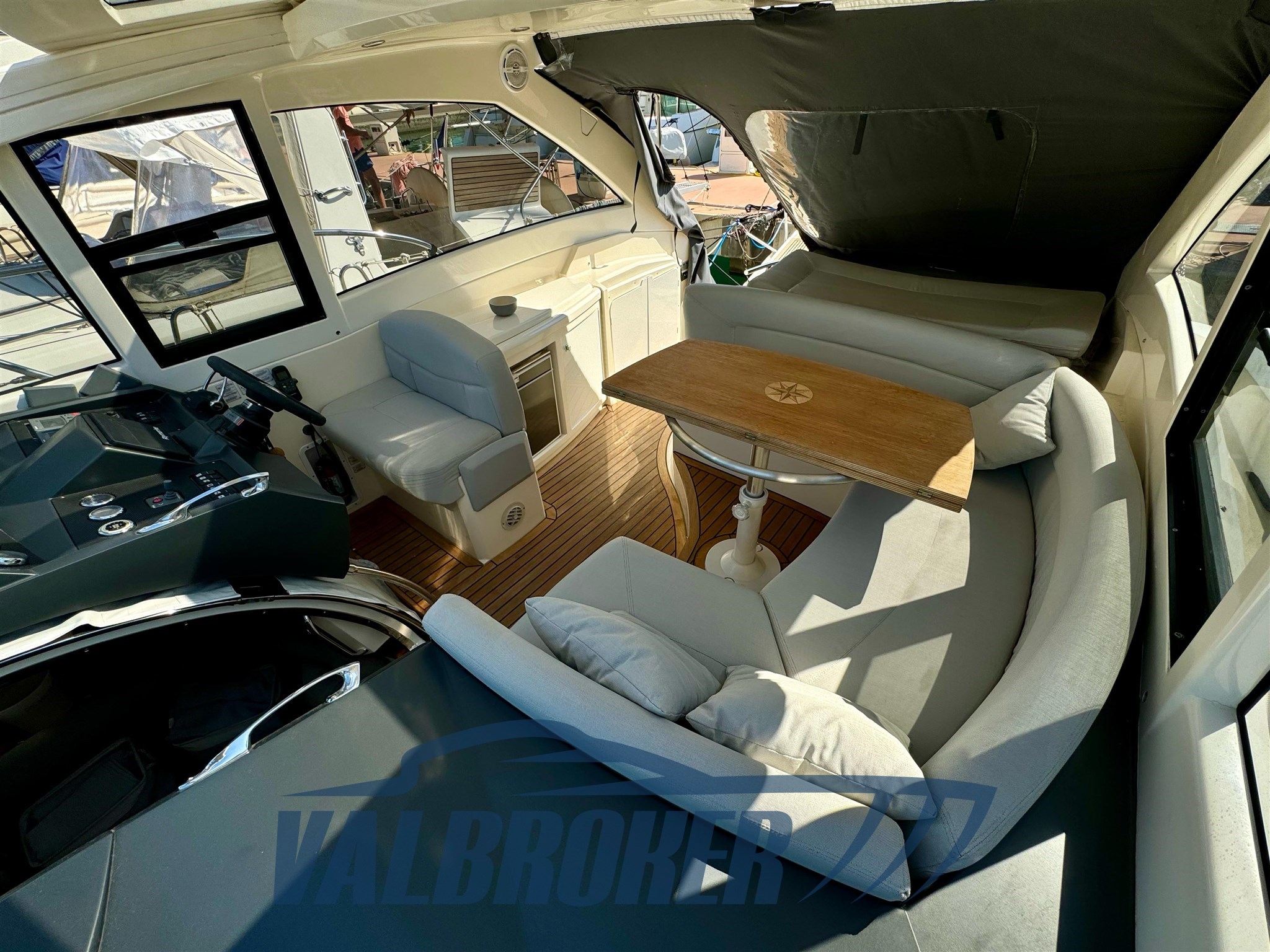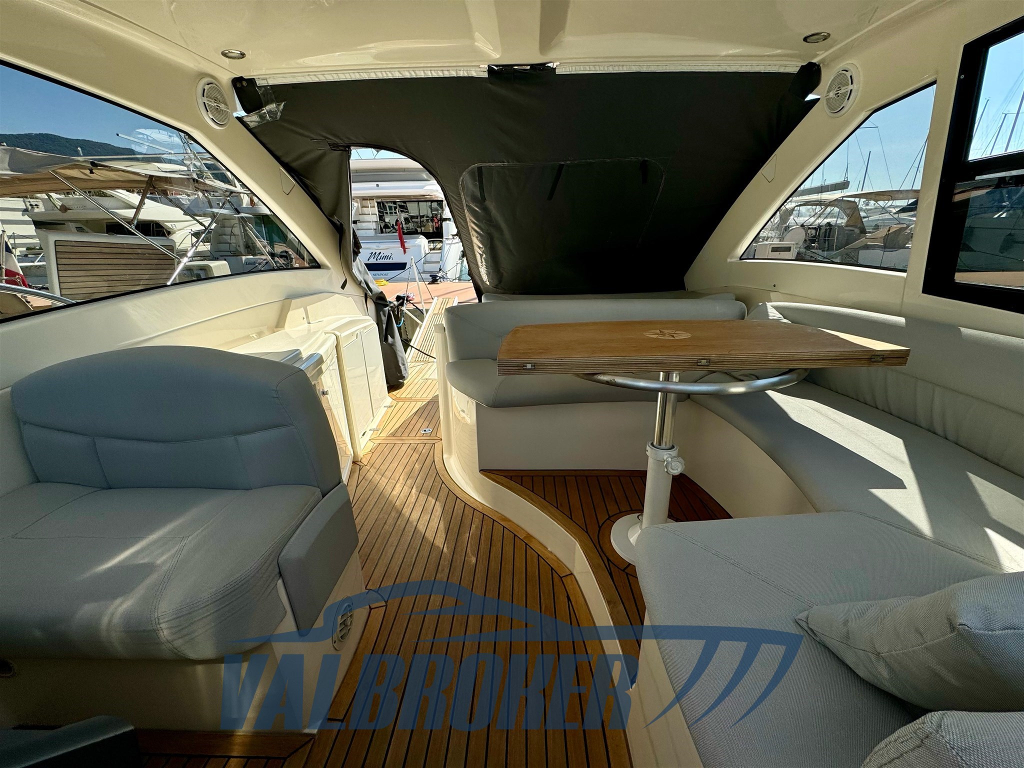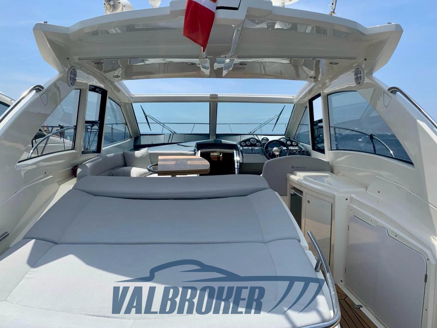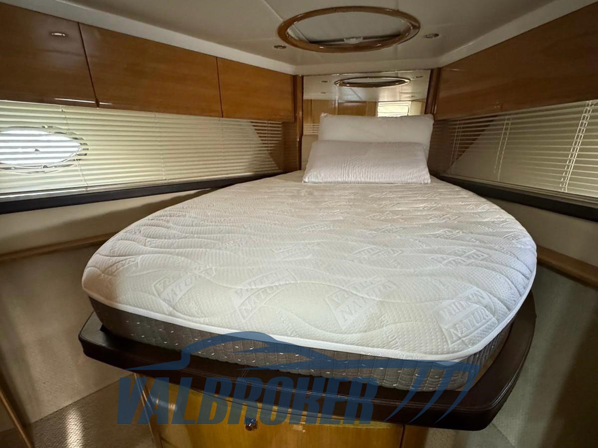 Magnifique toit rigide avec des lignes élégantes et très sportives. Enveloppé sur les côtés et sur le tableau de bord. Sous le pont, nous trouvons la cabine du propriétaire à l’avant, une cabine d’amis avec des lits plats et deux salles de bains. EN OPTION : générateur, climatisation, toit rigide électro-hydraulique, garage hydraulique, propulseur à proue. Nouveaux coussins et matelas internes. Sol de saloon en teck avec joints blancs !!