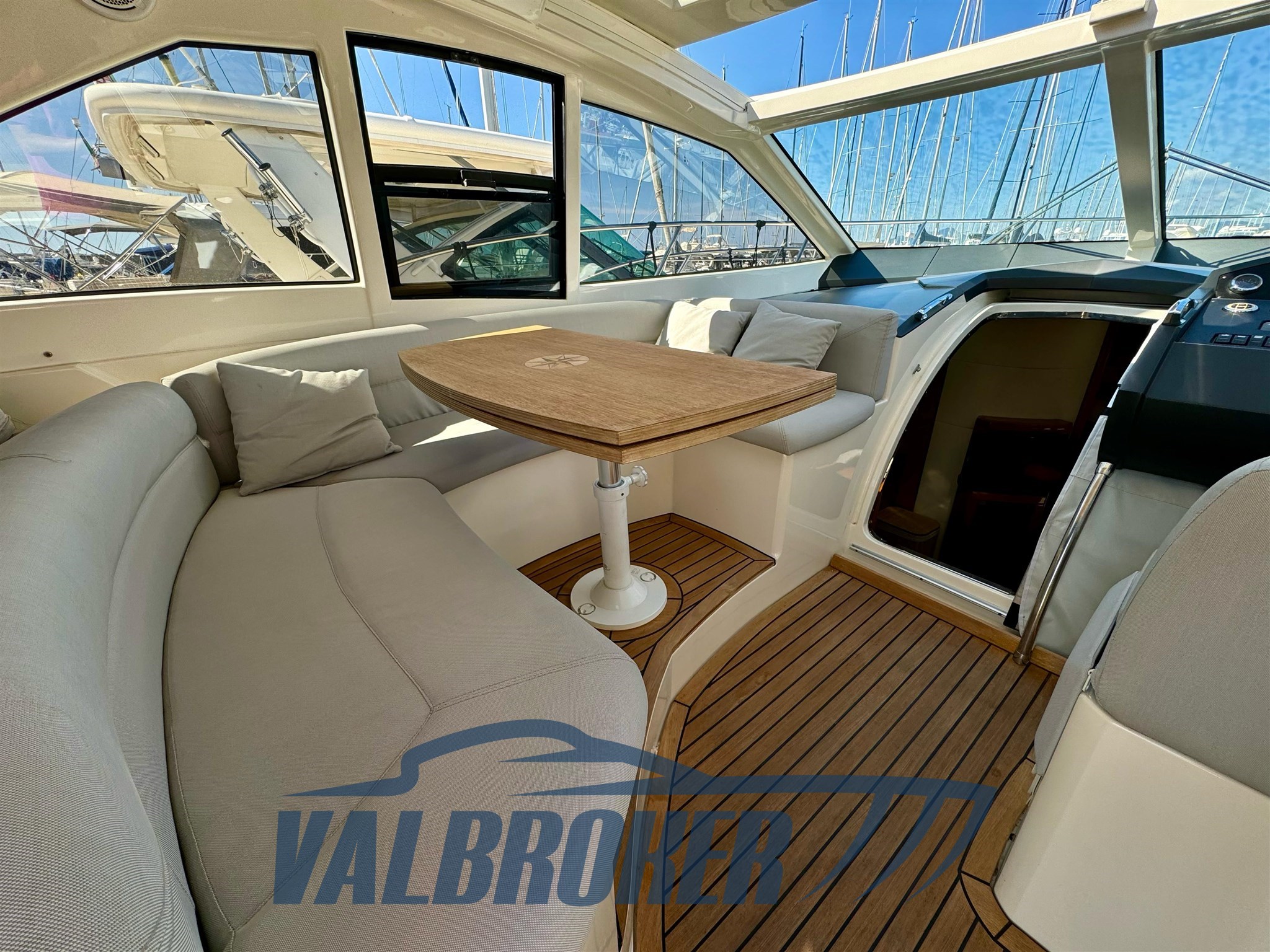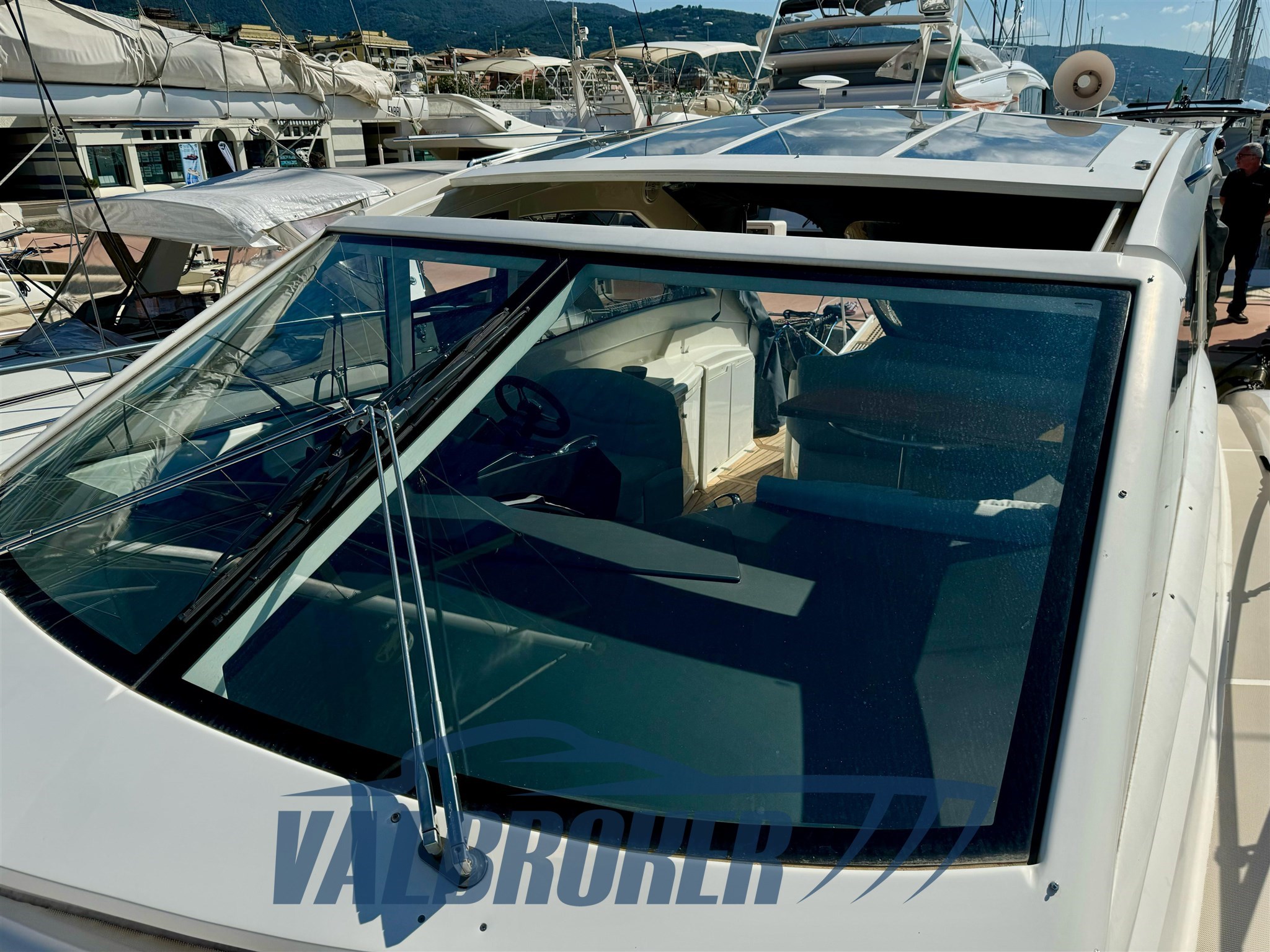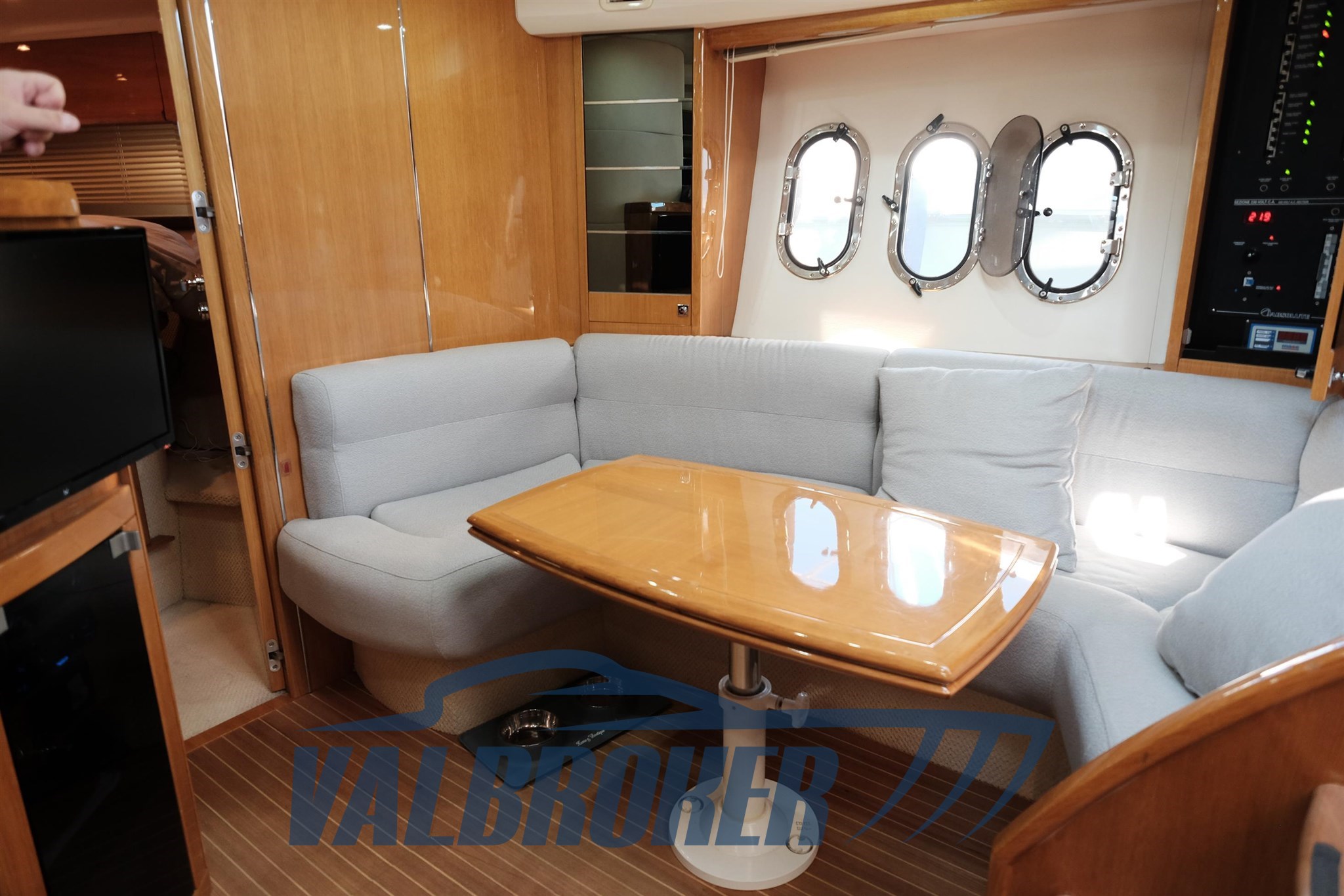 Magnifique toit rigide avec des lignes élégantes et très sportives. Enveloppé sur les côtés et sur le tableau de bord. Sous le pont, nous trouvons la cabine du propriétaire à l’avant, une cabine d’amis avec des lits plats et deux salles de bains. EN OPTION : générateur, climatisation, toit rigide électro-hydraulique, garage hydraulique, propulseur à proue. Nouveaux coussins et matelas internes. Sol de saloon en teck avec joints blancs !!