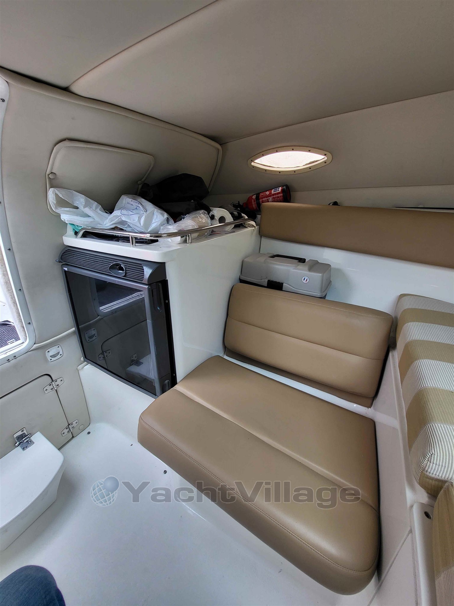 La cabine est cosy, avec un WC marin et un Frigo.De nombreux petits rangements sont très agréables pour libérer l'espace de la cabine,