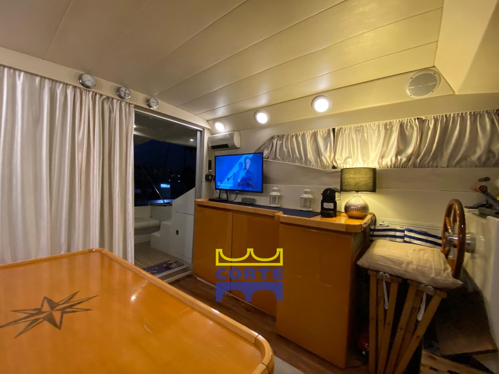 Cockpit en teck avec canapé et chaises