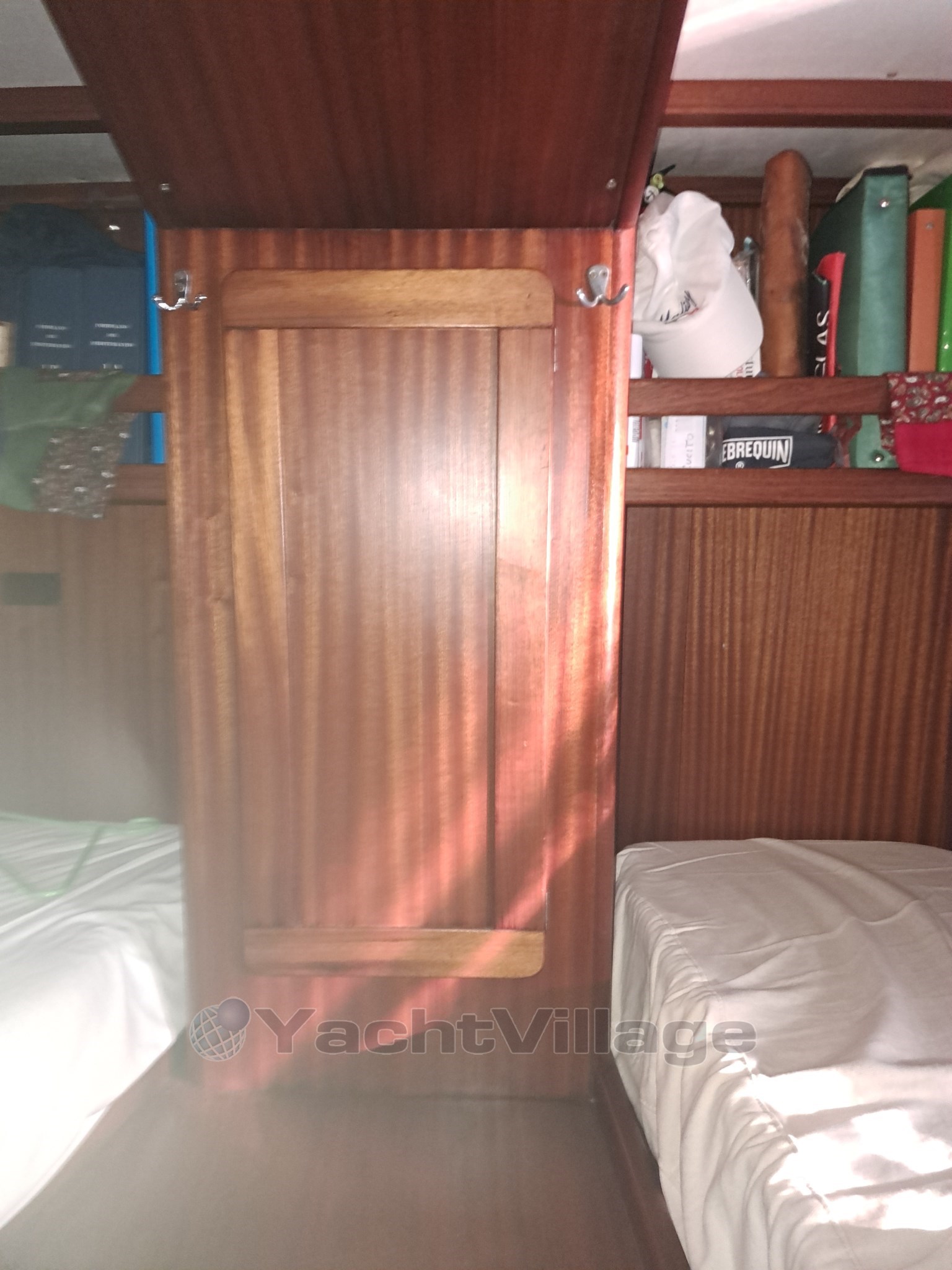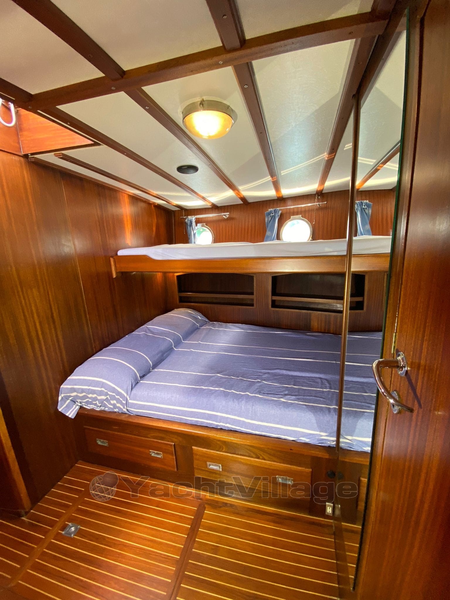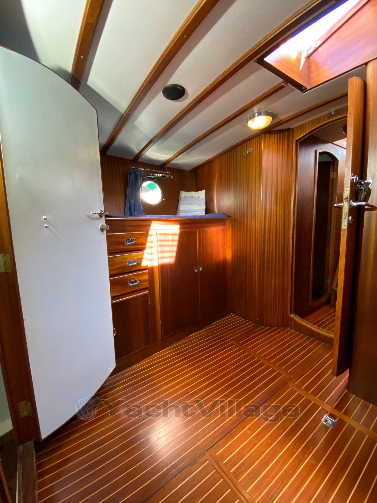 Disposition intérieure et caractéristiques : salon sur le pont, cabine double à l’arrière avec salle de bain attenante, cabine centrale double en forme de L avec salle de bain extérieure, cabine avant pleine poutre avec un lit double et deux lits simples avec salle de bain attenante, cabine de marin avant avec toilettes marines, lavabo et douche à mains, avec accès séparés à l’intérieur et à l’extérieur. Salone des machines sous le pont, avec accès depuis la cabine arrière et depuis le plancher du salon. Autres accessoires : transpondeur AIS Raymarine 700, Epirb 2024, système de surveillance de charge, réserve de charge électrique et de batterie de service, système d’extinction automatique et manuelle de la salle machines, chargeur de batterie Mastervolt, onduleur Mastervolt, double circuit, batteries moteur (180°) / services (400°) avec double alternateur