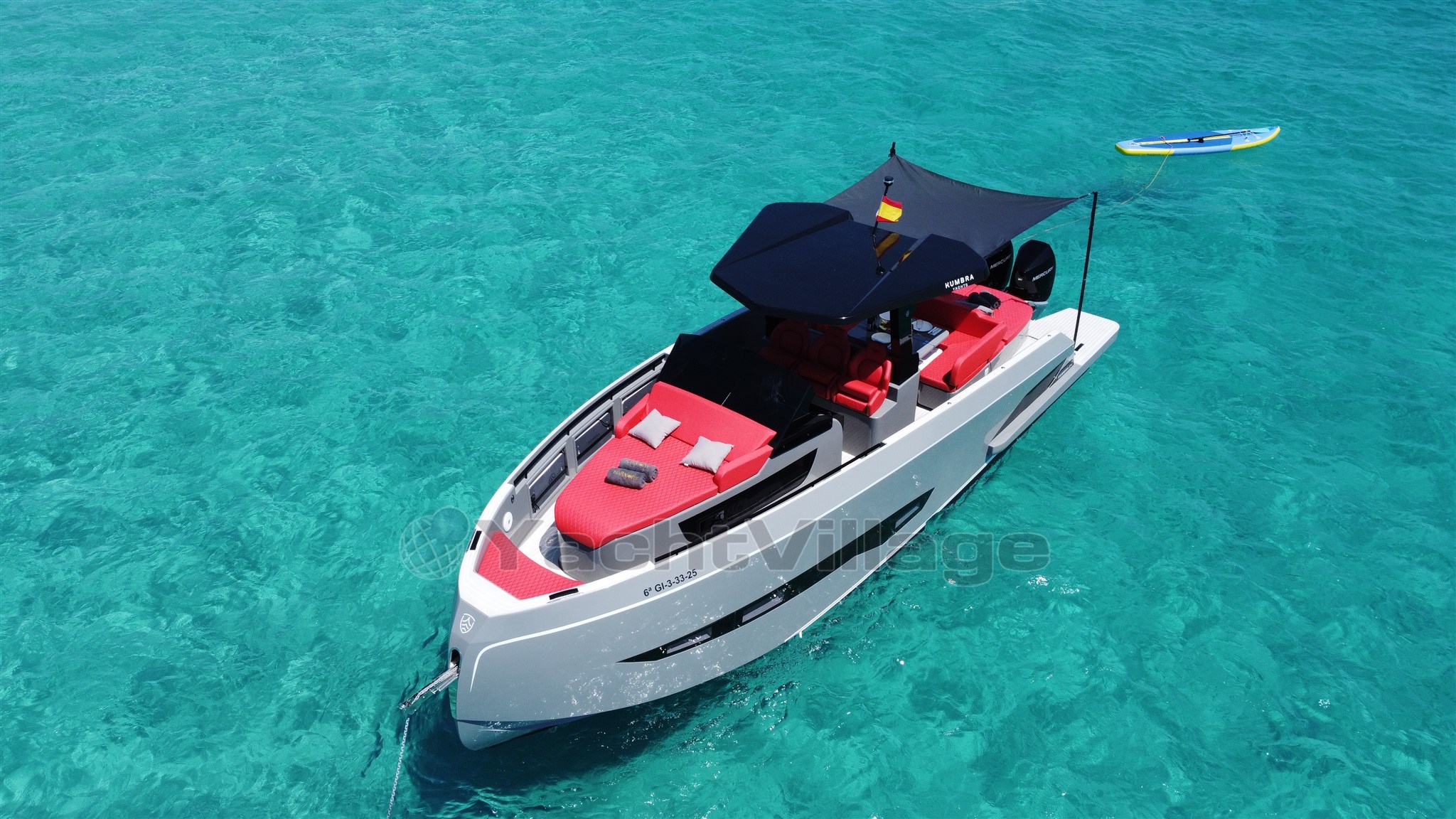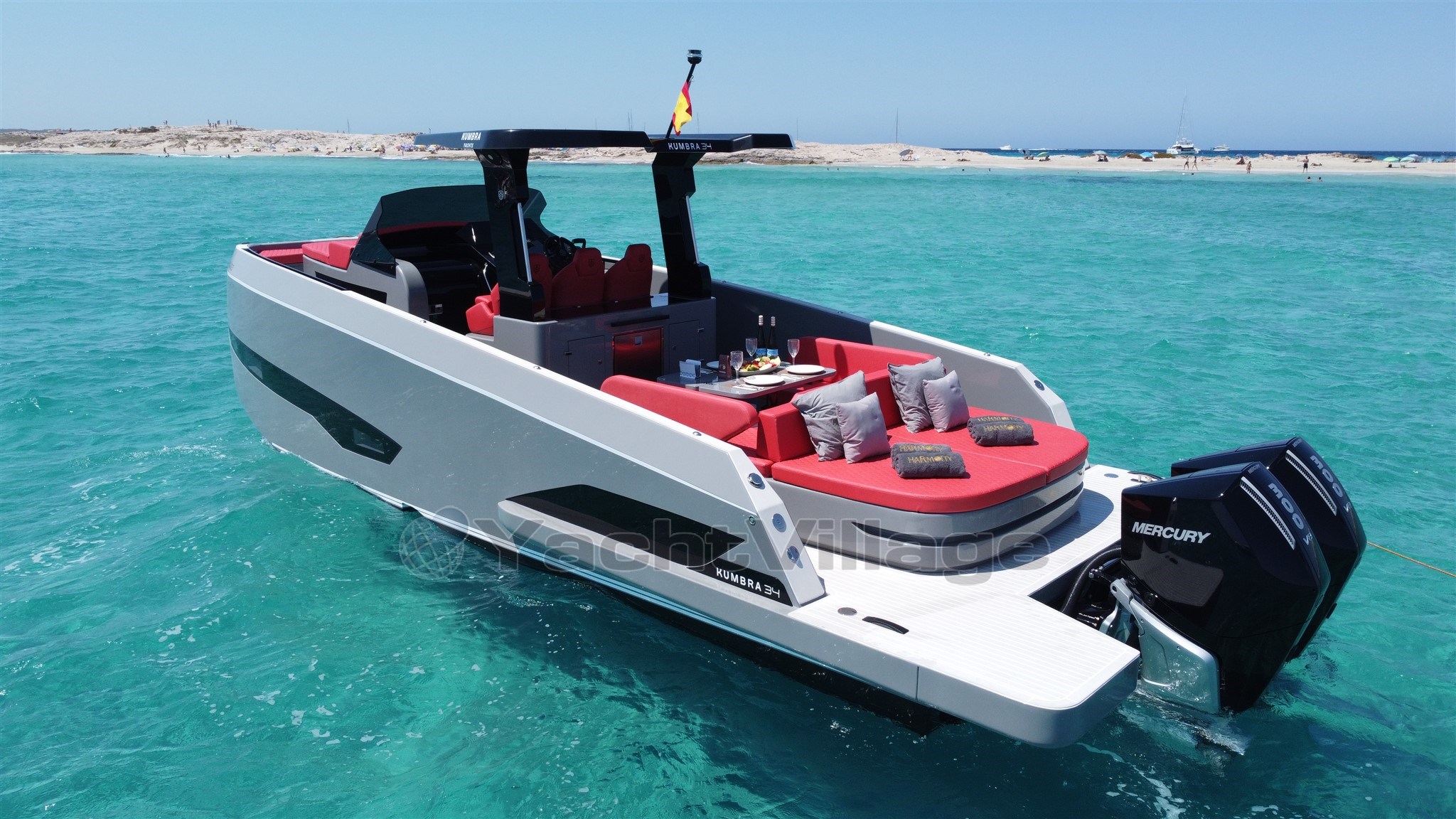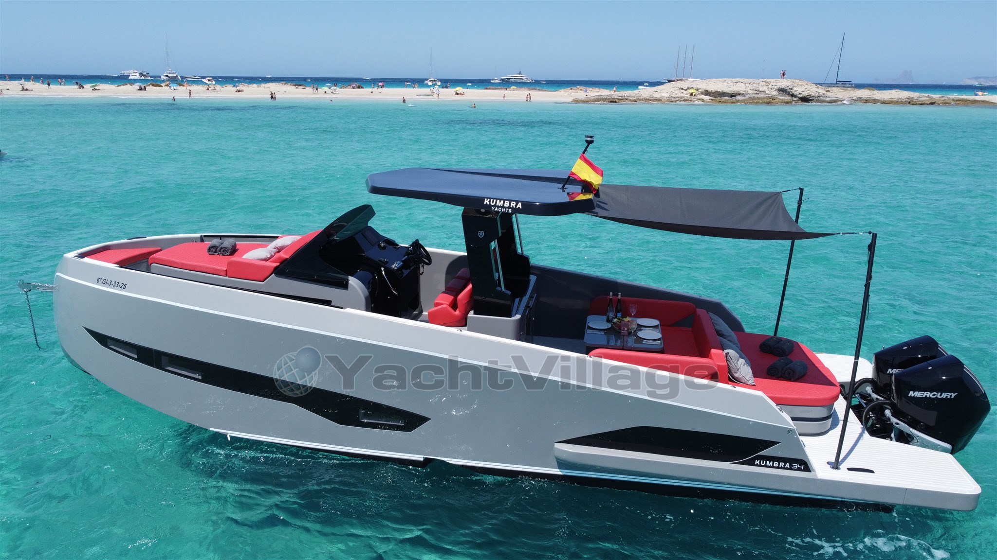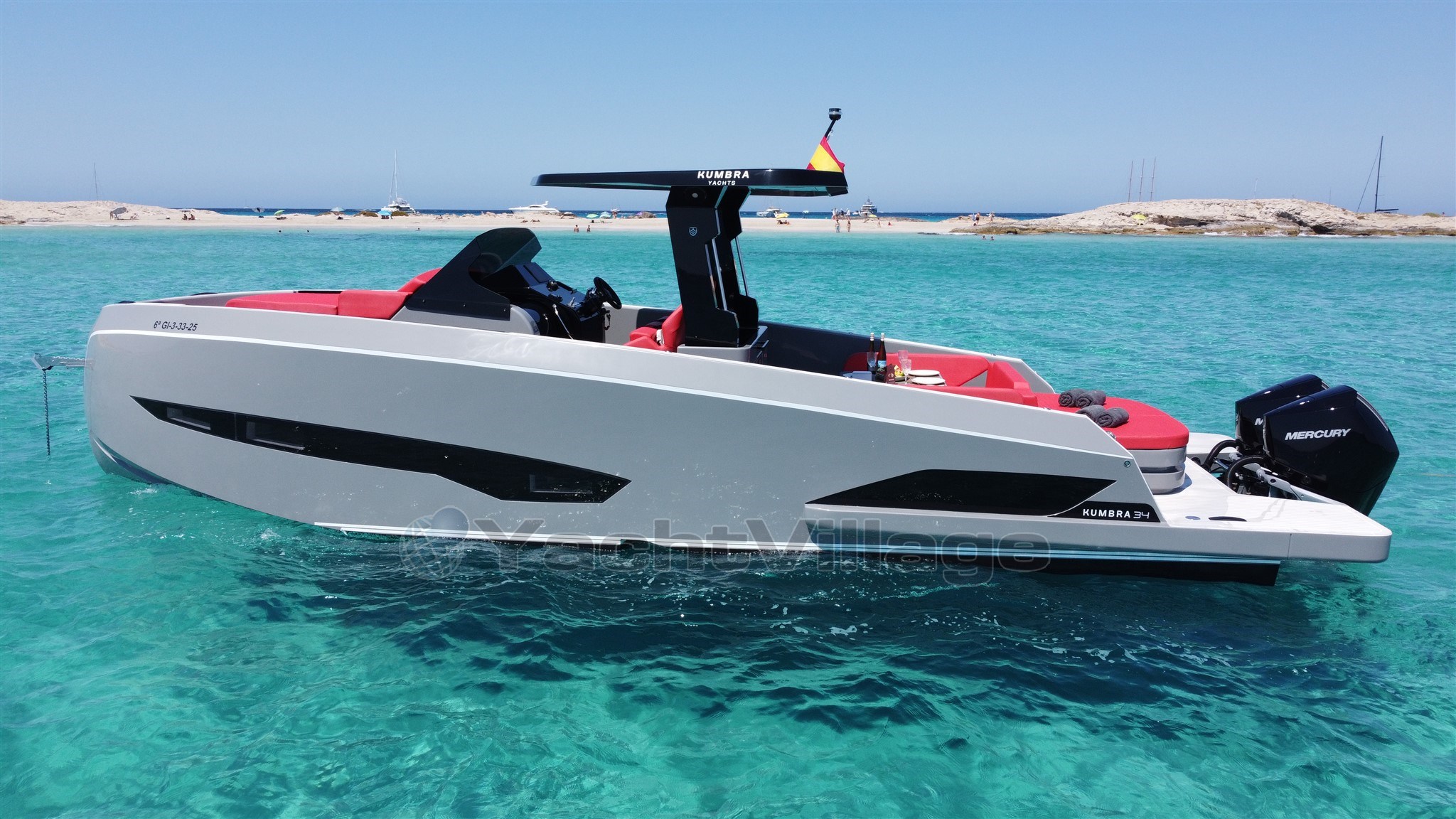 The 2025 Kumbra 34 is a luxury walkaround sports cruiser from the Spanish shipyard Kumbra Yachts, designed primarily for day boating and Mediterranean cruising. It is characterized by its high-performance twin Mercury 2x 300hp V8 engines, wide 3.50m beam, and a double-solarium layout rare for vessels of its length. The boat has a double cabin and a convertible sofa and a full shower head.