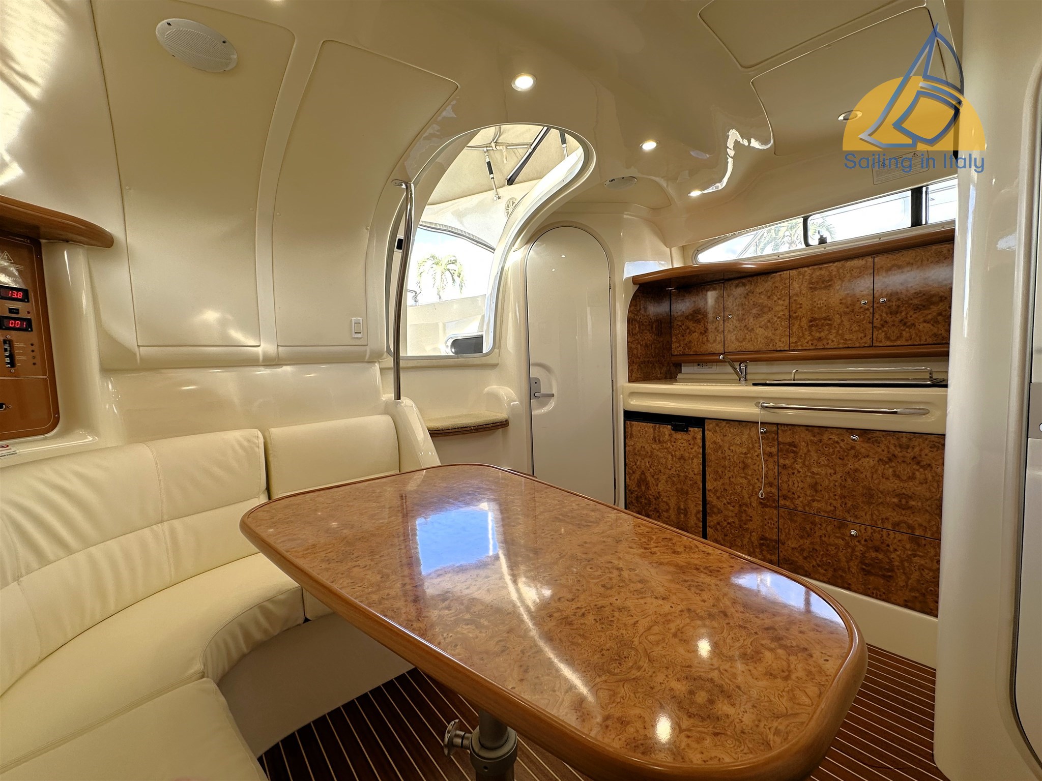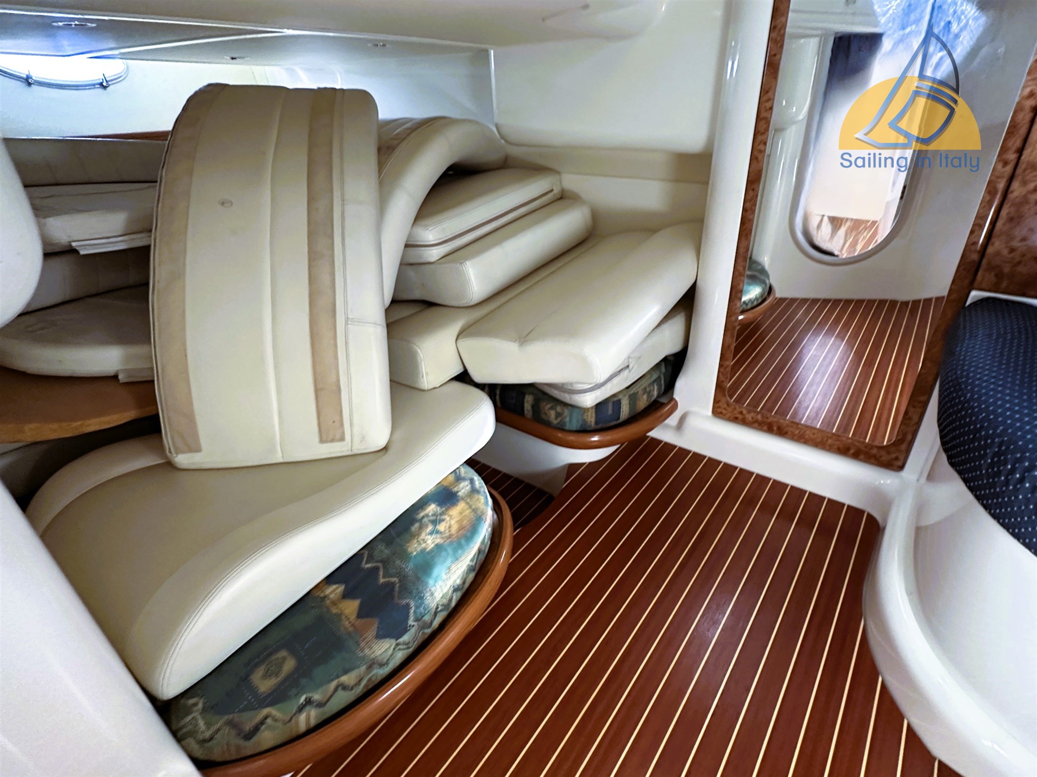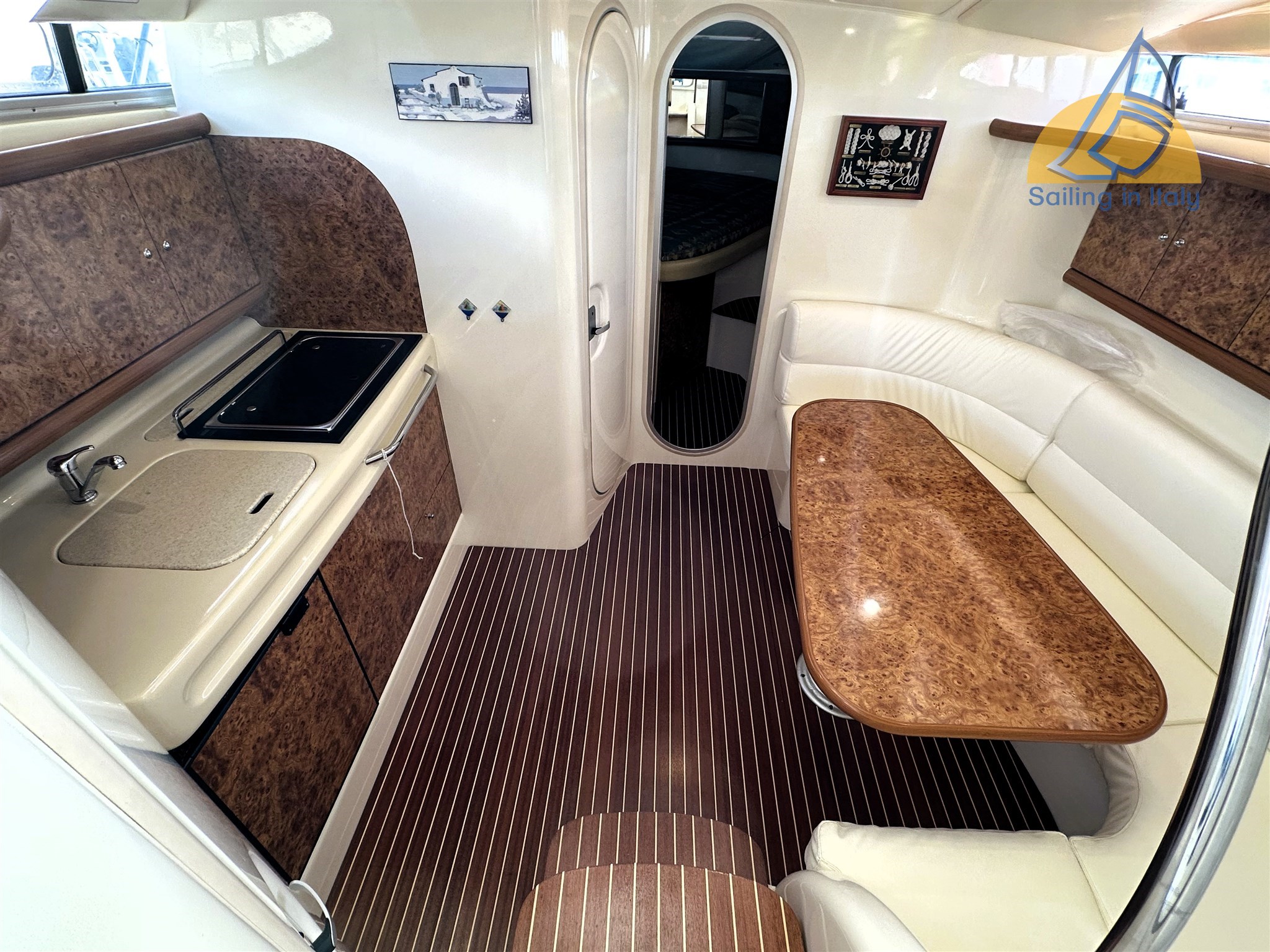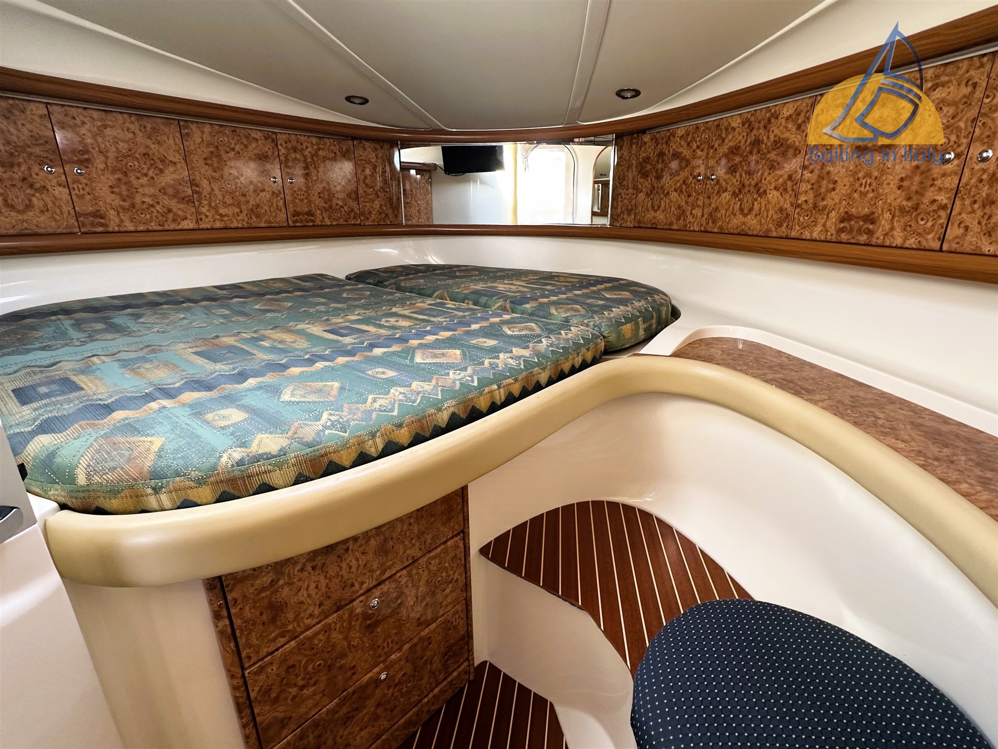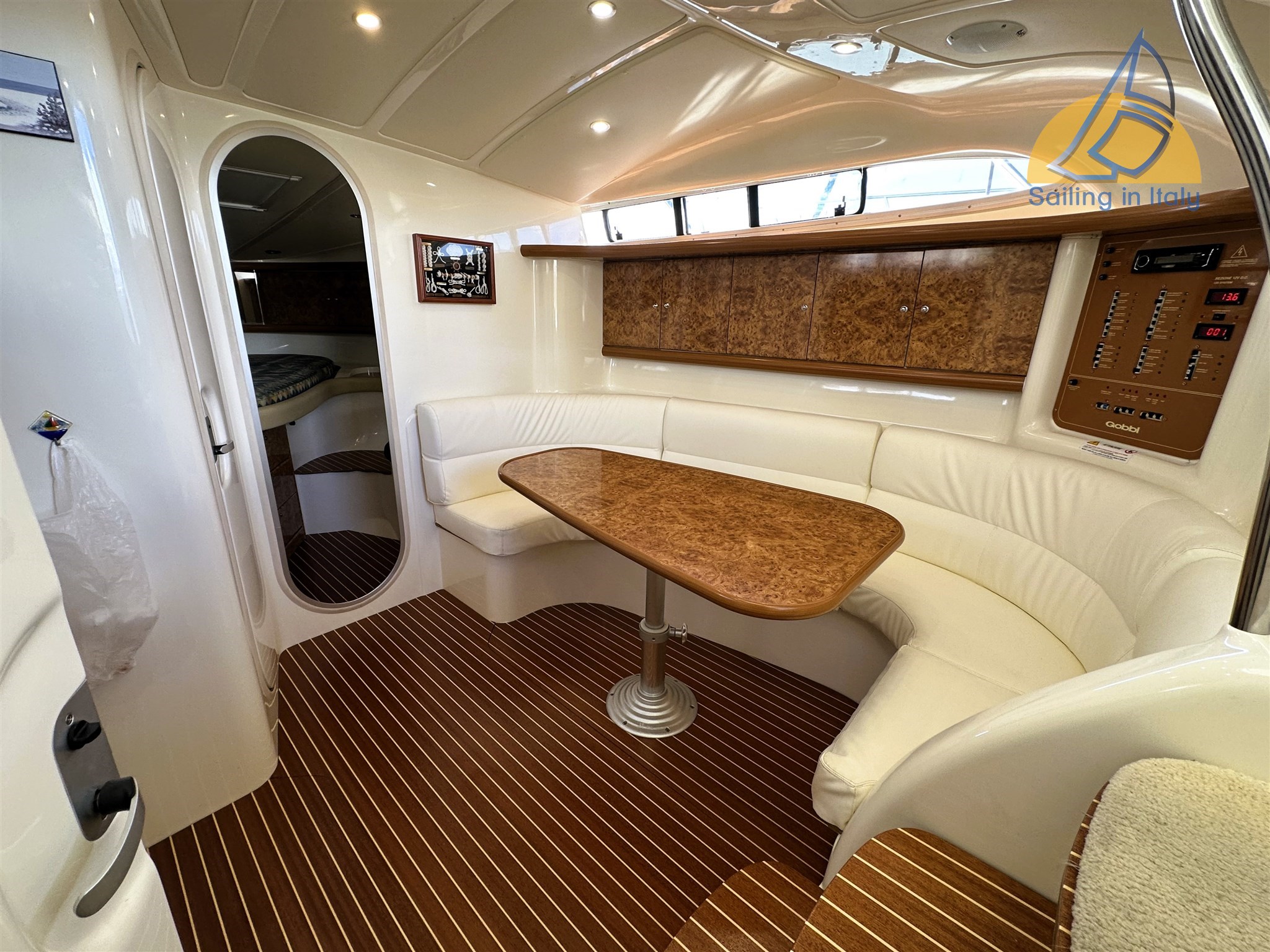2 cabine ; Cabina armatoriale a prua con letto matrimoniale alla francese ; Cabina ospiti con due letti in piano trasformabili in matrimoniale (lavello in cabina) ; Dinette interna trasformabile (rinnovata 2022) ; Bagno con doccia separata ; Cucina interna + cucina esterna a gas con doppio lavello ; Doppio frigorifero (uno nuovo 2023) ; Microonde ; TV nuova 2023 ; Tappezzerie, materassi e finiture in ottimo stato , faretti interni ed esterni a led 2022