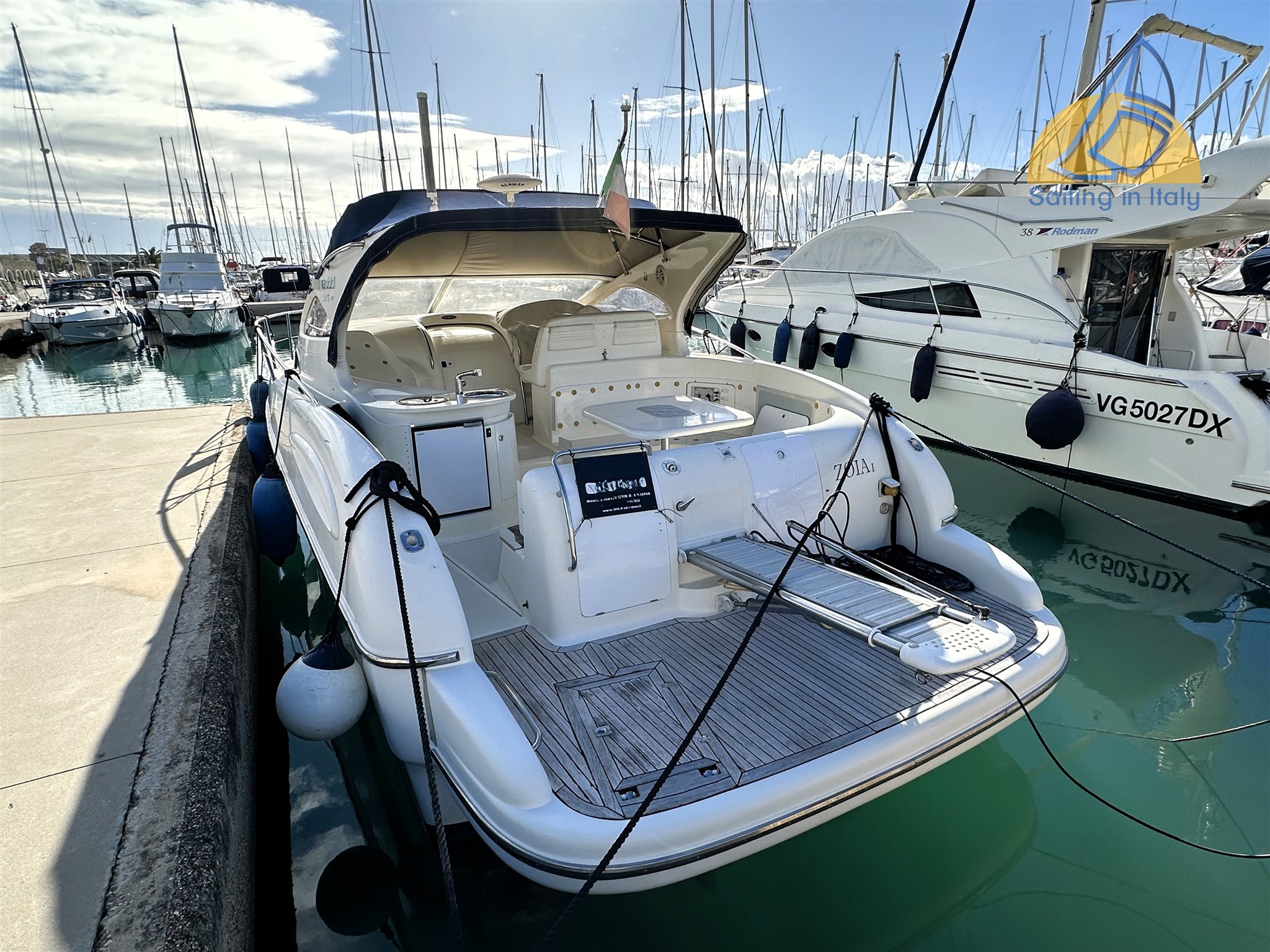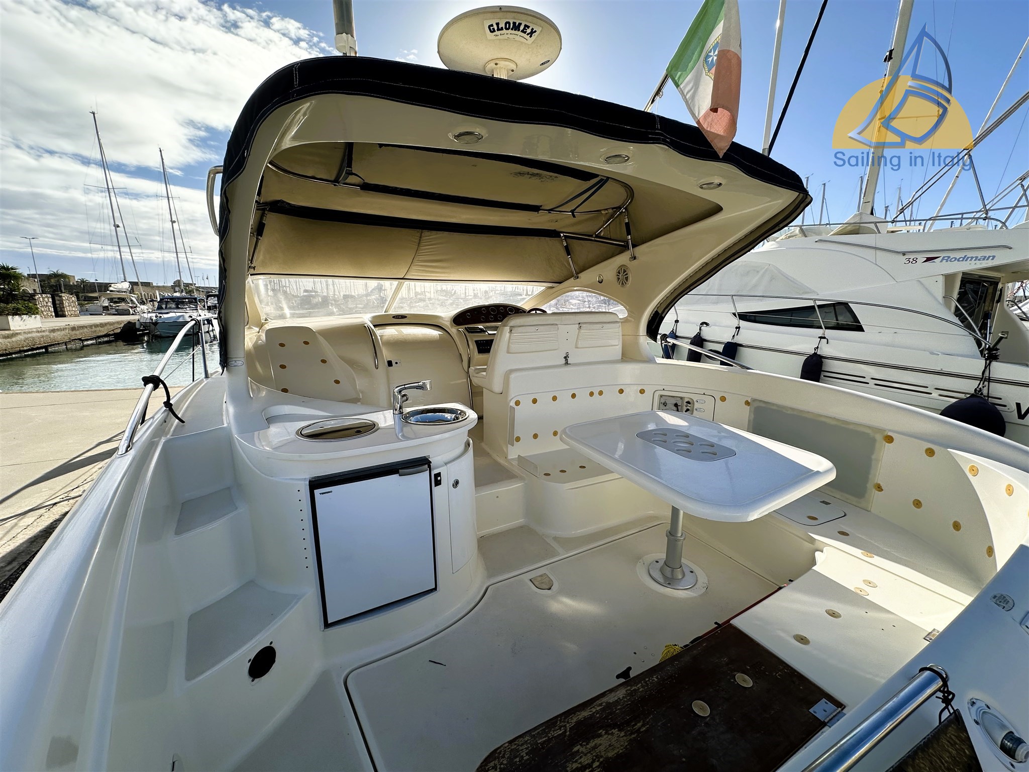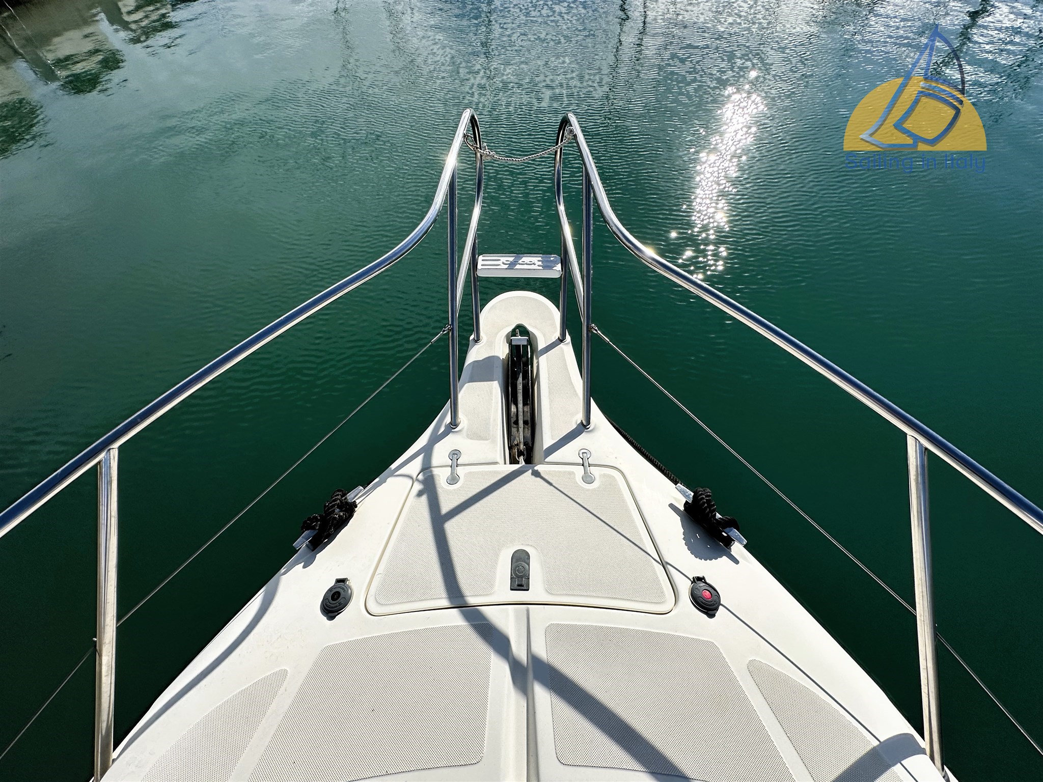 Passerella idraulica ; Elica di prua (bow thruster) ; Flap elettrici ; Salpa ancora elettrico con musone inox nuovo 2023 ; Tavolo pozzetto elettrico trasformabile in ampio prendisole ; Piattaforma bagno + scaletta ; Doccia esterna ; Bimini a chiusura completa + copripozzetto ; Cuscinerie complete ; Rubinetteria esterna sostituita nel 2023