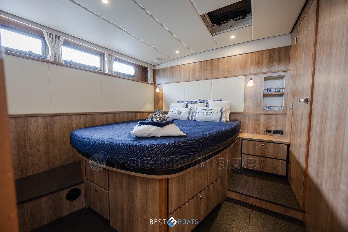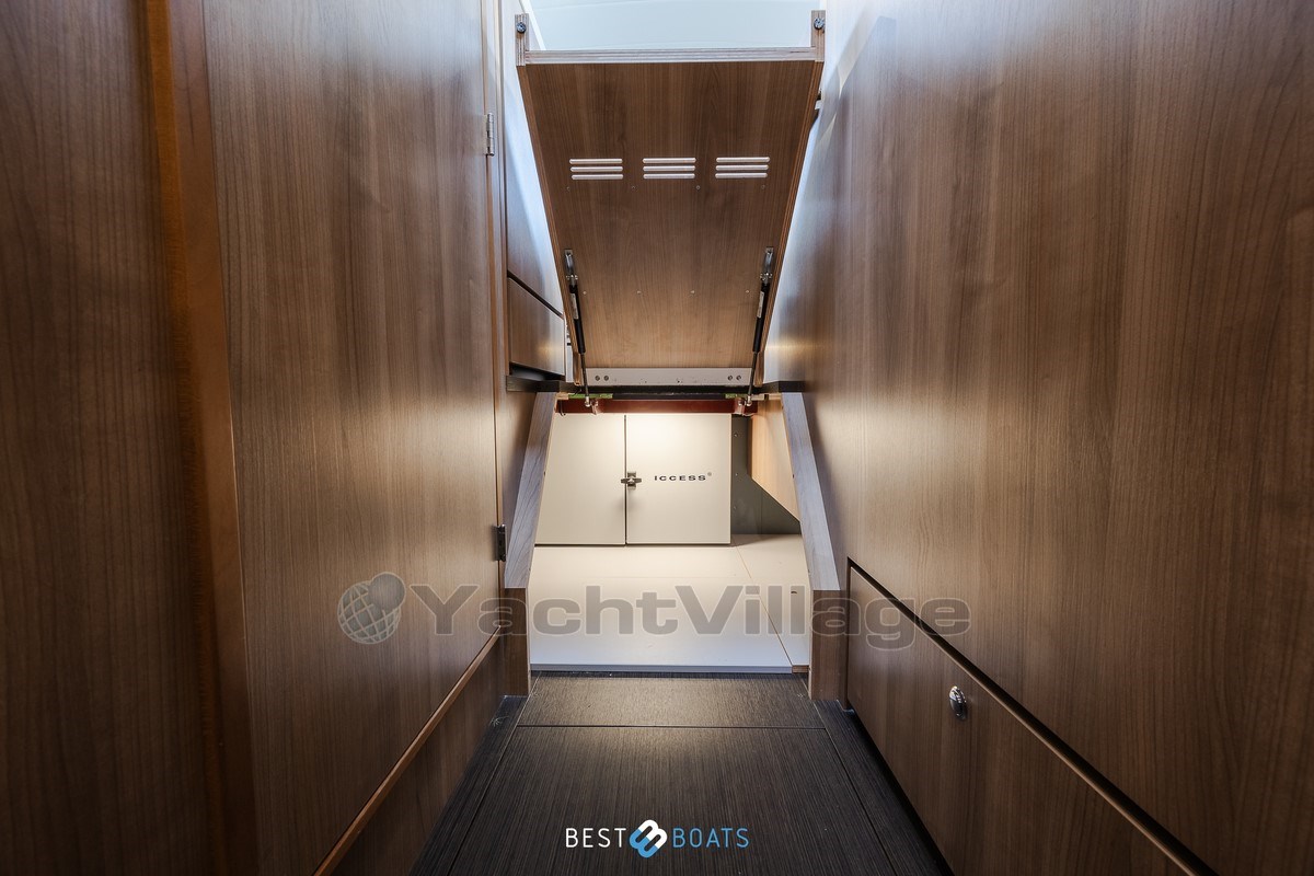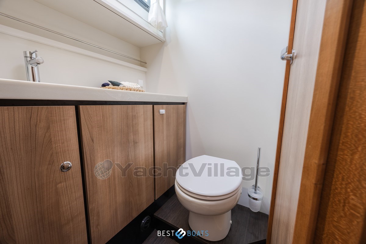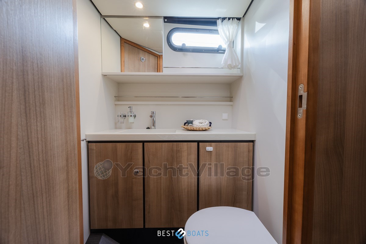 A bordo troverai due cabine spaziose e uguali, ciascuna dotata di un letto matrimoniale comodo, un bagno privato e un water elettrico. Inoltre, lo yacht dispone di una terza cabina con due letti singoli e ampio spazio armadio – ideale per la famiglia o gli ospiti.