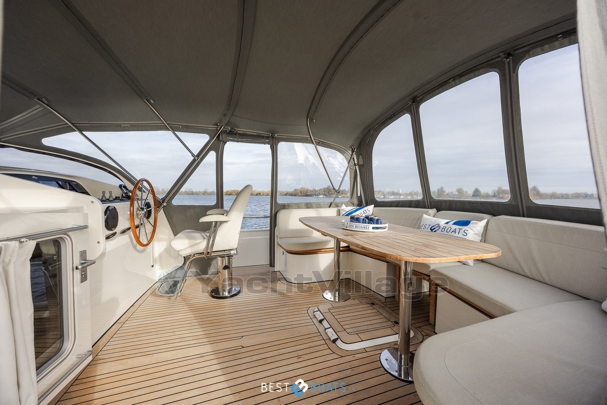 All'esterno, il spazioso ponte di poppa offre un luogo meraviglioso per rilassarsi. I comodi cuscini dei sedili, la tenda a pozzetto completamente bloccabile e il riscaldamento del ponte garantiscono che tu possa sederti comodamente all'aperto in qualsiasi stagione – dalle serate estive alle fredde giornate primaverili.