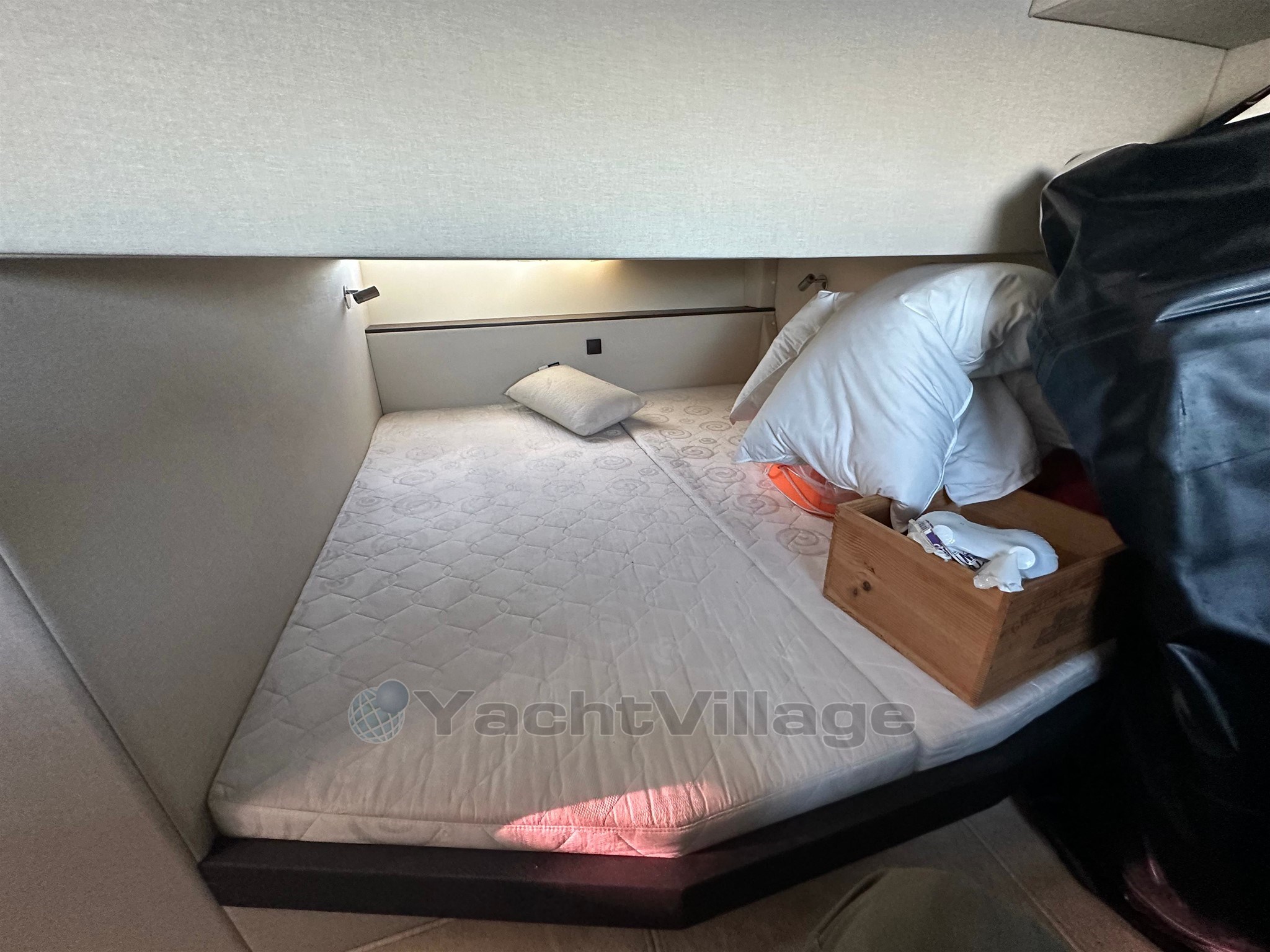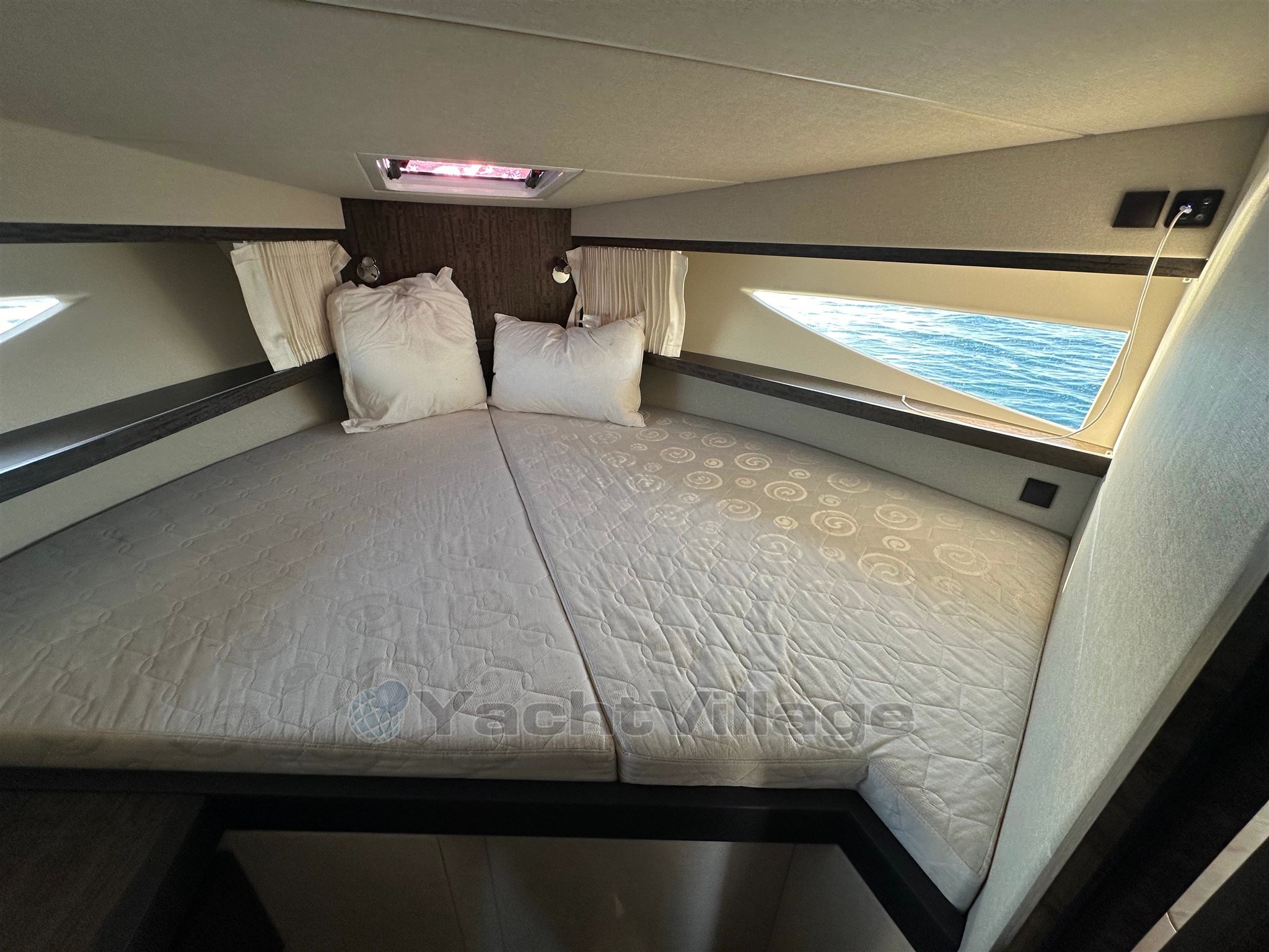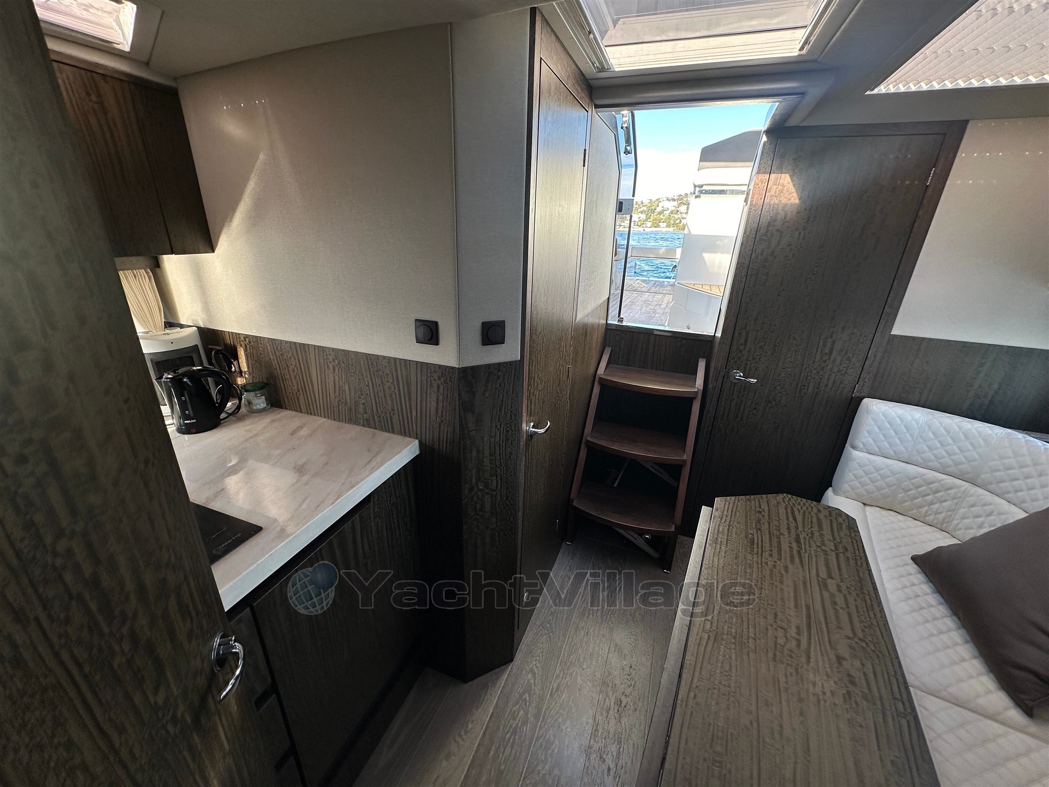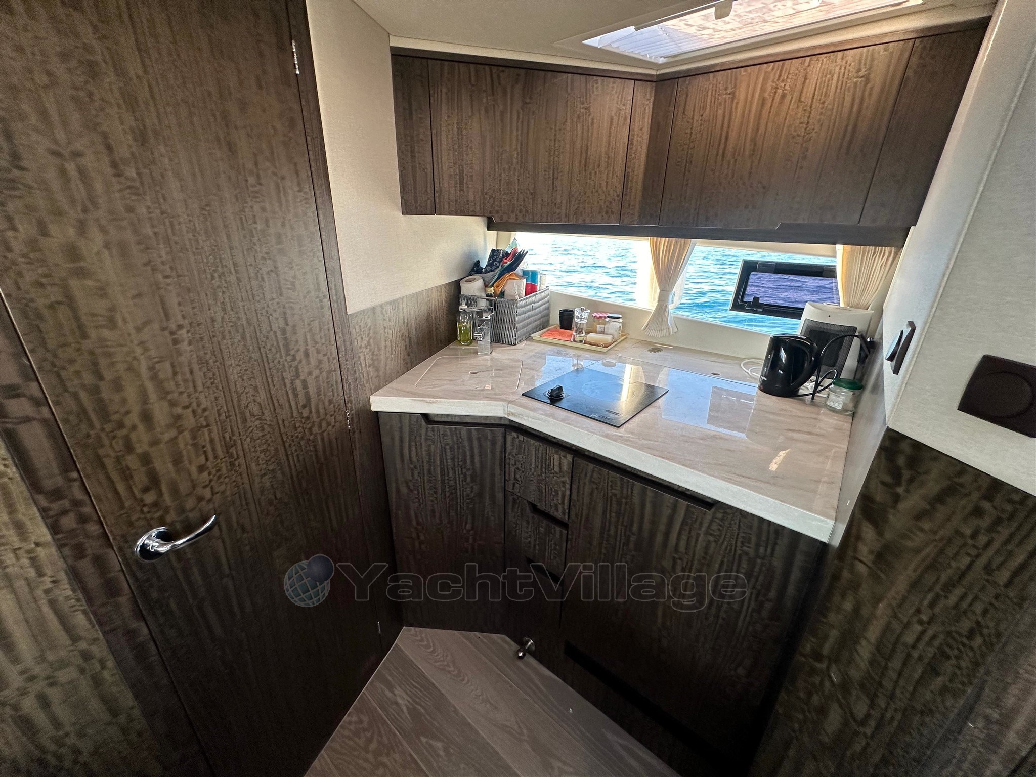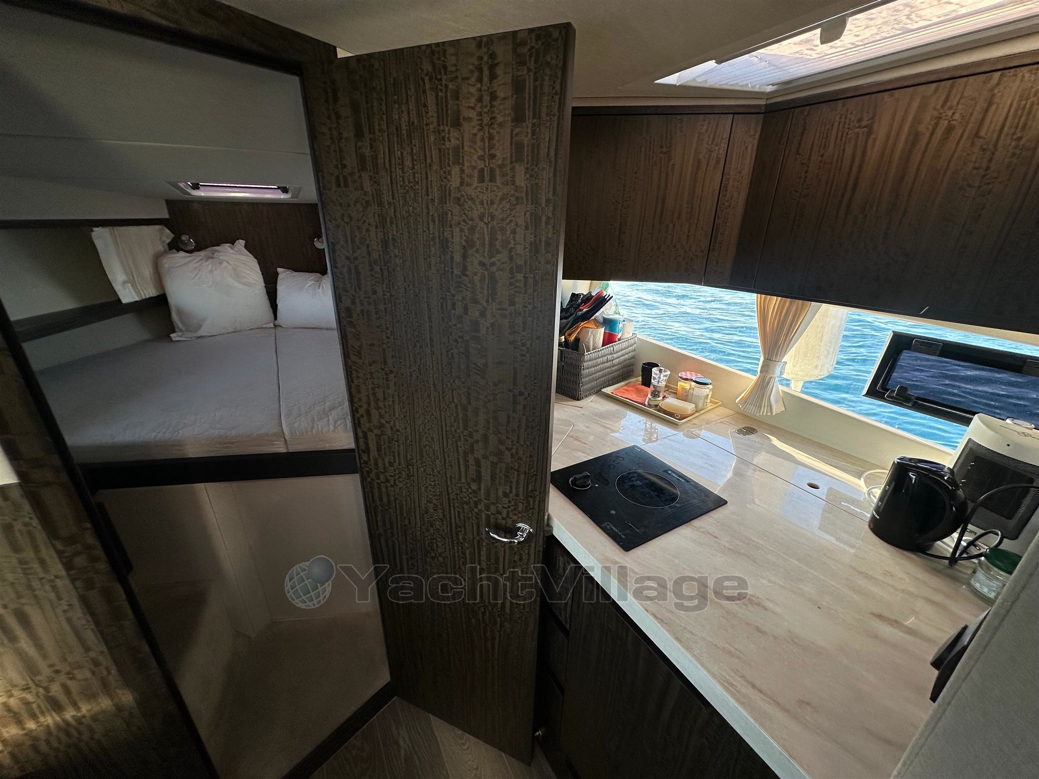 All'interno, la disposizione è progettata per offrire volume e capacità di accoglienza reale. La barca offre due cabine e un salone conviviale, che consente un alloggio confortevole fino a quattro posti da letto permanenti. Il bagno è completo, con doccia separata e WC elettrico, che migliora significativamente il comfort a bordo durante le crociere di più giorni. La cucina interna è attrezzata per un uso pratico: frigorifero, congelatore, fornello e microonde, accompagnati da una macchina per il ghiaccio, particolarmente apprezzata in estate.