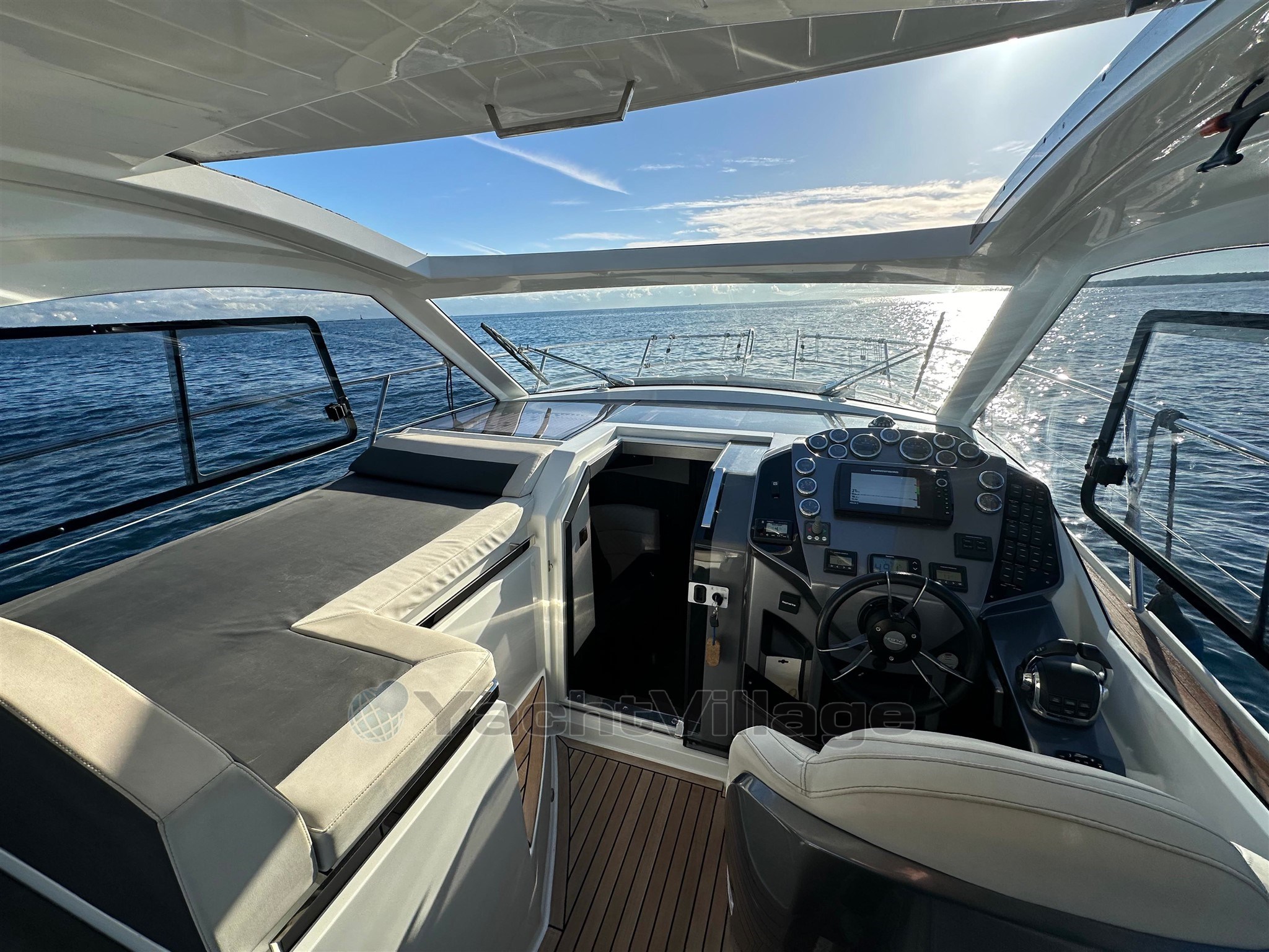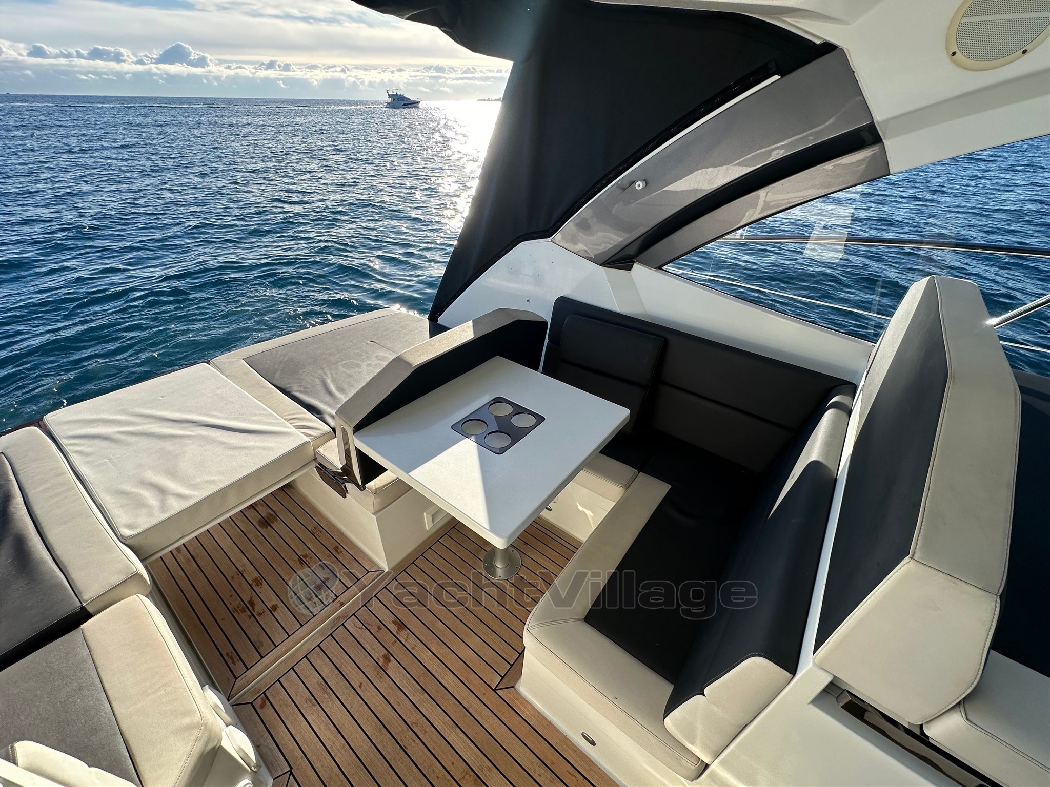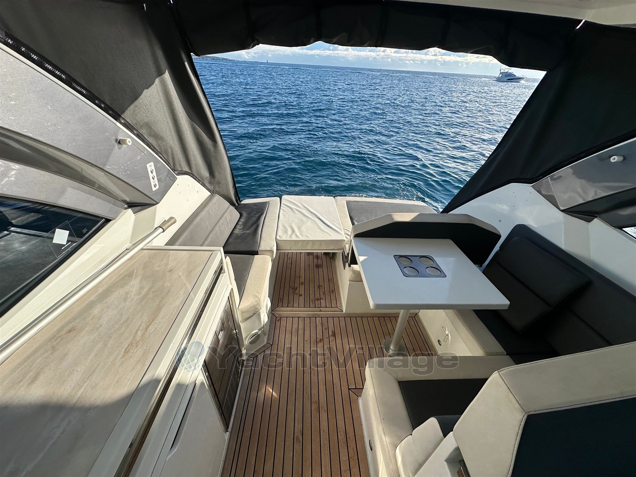 All'esterno, il cockpit è progettato per la convivialità: offre una bellissima zona giorno, un tavolo a pozzetto, sedie comode e copertine solari, con una circolazione fluida verso la piattaforma per il bagno. Il tetto rigido offre una protezione efficace dal sole e dal vento, mantenendo al contempo uno spirito "aperto" grazie alla sua apertura e luminosità. Il ponte e/o il cockpit in teak rafforzano la qualità percepita e offrono una finitura premium. La piattaforma per il nuoto con scala permette un facile accesso al mare e il ritorno dal nuoto, accompagnata da una doccia a cabina di pilotaggio per il risciacquo. La barca dispone anche di un vernicione elettrico con ancora, essenziale per ancoraggi confortevoli. I flap permettono di ottimizzare il trim durante la navigazione in base al carico e allo stato del mare.