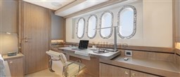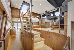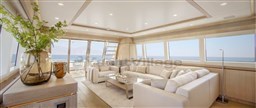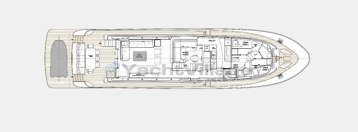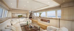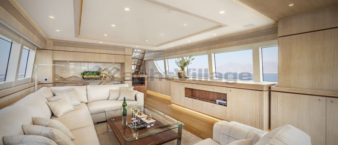 Layout con un ampio salone principale con divani e poltrone e un'ampia zona salotto nella timoneria, con cucina a prua con piani in corian (anche nei bagni). Day toilet.