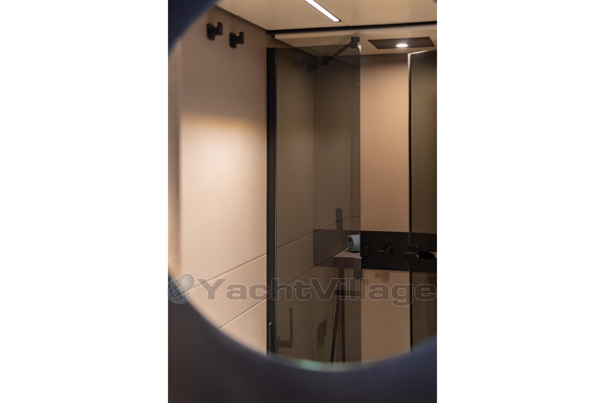 La rivestimenteria è "greige" nella versione Smooth, e un tappetino Econyl copre le assi del pavimento con riflessi "lucidati".