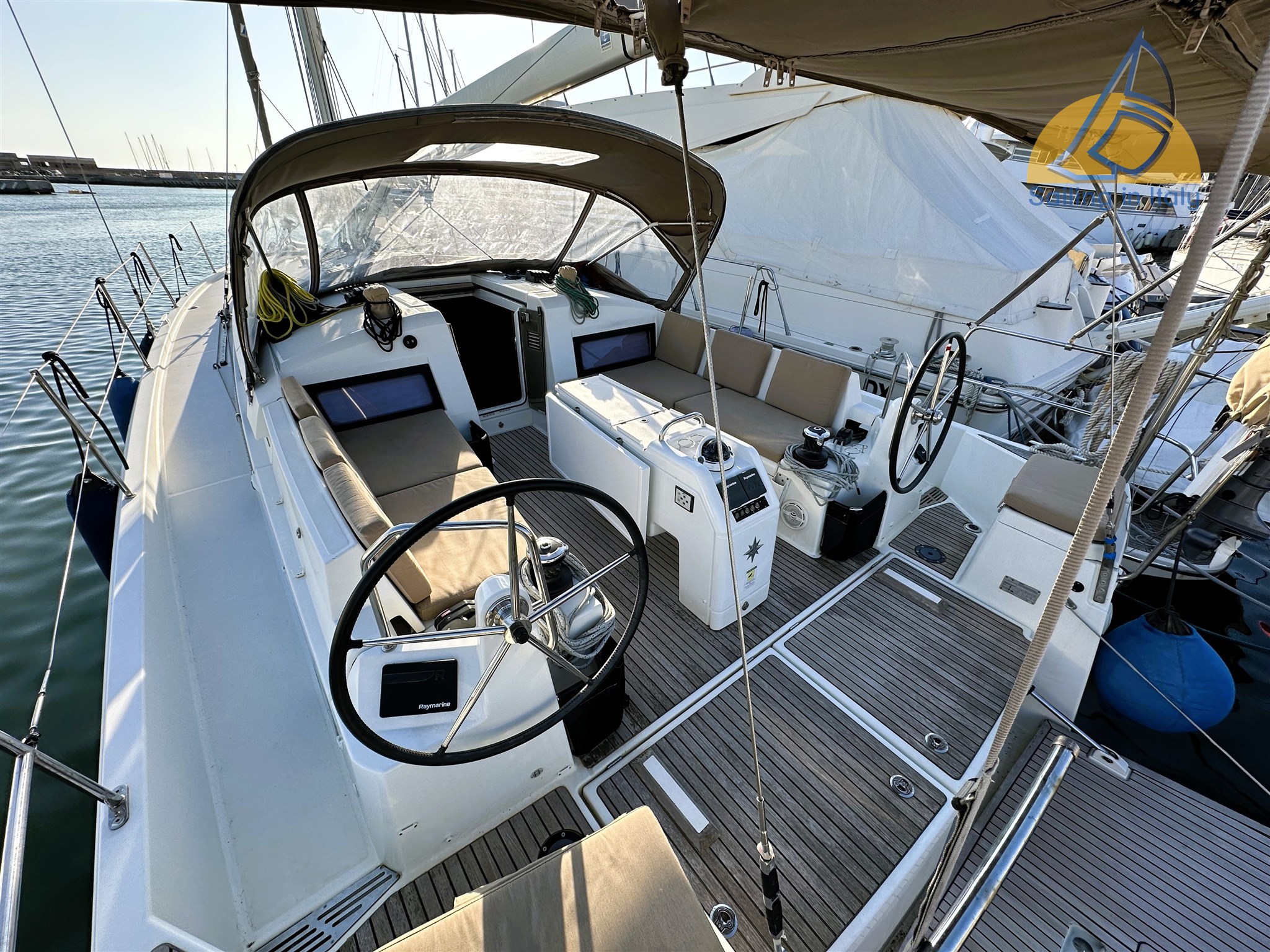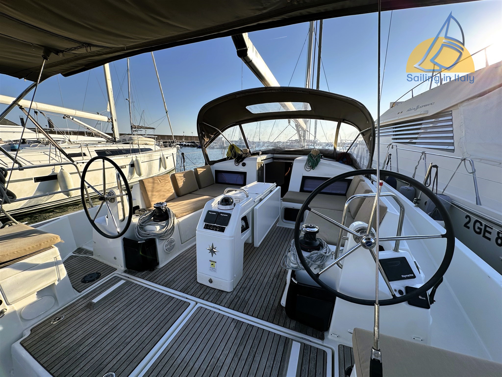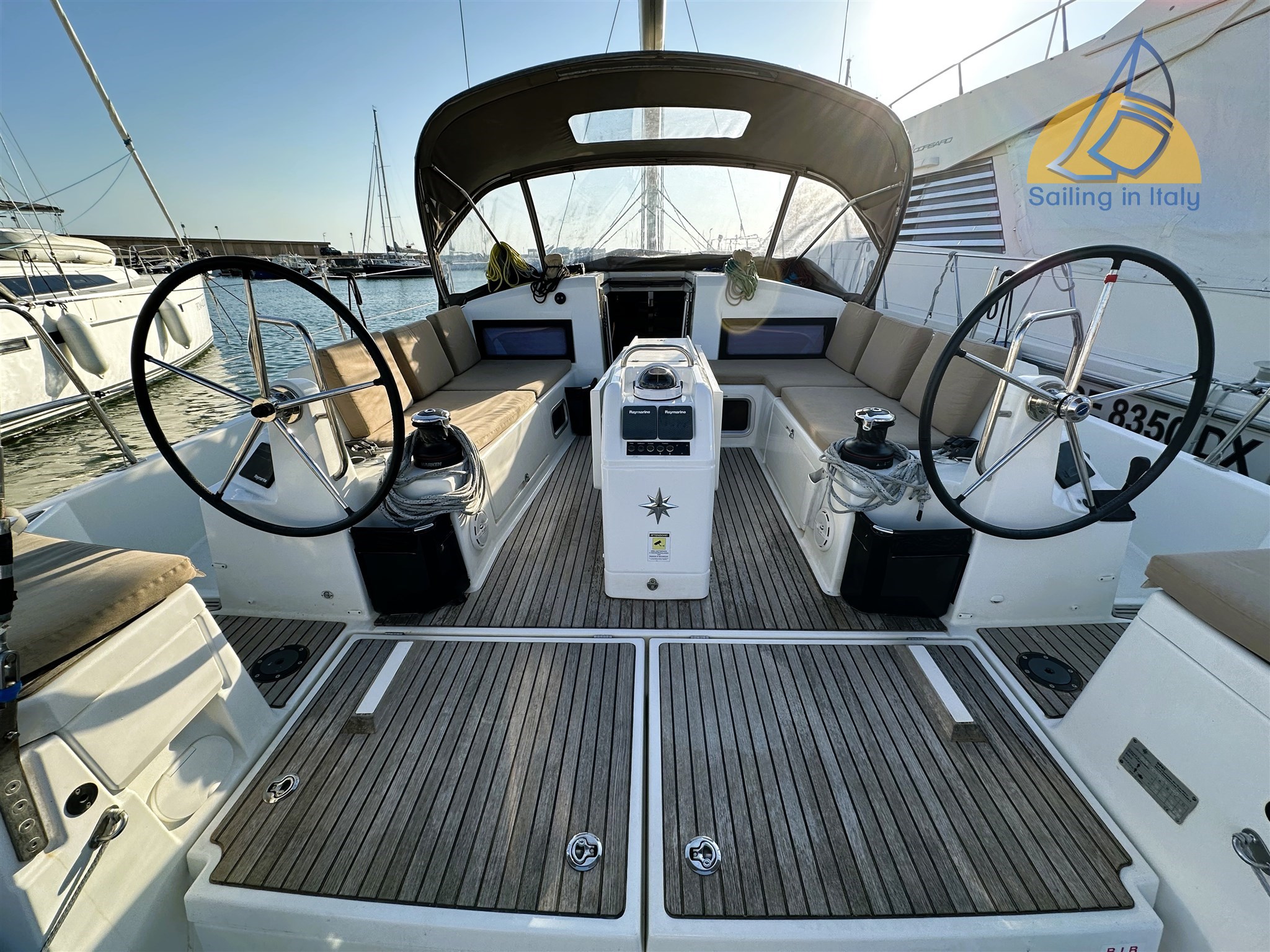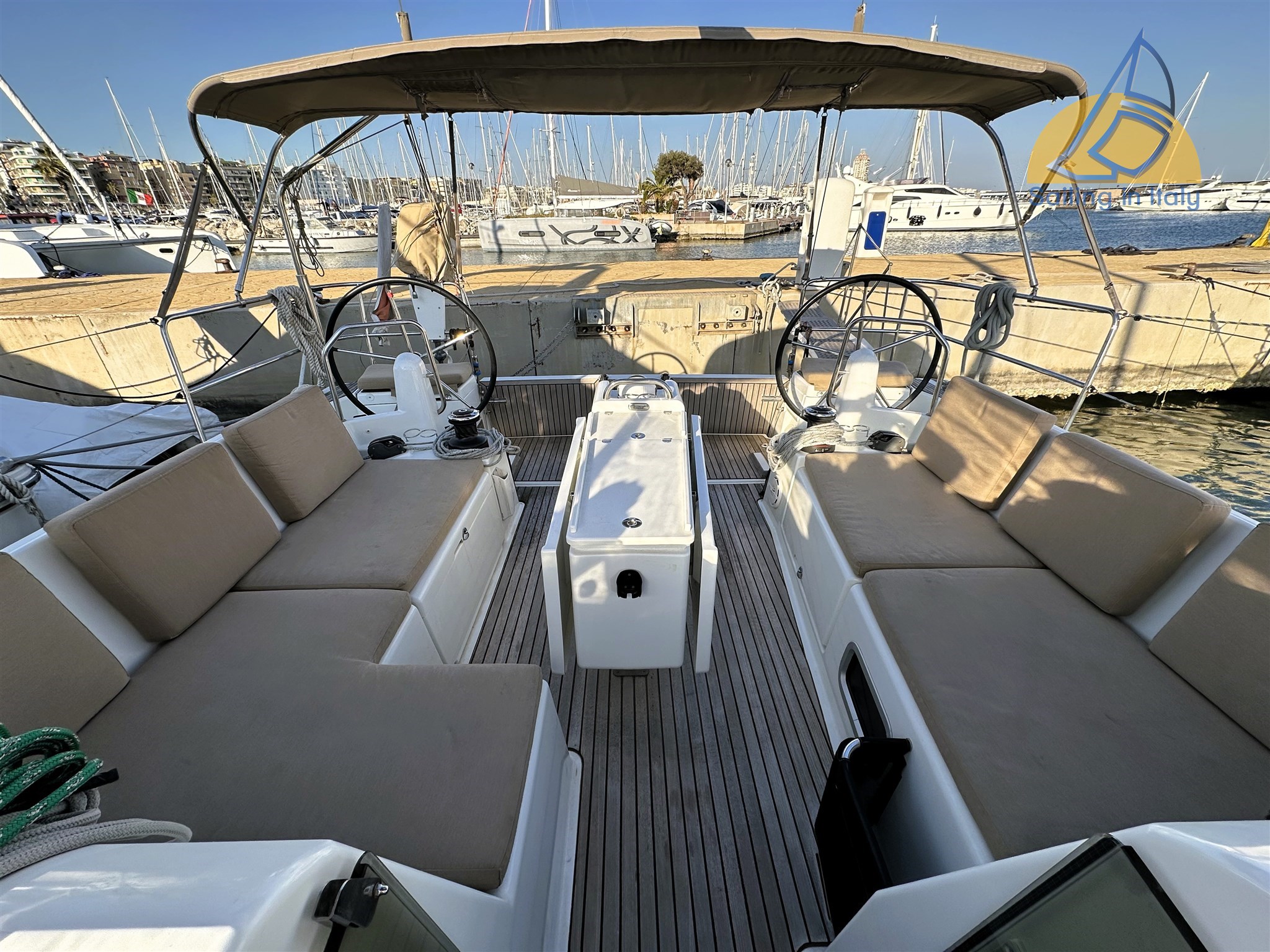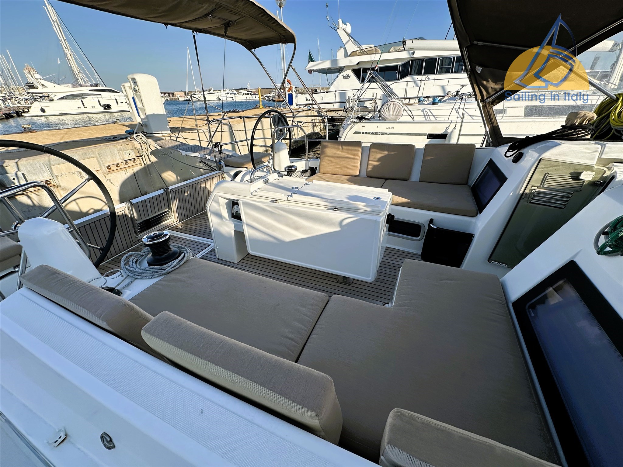 Двухколёсная рубка; Носовой двигатель; Гидравлическая кормовая платформа с дистанционным управлением; Гидравлический переход Opacmare ; Кокпит из тика с столом; Бимини + навес; Лебёдка Harken (1 электрическая); Накрытие лебёдки; Прикрытие рулевой рубки; Большой, функциональный кокпит идеально подходит для опыта лодки на якоре.
