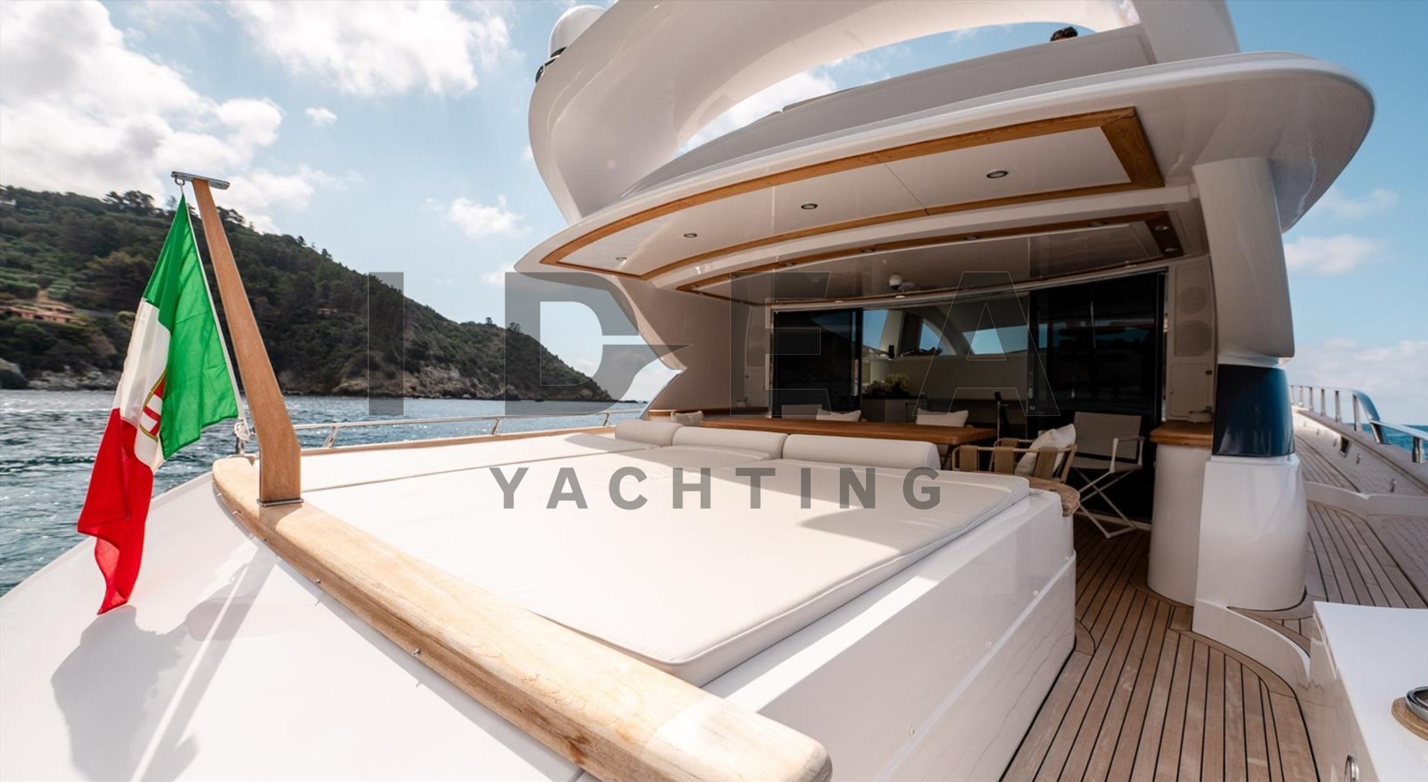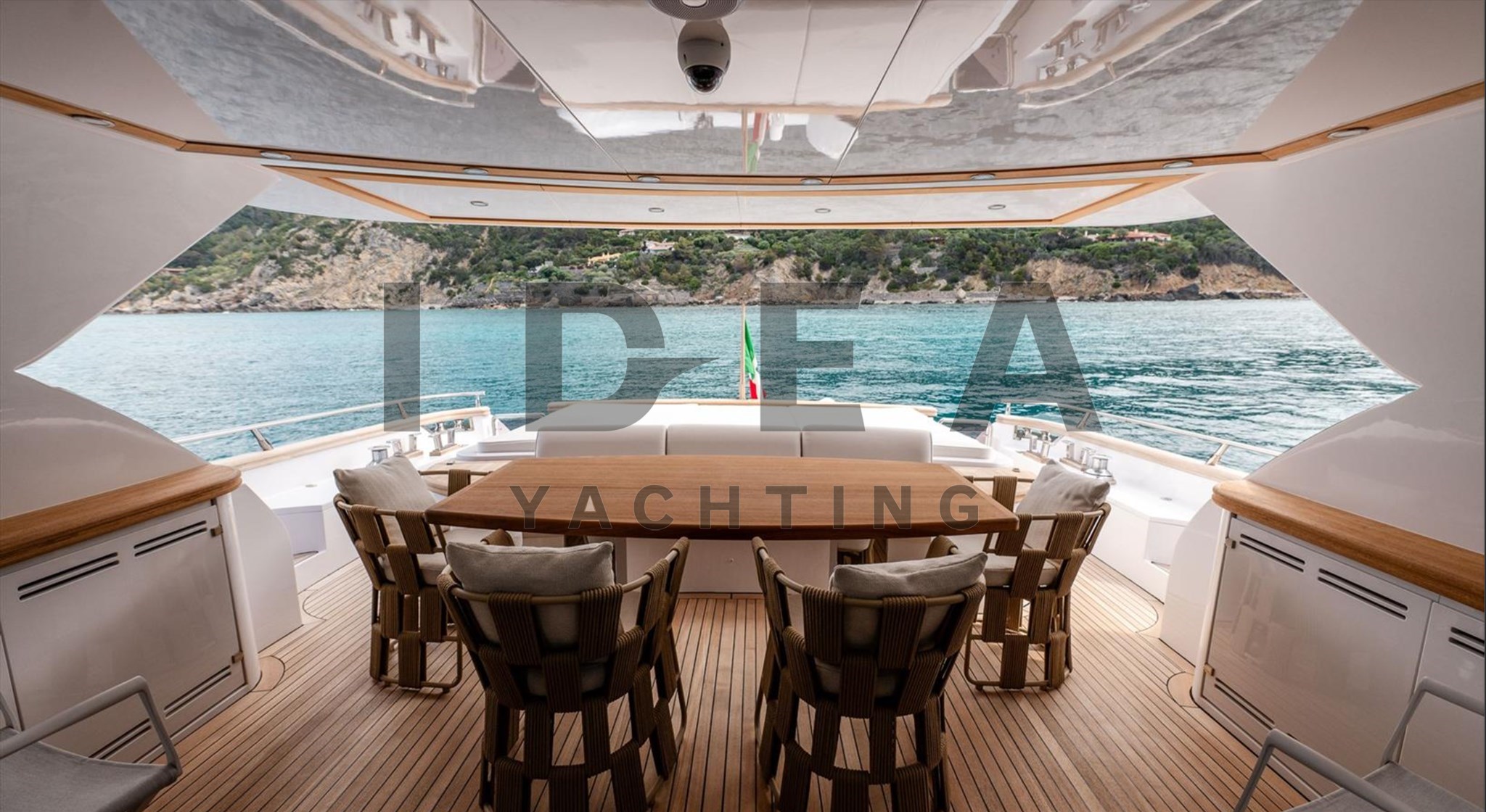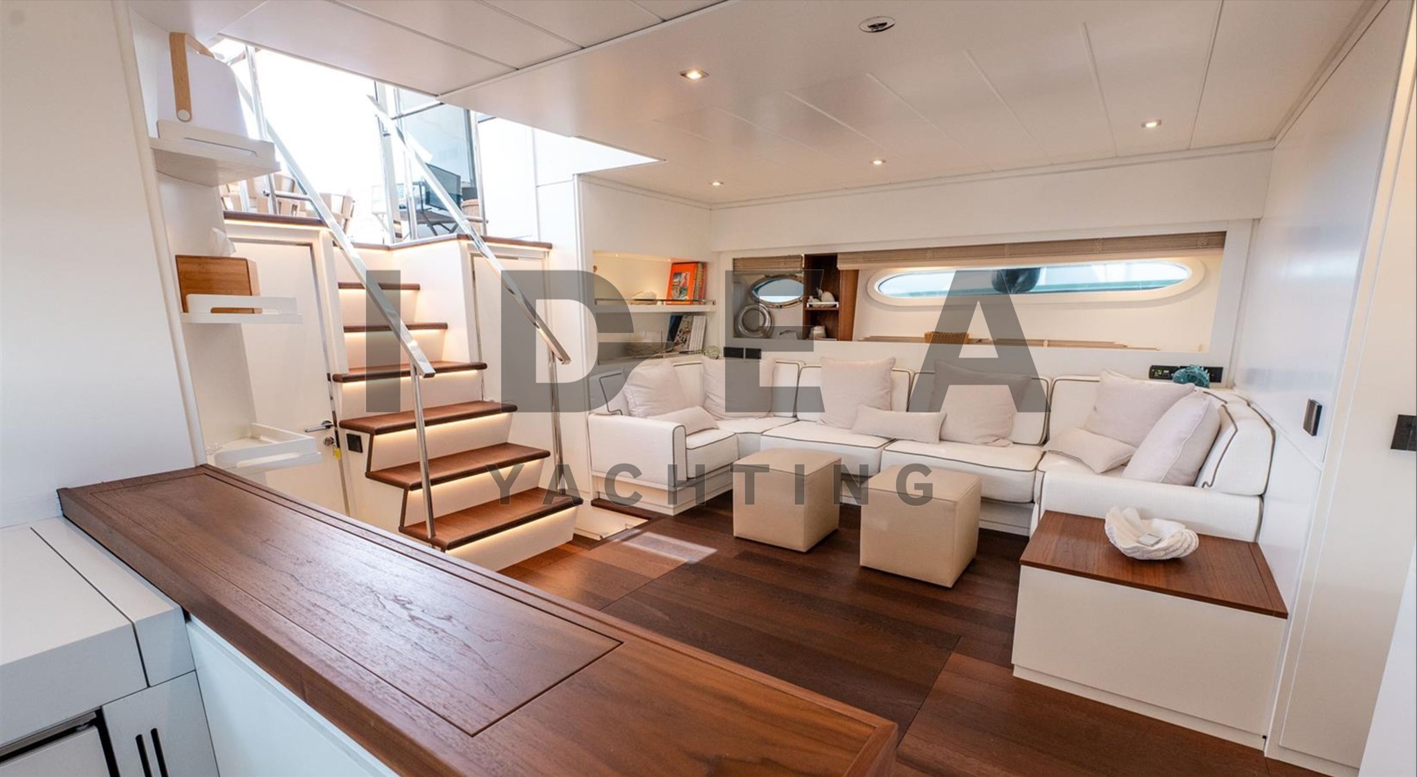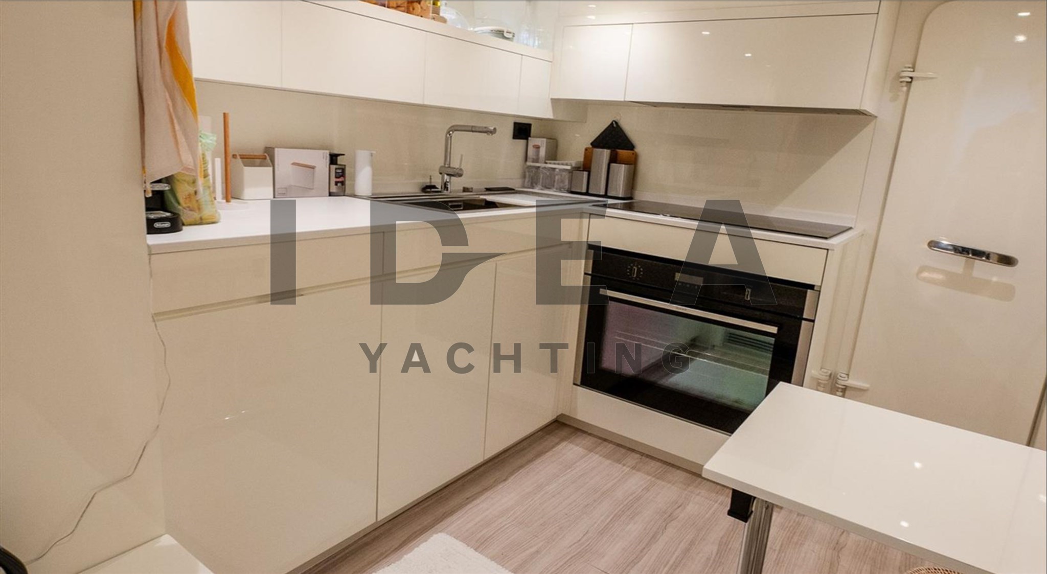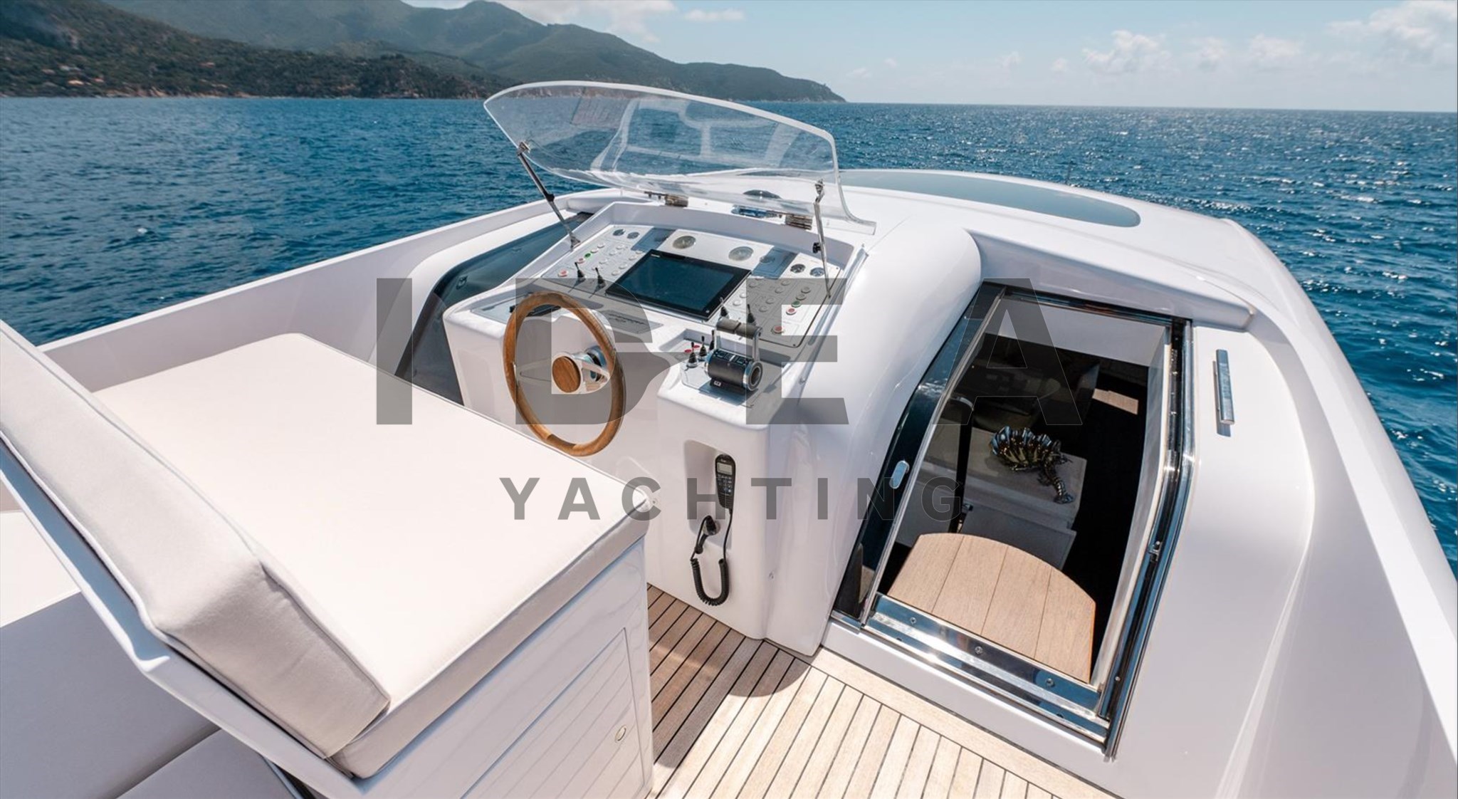 Красивая открытая спортивная яхта с большим пространством благодаря верхней палубе, полной света, и красивой столовой на 10 человек, рядом с рулевой станцией у нас есть камбуз, полностью оснащённый всей бытовой техникой, совершенно новый и небольшой салон с двойным диванным столиком для обеда.