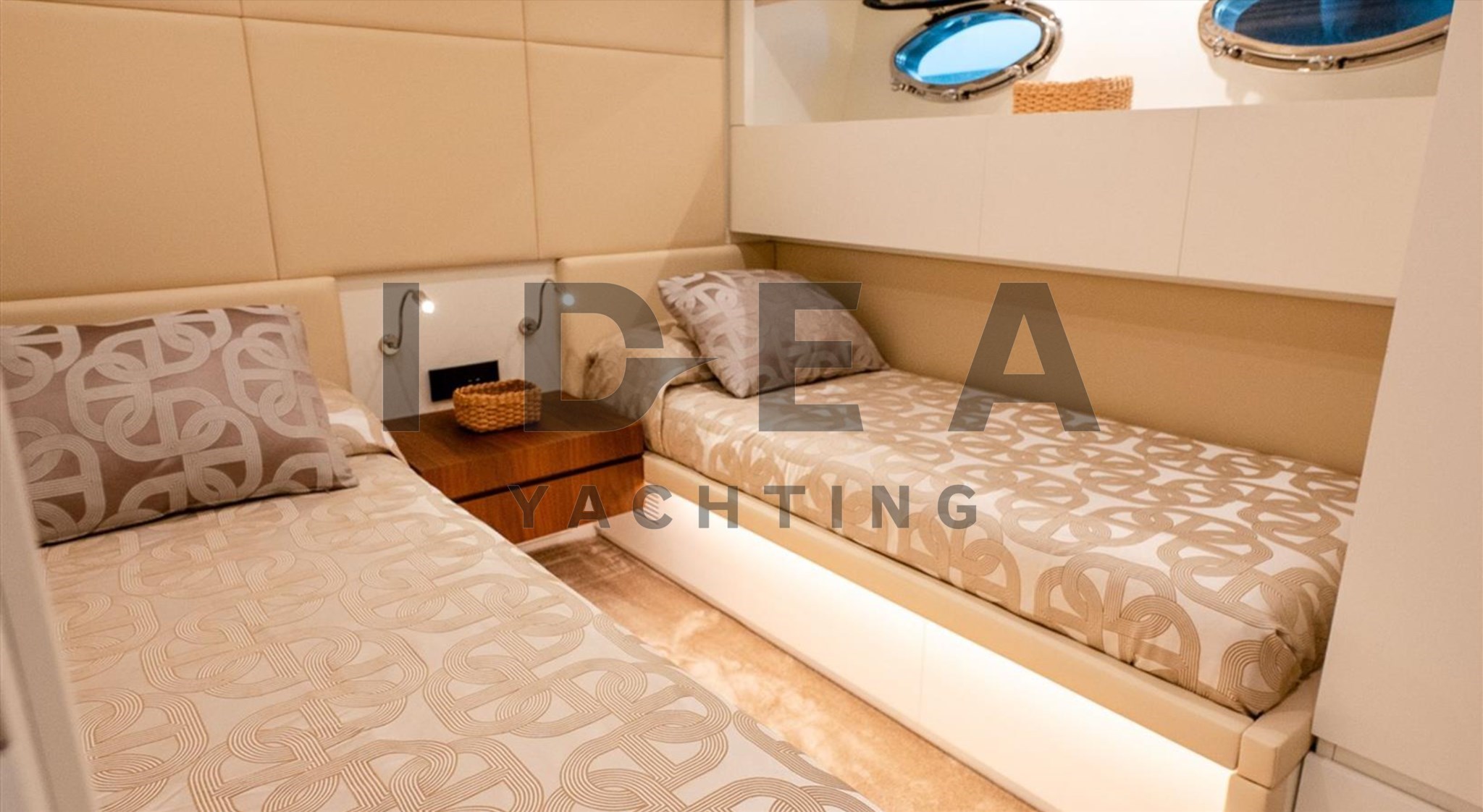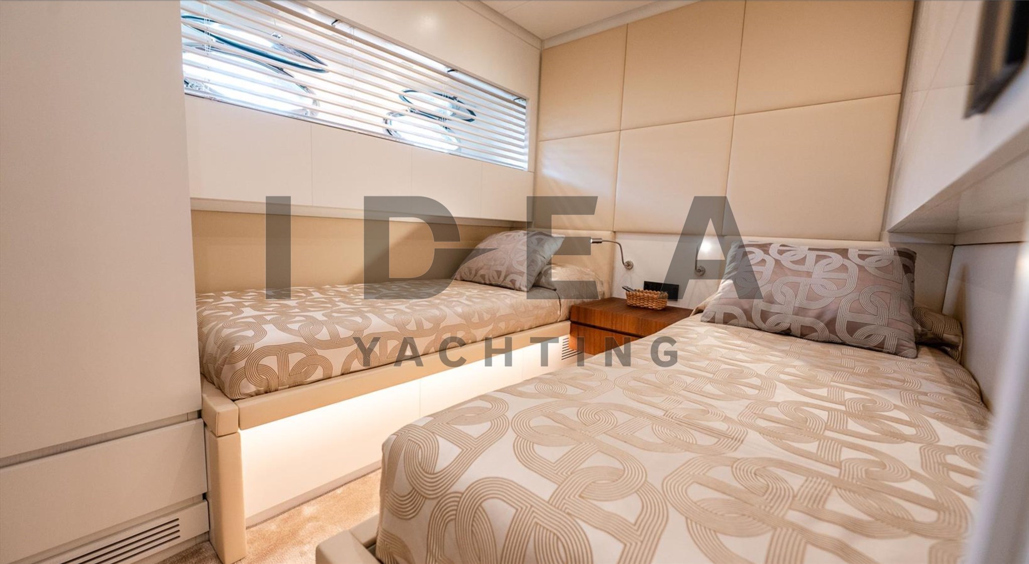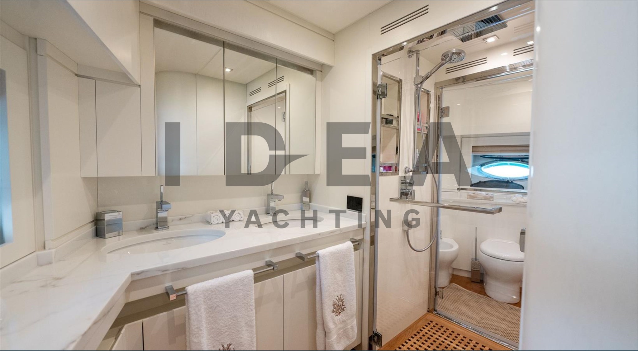 На нижней палубе у нас главный салон, амидишип, мастер-двухместная каюта с ванной комнатой, VIP-двухместная каюта с передним номером, две гостевые каюты с односпальной кроватью, одна с пуллманом, собственная ванная и другая каюта с ванной, которую можно использовать для экипажа или как пятая гостевая каюта. На носу, с отдельным входом, находится вторая двухместная каюта с собственными удобствами.