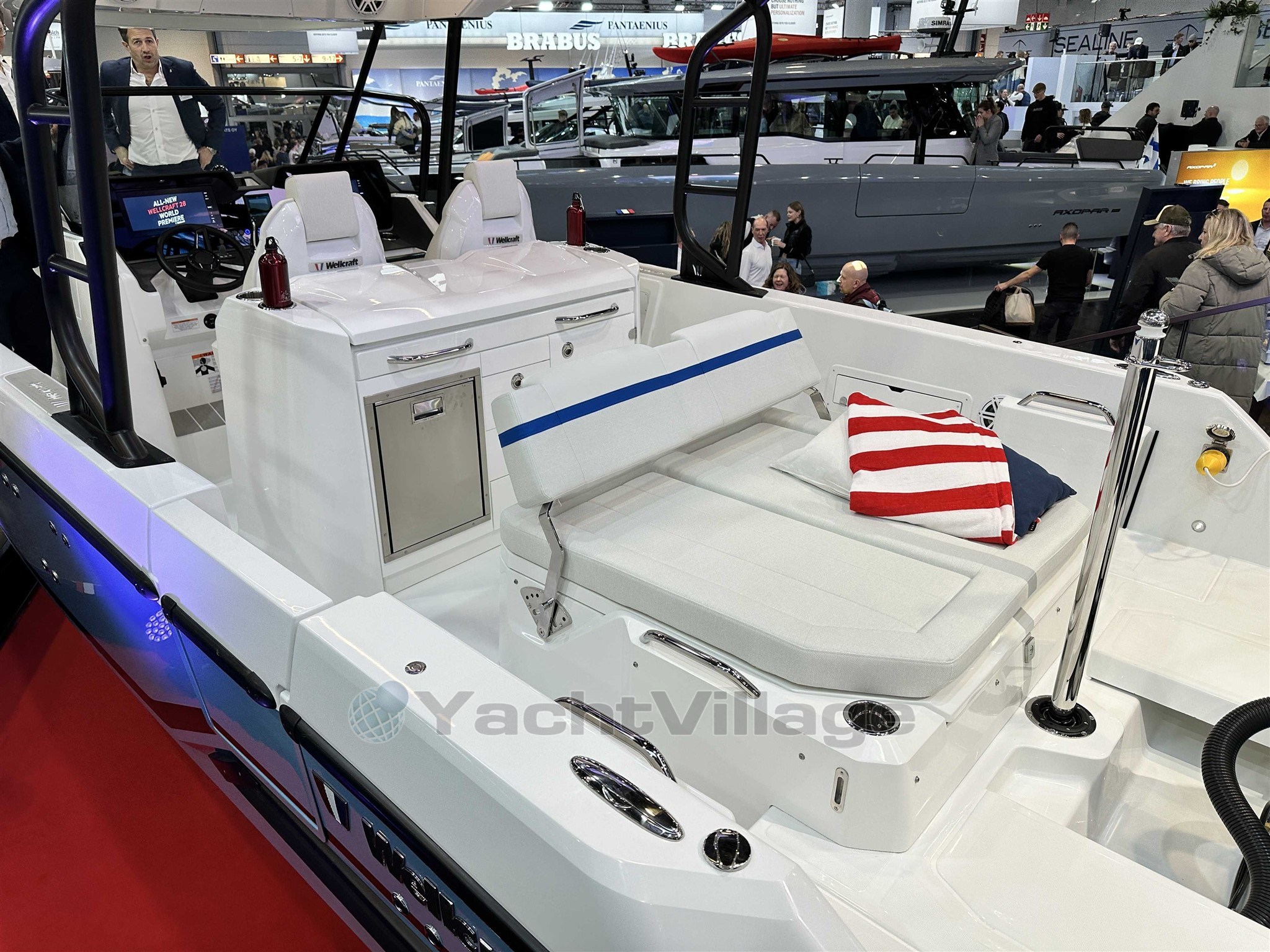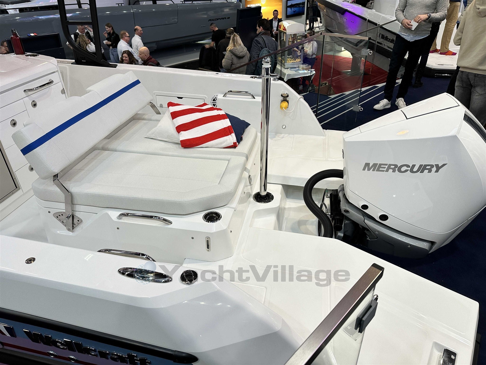 Wellcraft 28 T-Top blue hull, Mercury 300 XXL V8 white, T-Top with high windscreen, Desert cockpit upholstery, Première trim, forward cabin pack, fresh water pack, anchor pack, Garmin electronics pack, Fusion audio pack, 2 additional central cleats, protective cover, removable ski mast, Desert front table and cushion, bow thruster, 2 LED bars on T-Top, Gas BBQ, 51 L refrigerator, electric flaps and manual sunroof.