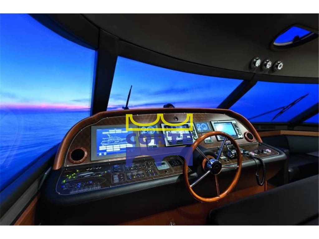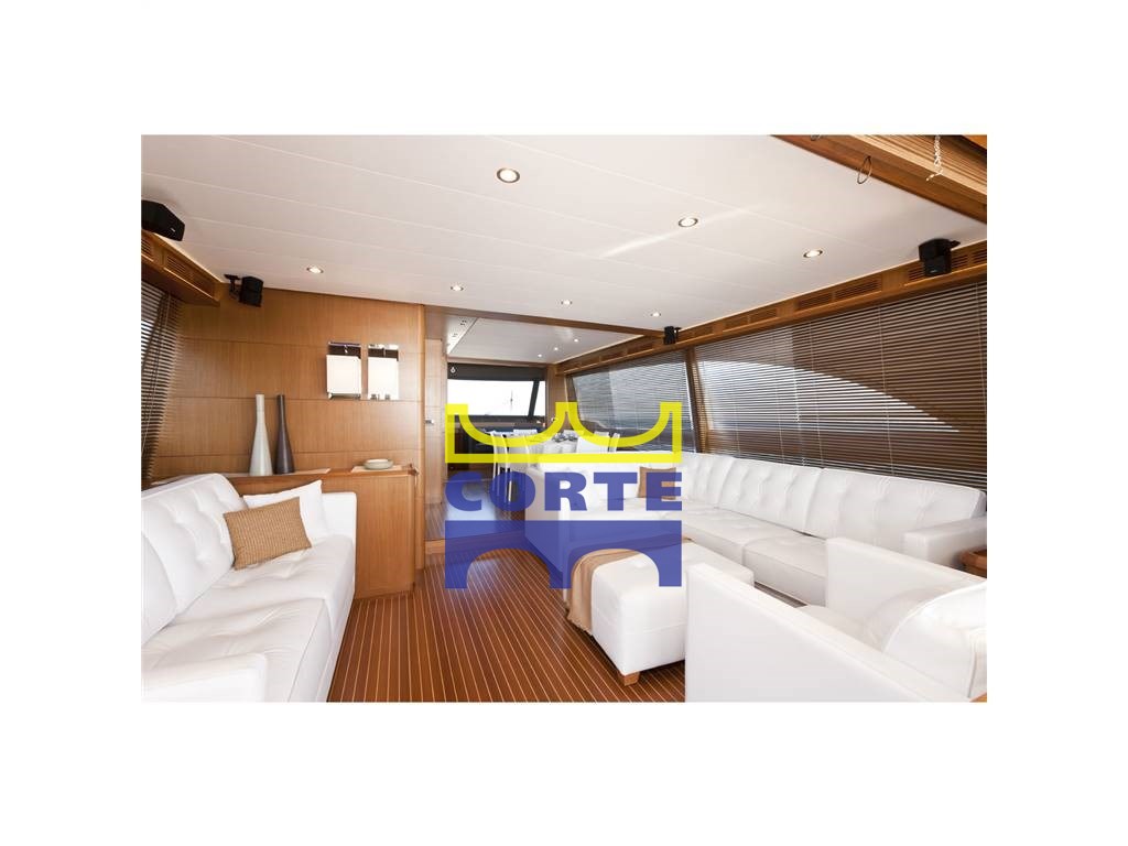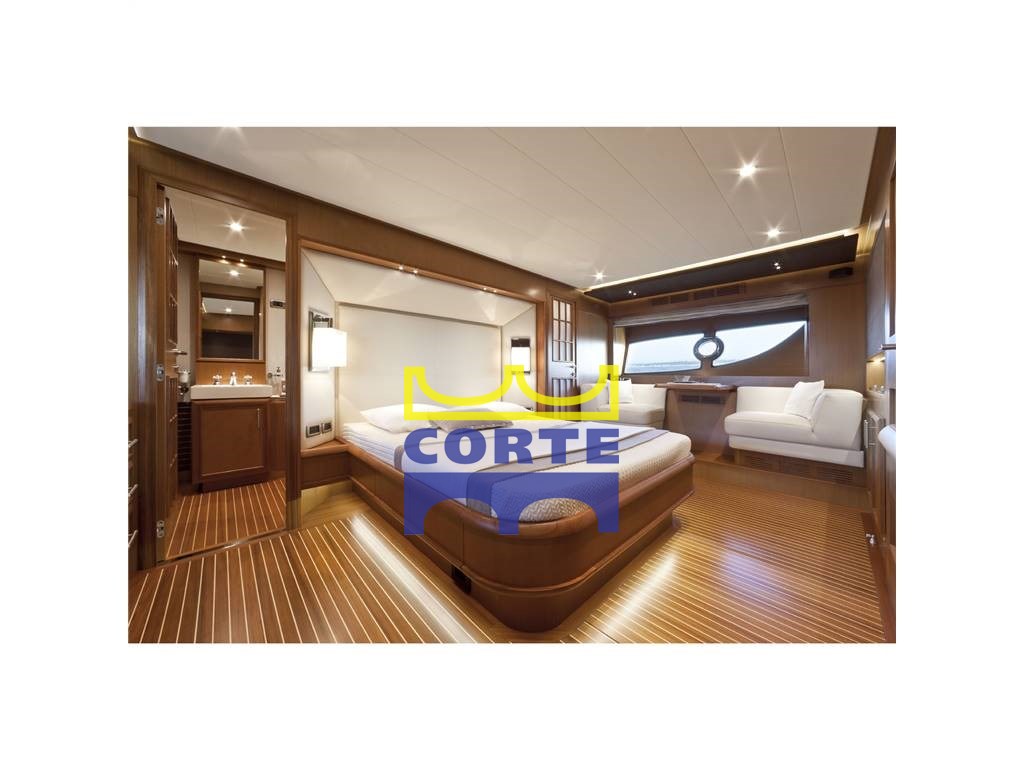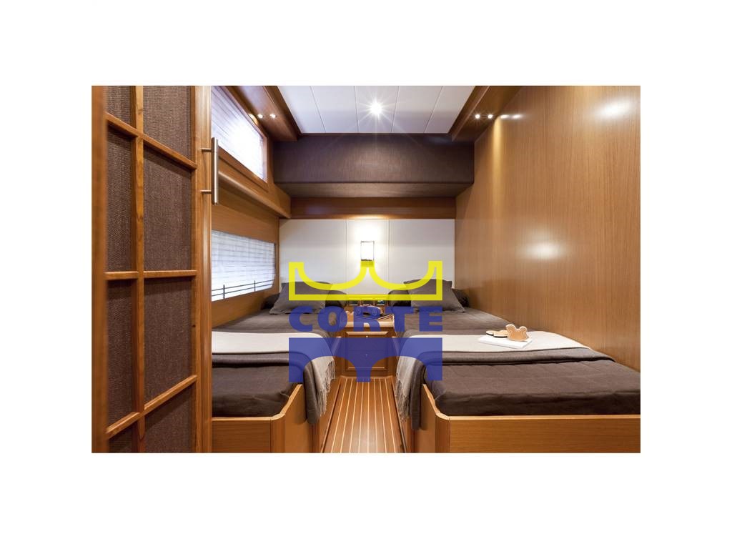 Гостиная с двумя светлыми кожаными диванами, электрическим выдвижным телевизором, тиковым зенезианом, держателем для бутылок в гостиной, овальным значком стола, восемью кожаными креслами, выдвижной раздвижной дверью для доступа в зону управления, выдвижной входной дверью для прохода кухни-столовой, n.2 боковых дверей для доступа к внешним проходам, дверью доступа в гостиную из раздвижной кабины с откидным окном, 4 каюты, одна из которых является владельцем посреди лодки, двухместная каюта в носовой части и две гостевые каюты, одна с кроватью на французском и одна с плоскими кроватями, все каюты с собственной ванной комнатой, две матросские каюты с выходом из кухни и ванной комнаты, прачечная с отдельной стиральной машиной-сушилкой в зоне маринаций без непрозрачной мебели из тикового дерева, кленовый полосатый тиковый пол, ковровое покрытие,