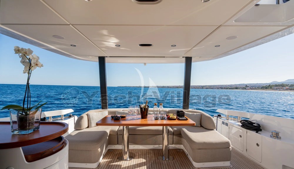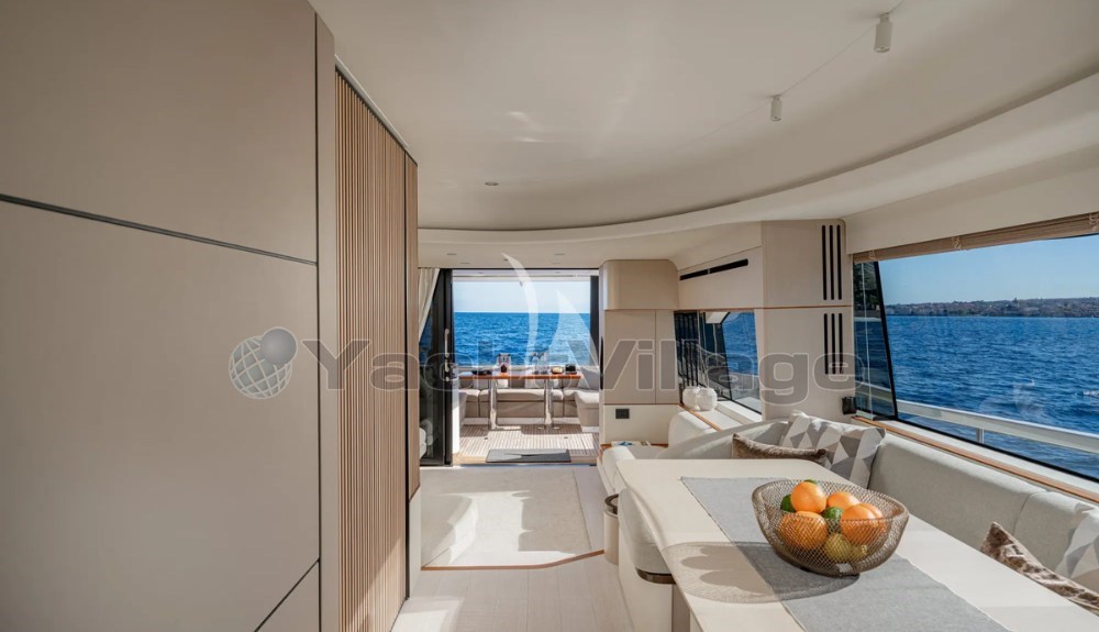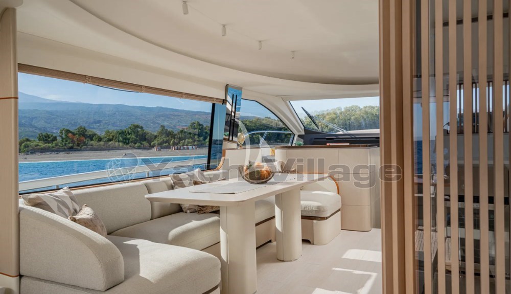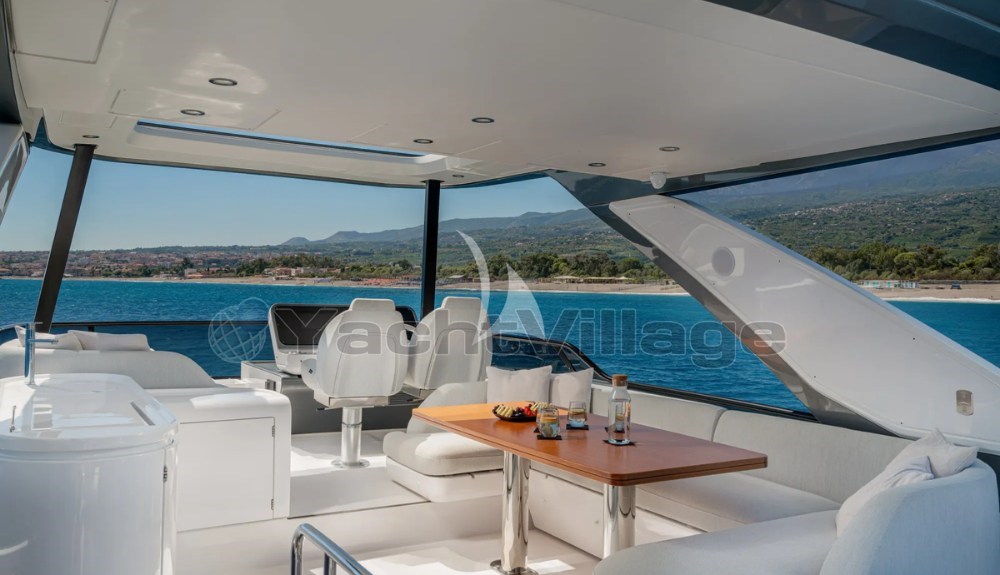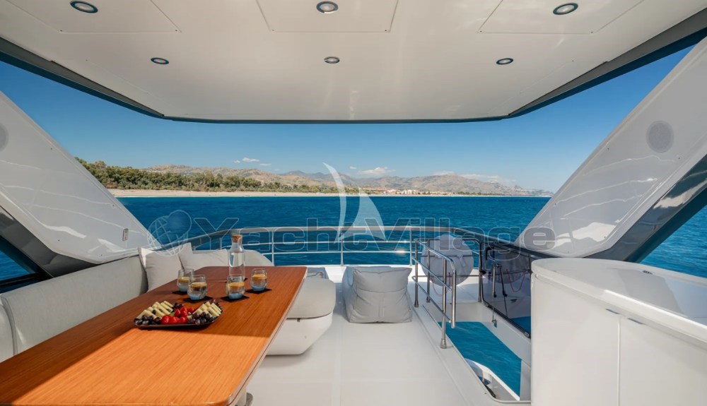 Открытые пространства просторные и хорошо спроектированные, включая просторный флайбридж с зонами для солнца и обеда, универсальный носовой лаунж и кормовой кокпит, идеально подходящий для общения на борту.