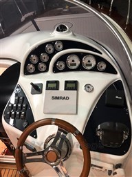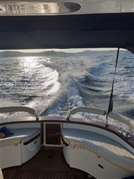 В частности, пост управления, украшенный рулем из красного дерева, хорошо защищен от ветра и брызг благодаря круговому ветровому стеклу с профилем из нержавеющей стали. Сиденье пилота с обивкой, разработанной для комфортного вождения в положении стоя, вмещает предмет мебели в задней части, который подходит для многократного использования; Он также скрывает практичную кухню, оборудованную плитой и раковиной.