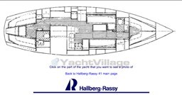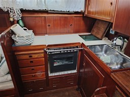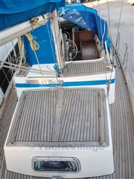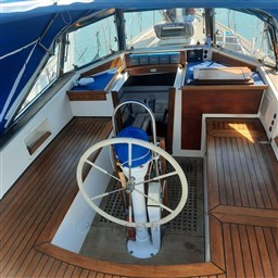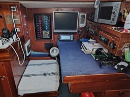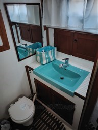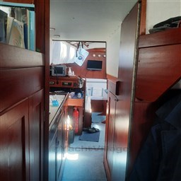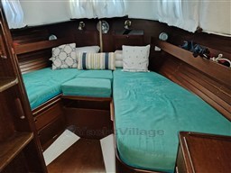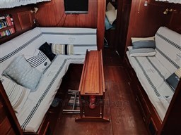 Центральный кокпит с тиковым откидным столиком и светодиодной подсветкой, центральная обеденная зона с прямоугольным столом и двуспальным диваном, один С-образный и один длинный, контейнерный столик для бутылок с откидными крыльями, который может трансформироваться в двуспальную кровать (часть С) и двухъярусную кровать (длинная часть). Мини-кухня с откидной газовой плитой с 3 конфорками и духовкой, холодильником в кокпите, двойной раковиной, комодом и выдвижным рабочим столом. Двухместная мастер-каюта в носовой части с санузлом с душем, открывающимся для частного доступа, гостевая каюта в кормовой части, каюты оборудованы электрическим отоплением с термостатом, портативным кондиционером на 220В в обеденной зоне.