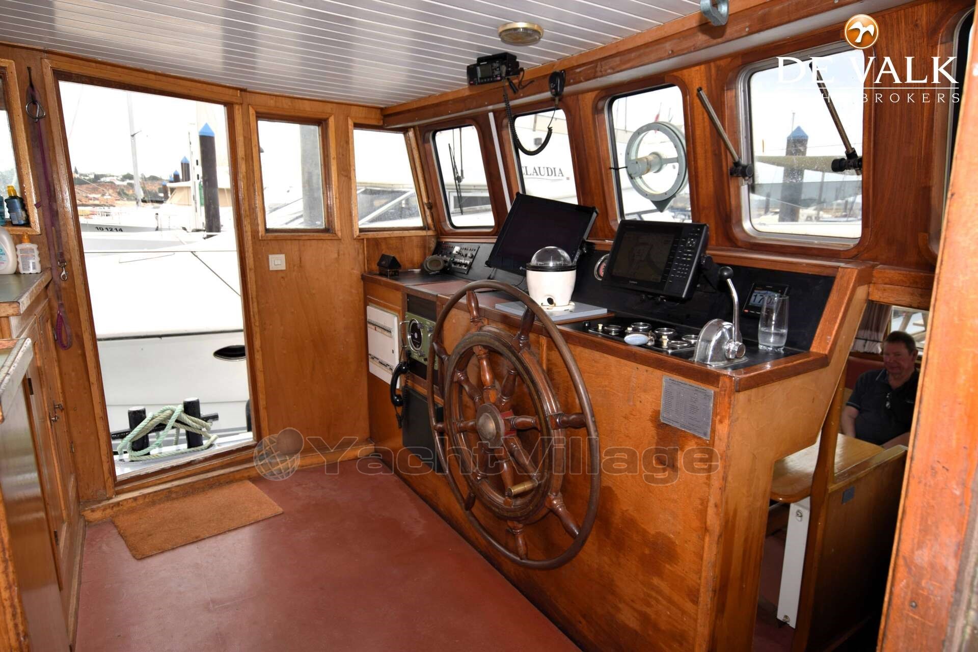 From the spacious pilothouse go down to the decksaloon with180deg. views. Below deck is a large living space with large galley and bar on S.B. and a dining room and TV room on P.S. Further forward is a storage room a bathroom and a 6 berth cabin. From pilothouse going aft there is a large master cabin and access to the engine room. The dining room can be converted back into an extra cabin. Ideal for a large family!