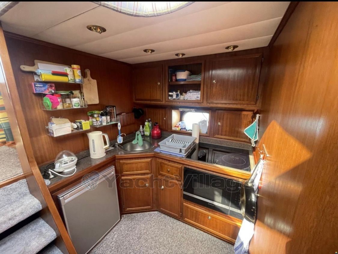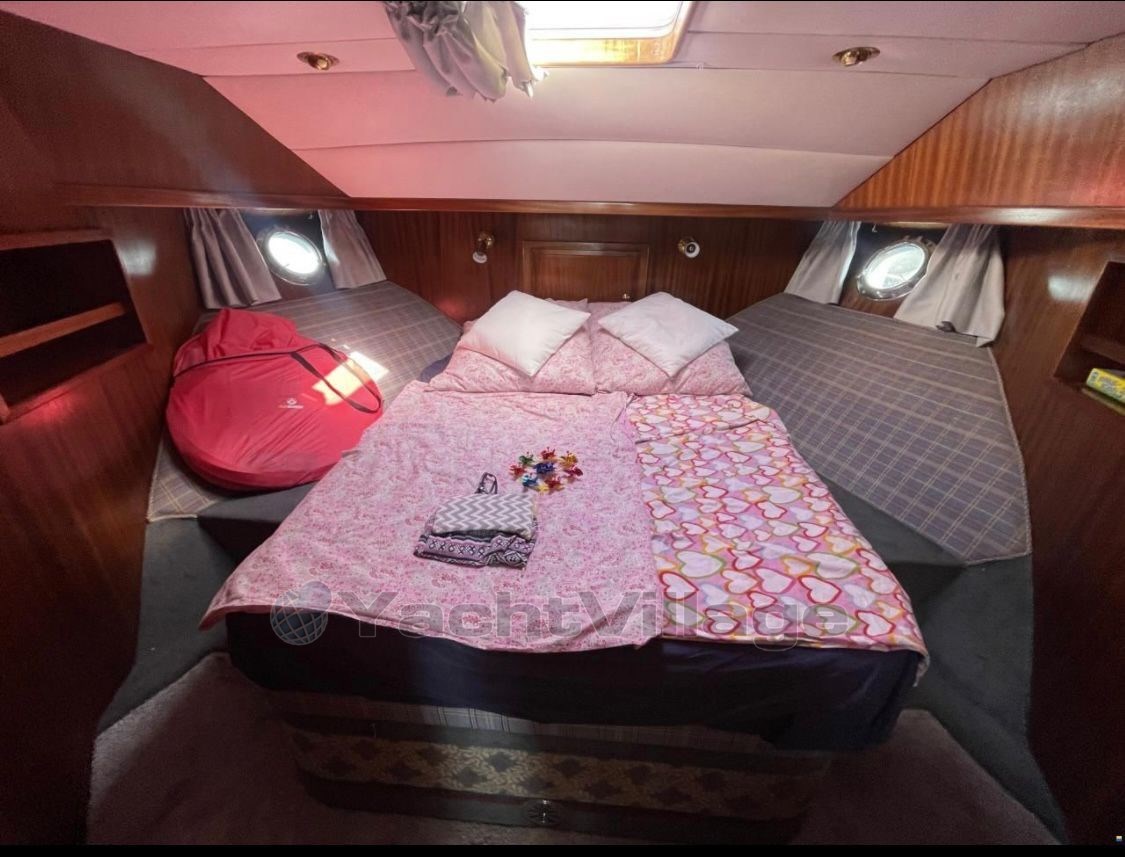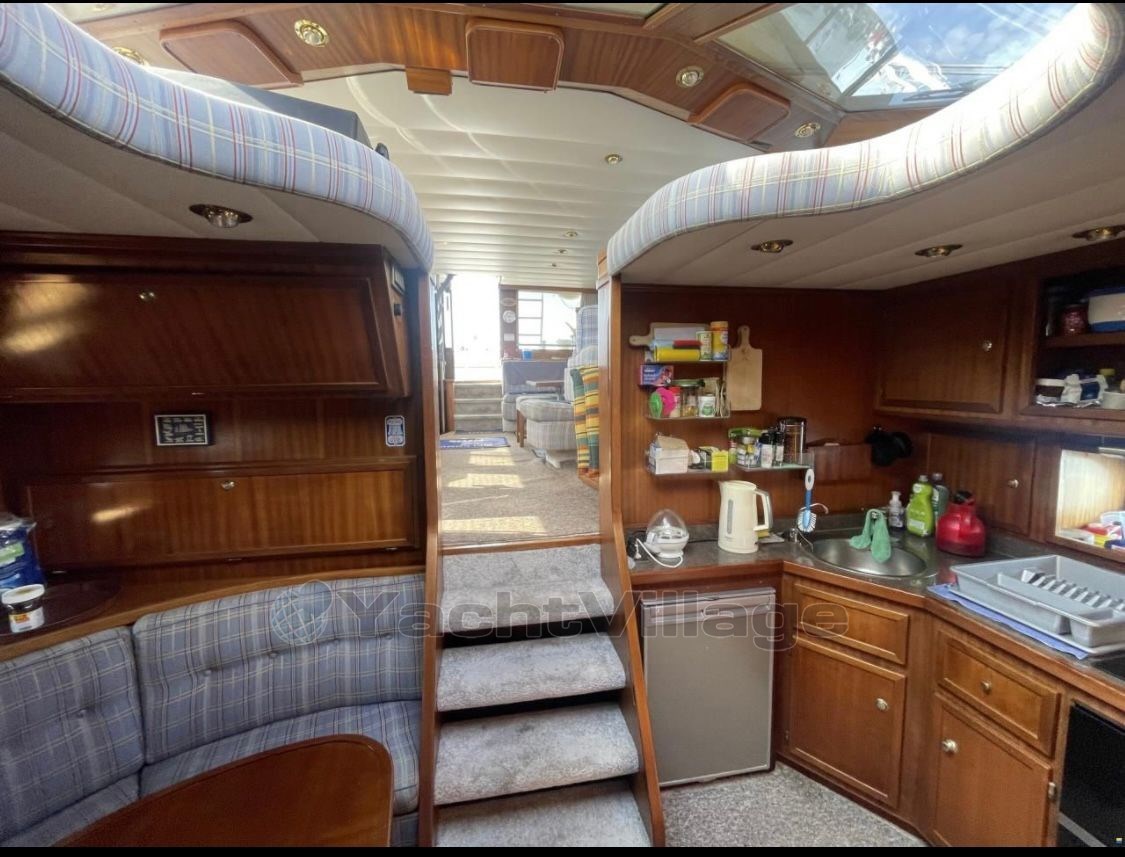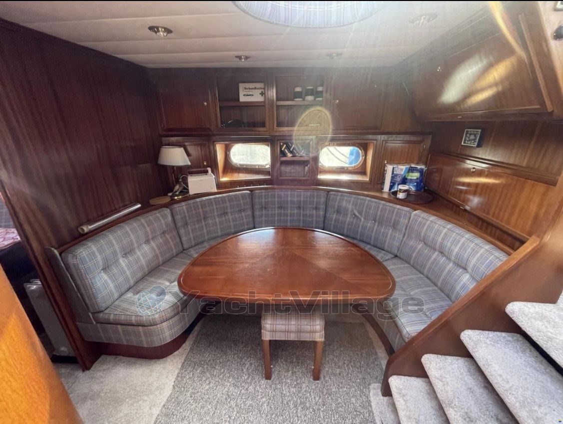 Perfect ship to live on! Equipped with 2 x Iveco diesel engines á 630 hp, approx. 1,800 operating hours, bow and stern thruster, 4 new consumer batteries 2024 and new Mastervolt 1000Ah charger, lying area in the bow renewed incl. cover, new upholstery for the bench seat in the stern with cover, owner's cabin aft with large double bed and two additional single berths, TV with DVD player new, single cabin port, bow cabin with double bed, 2 x bathroom with electr. toilet and shower, dinette lowerable with upholstery, table in saloon also lowerable, teak aft and on the side decks, Eberspaecher diesel heating, electr. Windlass with stainless steel anchor and chain (approx. 40 meters), galley with ceramic hob, microwave and refrigerator, 2nd refrigerator in the saloon, electr. Stern anchor windlass, large hybrid touch chartplotter, gangway, surveillance camera Reolink 360 degrees new, new DAB+ radio vision and 4 speakers on the flybridge, satellite antenna Sinus Premium TWIN LNB, new TV living area, Yamaha dinghy with 15 hp outboard engine and driver's cab (3 operating hours), generator 4 kVA. The berth in the ancora Marina can be taken over.