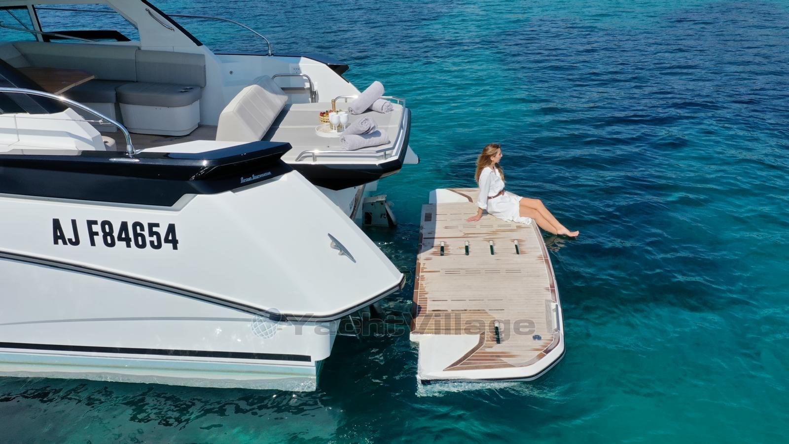 Exterior: The GT 46 captivates with its taut and dynamic lines, signature of the Gran Turismo range. The modular central cockpit offers multiple configurations to accommodate family and friends in the greatest comfort. The vast swimming platform facilitates water access and swimming moments, while the secure walkways allow easy circulation around the boat. Natural teak finishes add a touch of elegance and refinement to the whole.