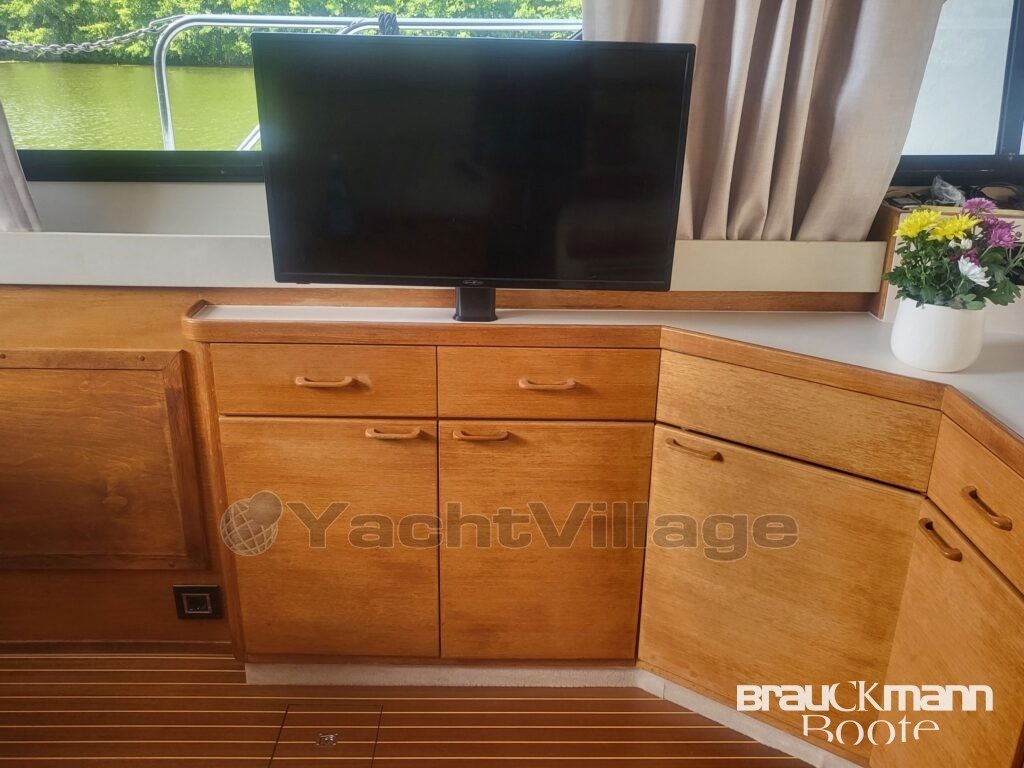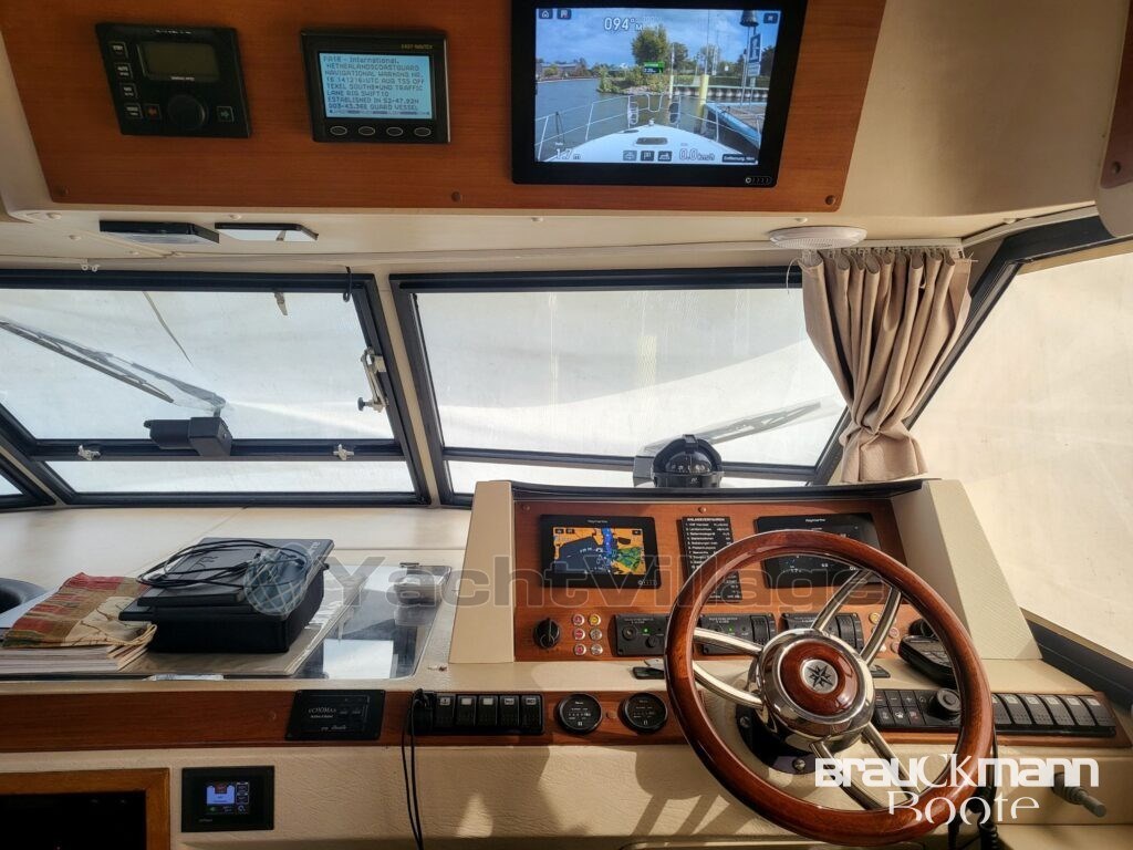 Due to its superstructure with aft cabin and engine room in the midship (under the saloon), the boat is
