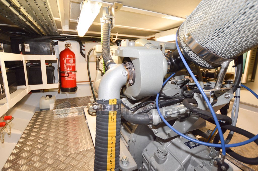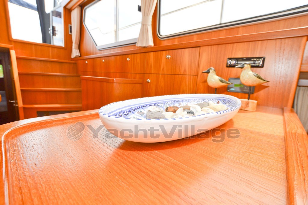 The correct English translation of this text is: Altena 126 Family Due to its exceptionally complete execution, this ship is very suitable for making beautiful long journeys on the beautiful inland waters of Europe! Specifications: General: Hull shape: Chine Deck and superstructure material: Steel Superstructure shape, material: Steel Rudder: V-shaped rudder (for quick maneuvers) Steering: Hydraulic steering Windows: Double glass with aluminum frames Displacement: +/- 15,000 Kg. Normal air draft: +/- 2.45 m to +/- 3.45 m Shipyard: Altena Yachting B.V. - Raamsdonksveer Designer: Altena Yachting B.V. - Raamsdonksveer Other: Given the smart layout of the ship (with storage space created wherever possible), the very luxurious design and the excellent condition of maintenance will mean that a future new owner can enjoy luxury for years to come! Accommodation: Material, colors: Teak interior and teak floors Curtains: Cream colored curtains Living spaces: 2 spacious cabins, a large salon, dinette, galley, toilet and separate shower Cabins: Large French bed in the aft cabin, a spacious bed in the forward cabin, alternatively also a sleeping place on the sofa in the salon Beds: 3 + 1 Toilets: 1 electric toilet Shower, bath: 1 Bath: 2 (separate shower - toilet) Radio/CD player: JVC brand radio TV: Flatscreen TV with lift in the salon Cooker & fuel: Electric ceramic 4 ring Siemens brand Microwave: Siemens brand microwave Refrigerator & power supply: Galley refrigerator 12V - 24V Freezer: - Heating: The ship is equipped with full floor heating through Kabola tap Air conditioning: MAR-IX air conditioning in the aft cabin with electrically operated valve Other: In addition to the smart layout, this ship has a very spacious aft deck, wide gangways and a semi-circular staircase to the bathing platform Motor, Electronics & Water: Power: 1 x 140 Hp Brand: Vetus Deutz DTA44 Number of identical engines: 1 Year: 2012 Running hours: +/- 2,100 Fuel: Diesel Fuel tank quantity: +/- 1,490 L Cooling: Via internal cooling and via seawater Propulsion: Via a 4-blade propeller Cruising speed: +/- 7 Kn Max speed: +/- 8 Kn Instruments: Various present at the helm Bow thruster: Vetus 95 Kgf. with remote control Stern thruster: Vetus 75 Kgf. with remote control Voltage: 220V - 24V - 12V Control panel: Present in the salon Battery: 4 x onboard network - 1 x start - 1 x bow- stern thruster - 1 x generator Battery charger: Mastervolt Mass Kombi charger-inverter 2500W-60A-24V Generator: Whisper Power M-SQ6 6 KVA Alternator: Present on main engine Inverter: Mastervolt Mass Kombi charger-inverter 2500W-60A-24V Water system: Hydrophore Hot water: Via Kabola tap Water tank & material: 1 x 370 L and 1 x 220 L (Polyethylene and polyester) Wastewater tank & material: 1 x 160 L steel Shore power: 220V with cable Voltmeter: Present Vetus brand Tachometer: Present Vetus brand Water tank gauge: Present Vetus brand Fuel tank gauge: Present Vetus brand Oil pressure gauge: Present Vetus brand Temperature gauge: Present Vetus brand Other: Standard cable engine control, steering chair, flexible coupling, extra exhaust silencer for engine, 3 electrically operated wipers, electric engine room ventilation, separation transformer, water-lubricated propeller shaft, halogen lighting, 220V socket Navigation & Electronics: Navigation lights: Present Compass: Raymarine Fluxgate compass (digital Evolution EV-400 power system). Very accurate! Rudder indicator: Raymarine ST60+ Log/speed: Raymarine ST60+ Tridata Depth sounder: Raymarine ST60+ Tridata Autopilot: Raymarine with Smart Controler GPS: Raymarine via chartplotter Chartplotter: Raymarine E120W Charts, guides: On request Other: All imaginable modern navigation equipment is present which are very helpful for making beautiful long trips Equipment: Anchors & materials: Present Anchor winch: Manual Fenders, lines: Present Bimini: Present with blue cover over aft deck Swim ladder: Fixed swim ladder Swim platform: Present with teak Railing: