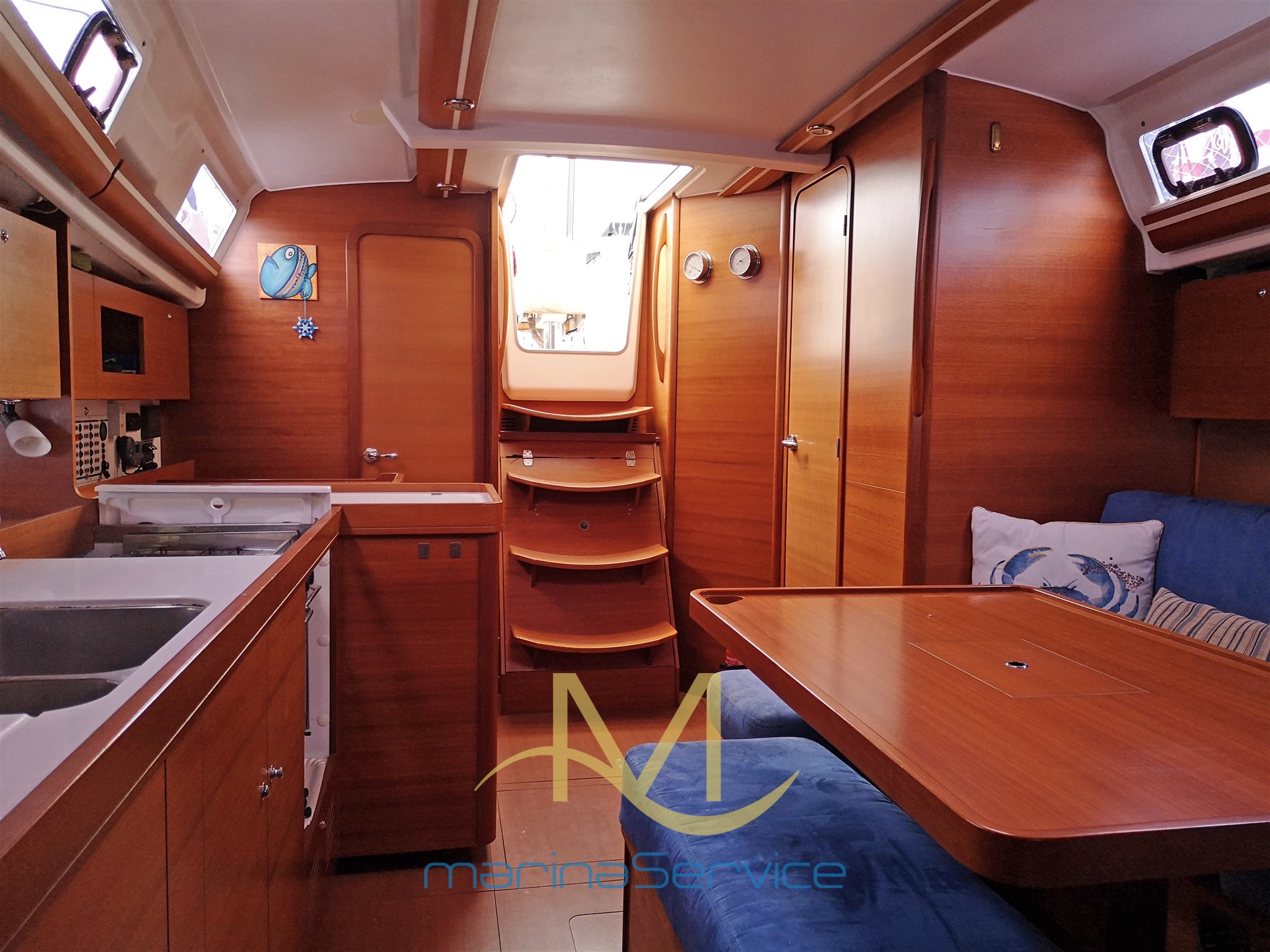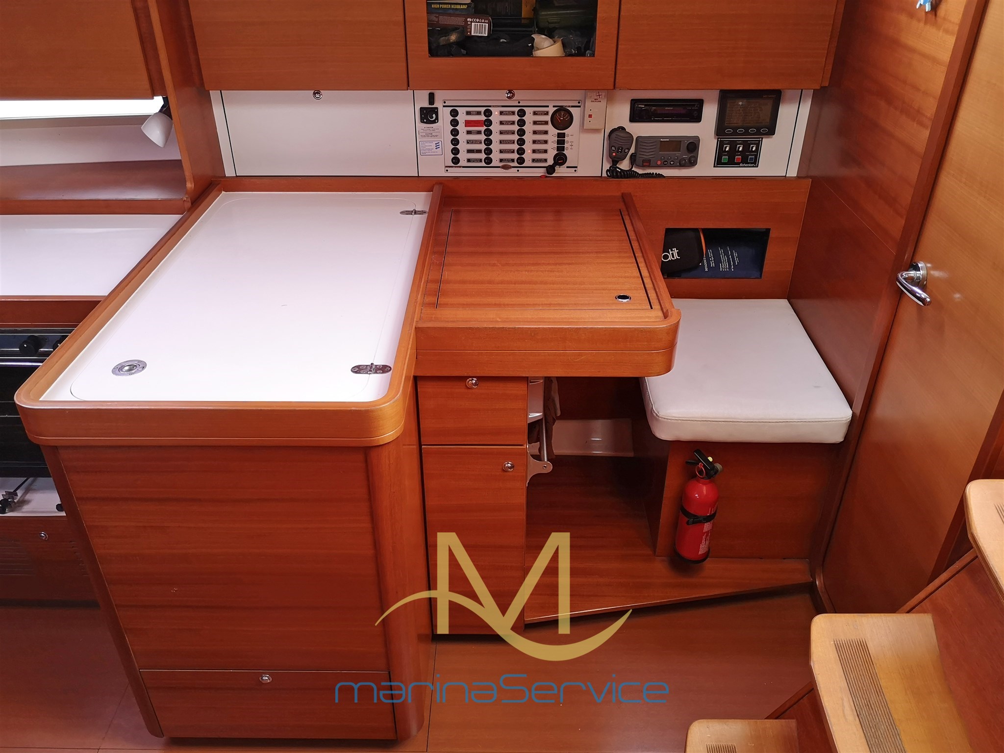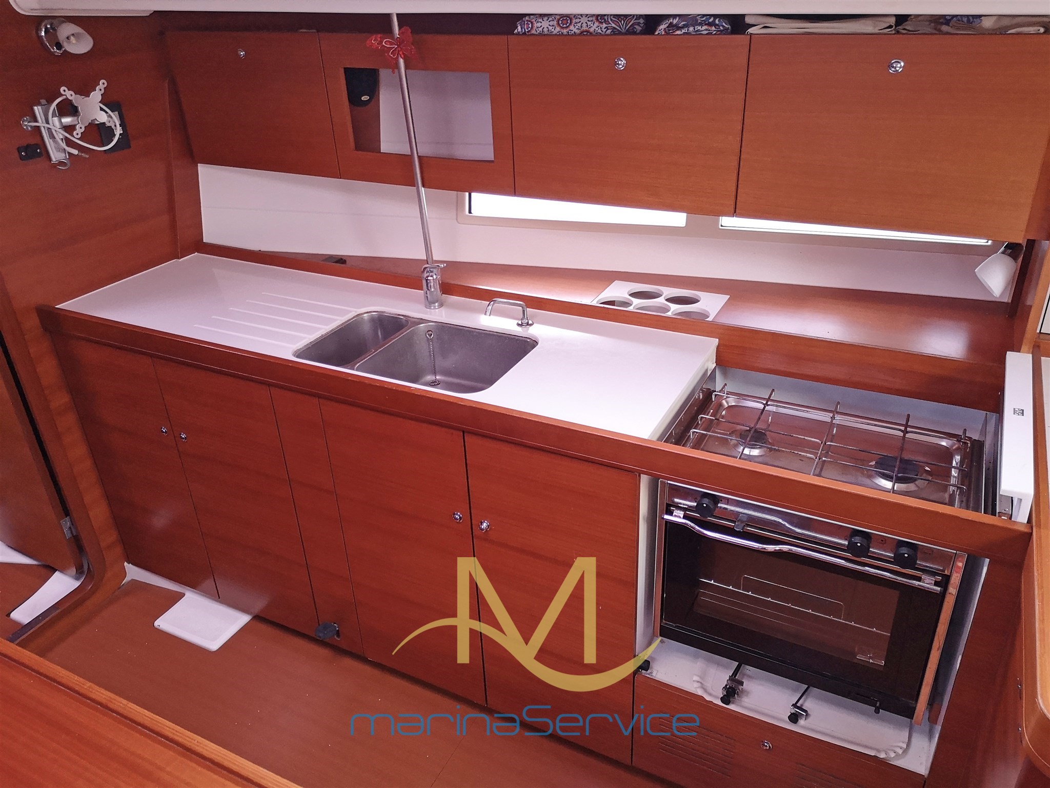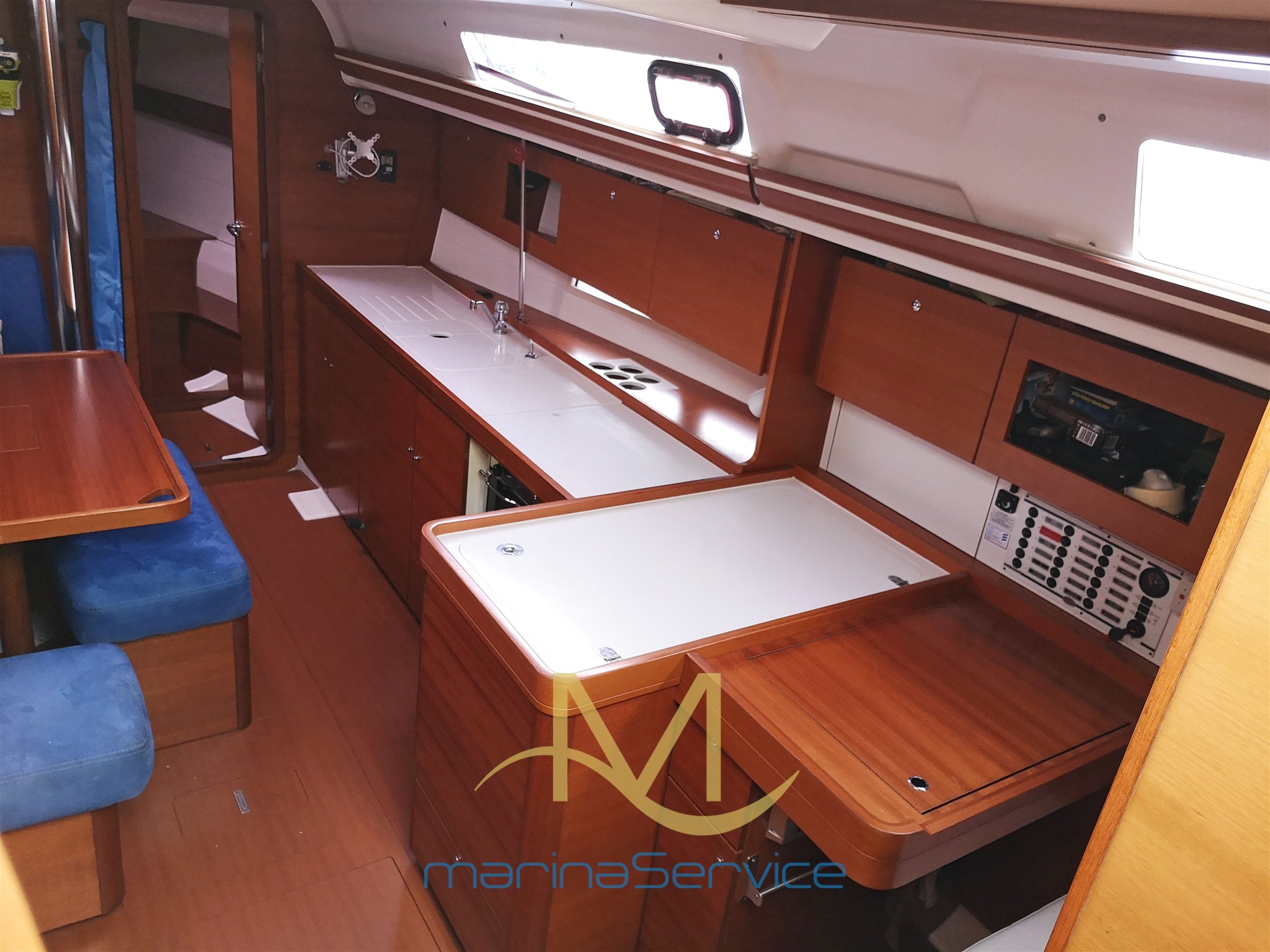 Камбуз с правого борта с двойным раковином и насосом морской воды, плитой с двумя конфорками, большим холодильником в кабине и наклонной духовкой