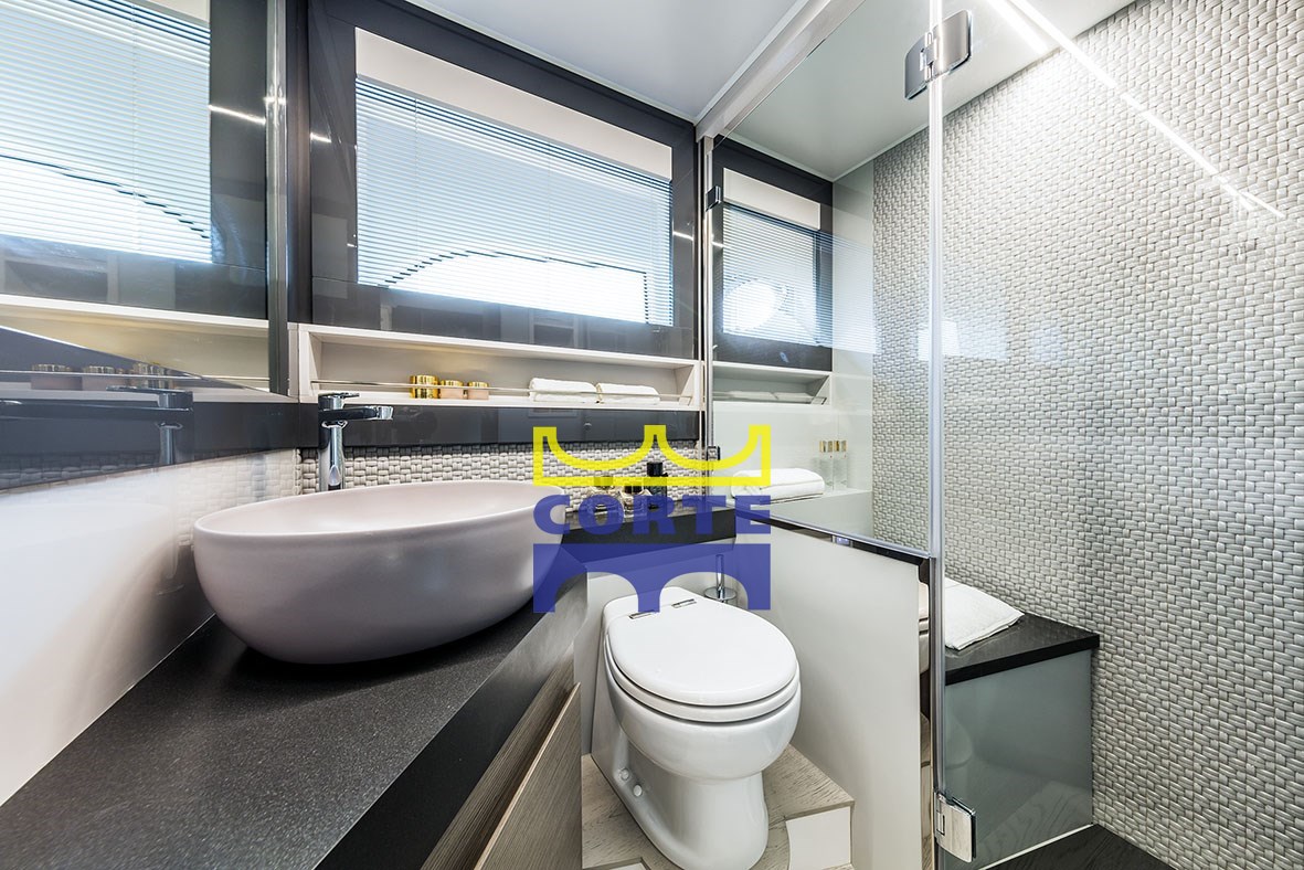 Апартаменты владельца во всю ширину яхты с ванной комнатой с отдельным душем.