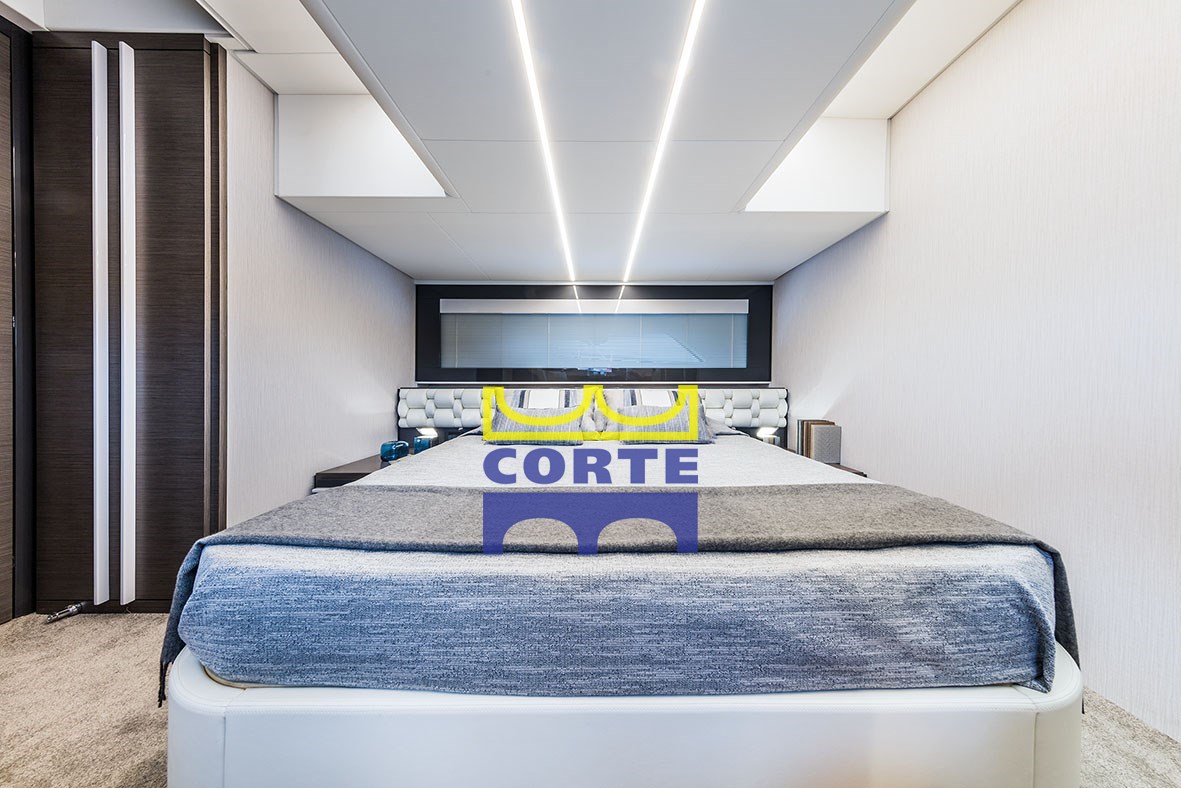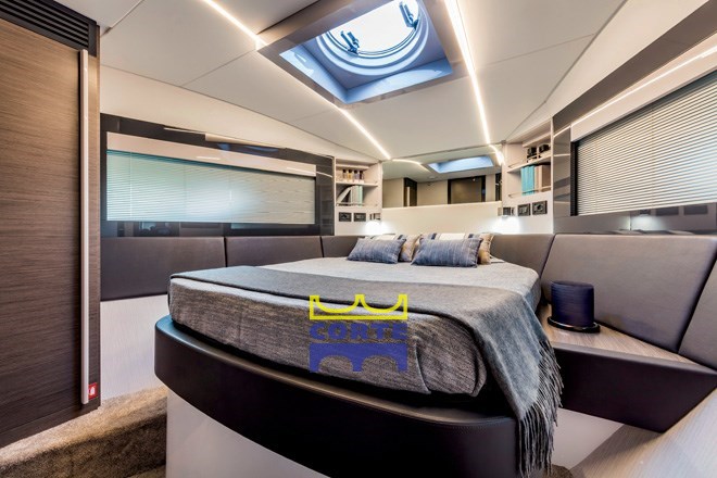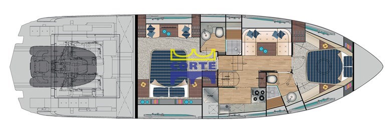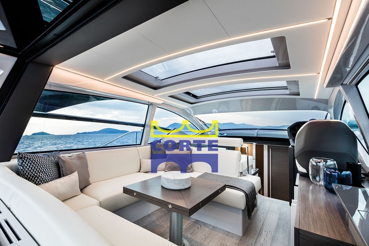 Кокпит оборудован большой палубой для загара и вторым диваном. Зона может быть отделена или соединена с салоном благодаря специальной системе открывания и закрывания стеклянной двери и стеклянной поверхности, которая разделяет эти две зоны.