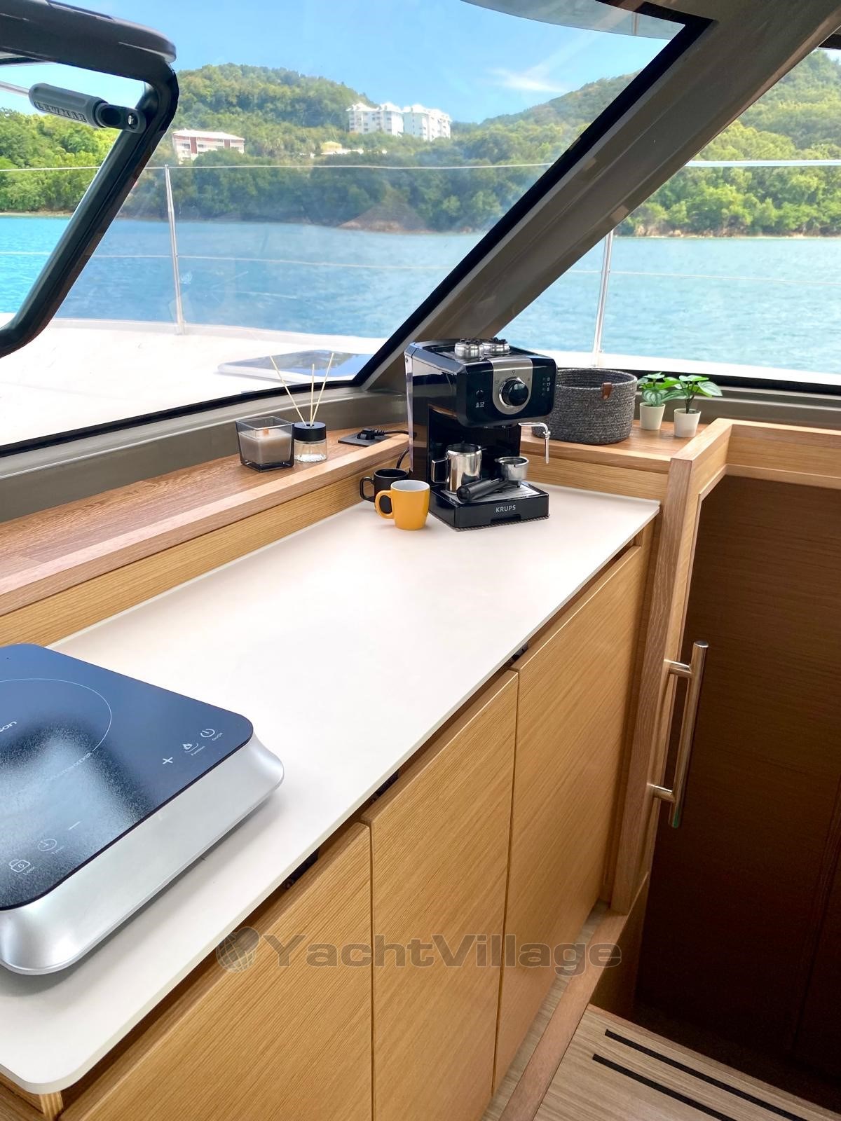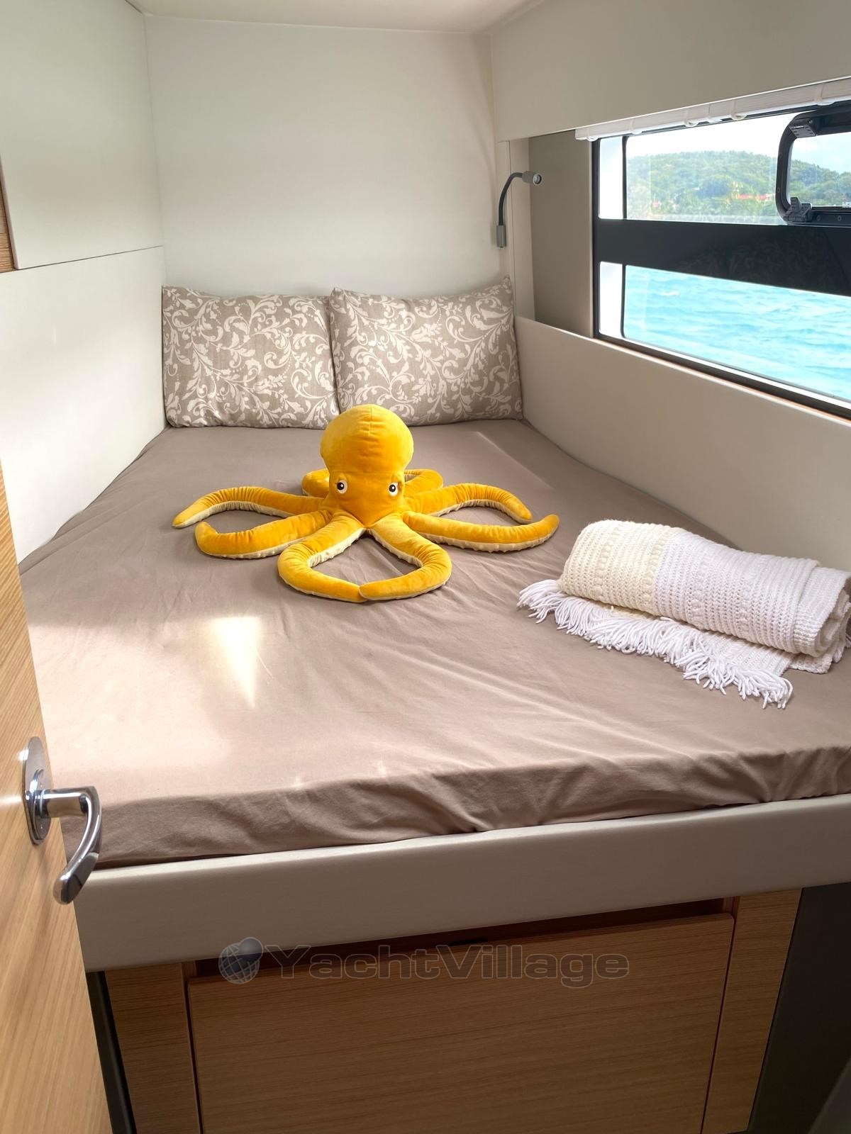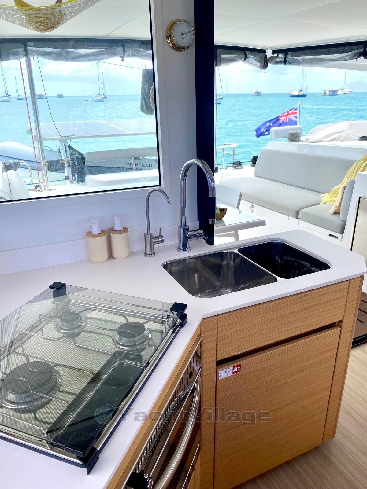 With its 3 cabins and 2 bathrooms, "La Luna" offers remarkable comfort. Each cabin is equipped with memory foam mattresses, top-of-the-range pillows, USB and 230V sockets, and full textile equipment. The kitchen is worthy of a home: induction hob, gas stove, oven, Krups espresso machine, food processor, complete crockery, and 6.5 kg washing machine.