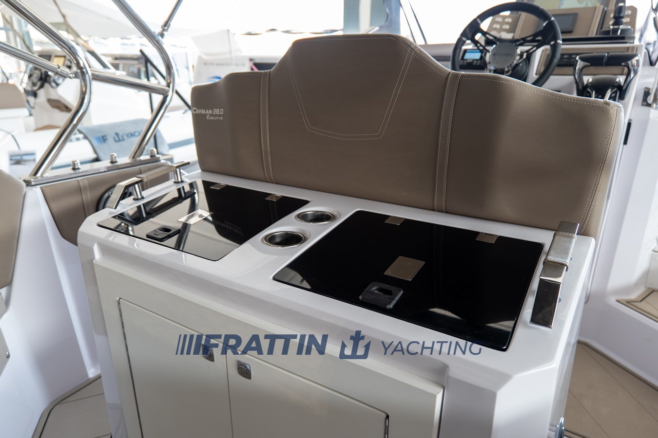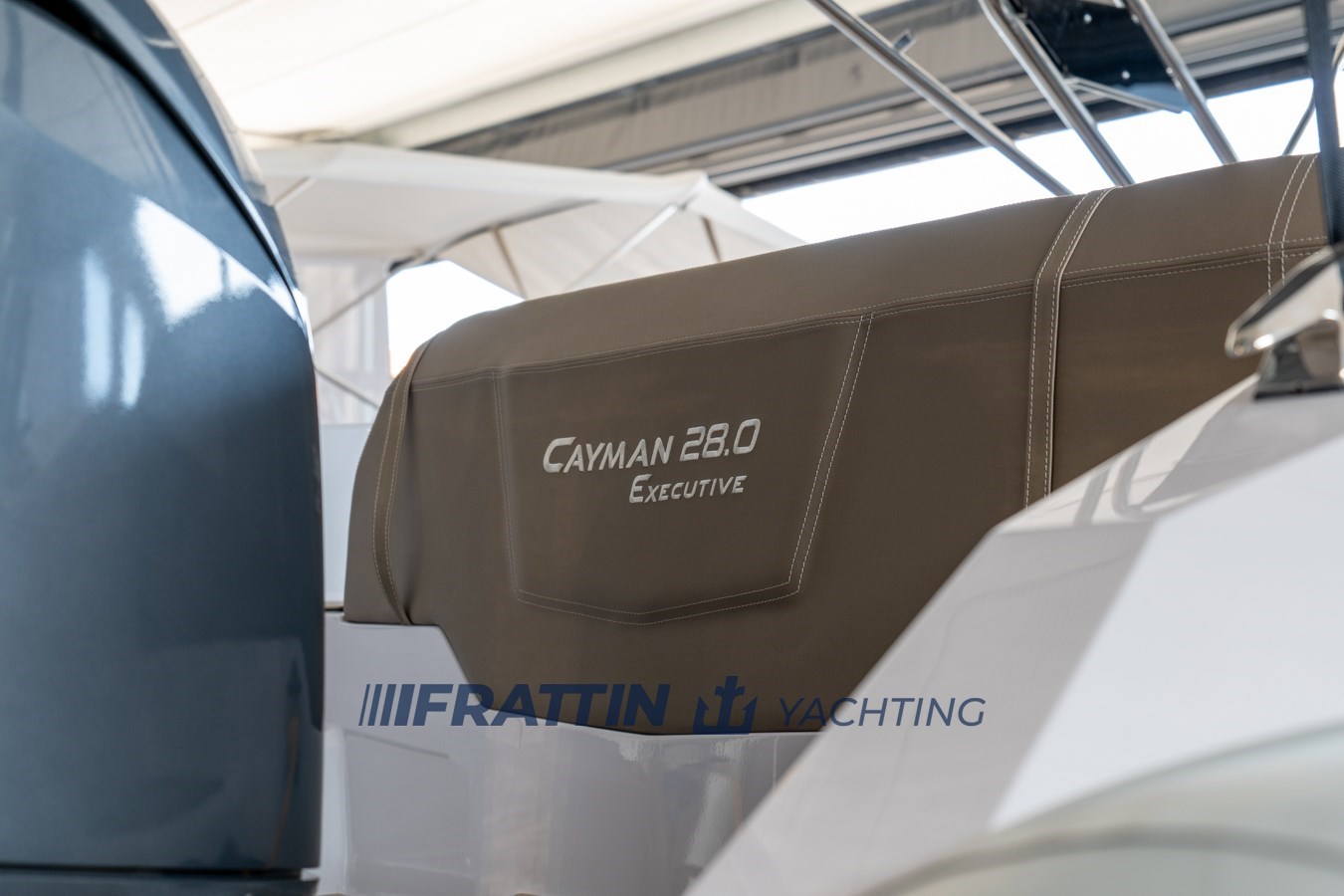 Die Cayman 28.0 Executive Verkleidung wurde mit dem H.I.S.-System der zweiten Generation ausgestattet. Die Montage des Rumpfes mit dem Deck erfolgt mit dem C.S.A.-System (Cockpit Shock Absorber), und die Motorisierung erfolgt in einer ein- oder zweimotorigen Außenbordversion.